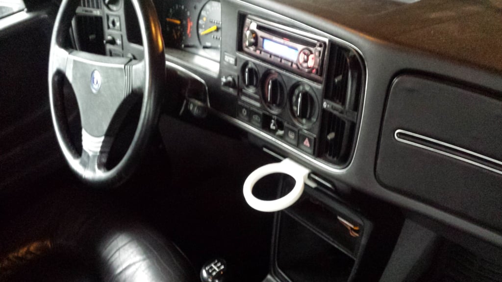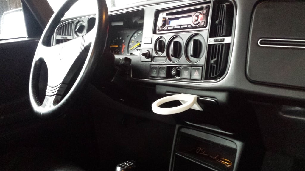 Tässä on mukiteline klassiselle SAAB 900:lle. Mukiteline napsautetaan tuhkakuppiin ja siihen mahtuu useimmat juoma-astiat. Sen pitäisi toimia kaikissa C900-malleissa vuodesta 1978 vuoteen 1993.