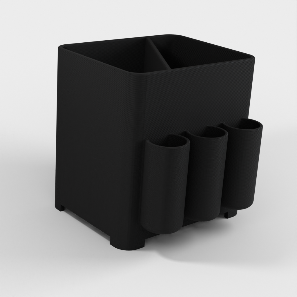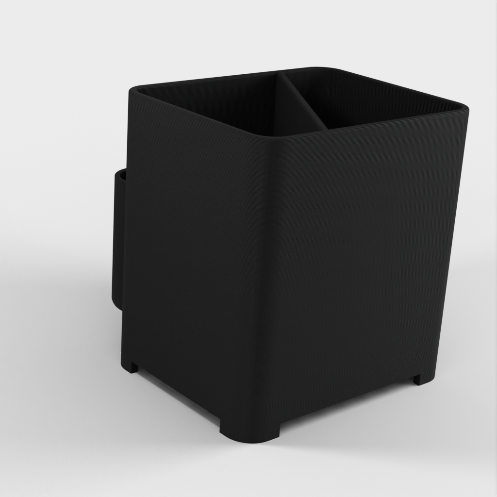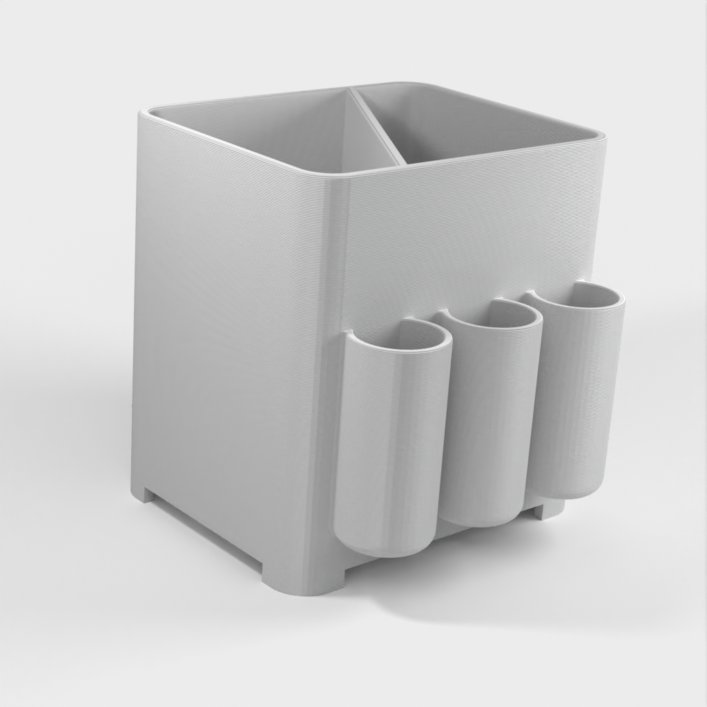 Yksinkertainen hammasharjateline hammasharjan, hammastahnan ja partakoneen terien säilytykseen. Pidike pitää hygieniatarvikkeet järjestyksessä ja helposti saatavilla.