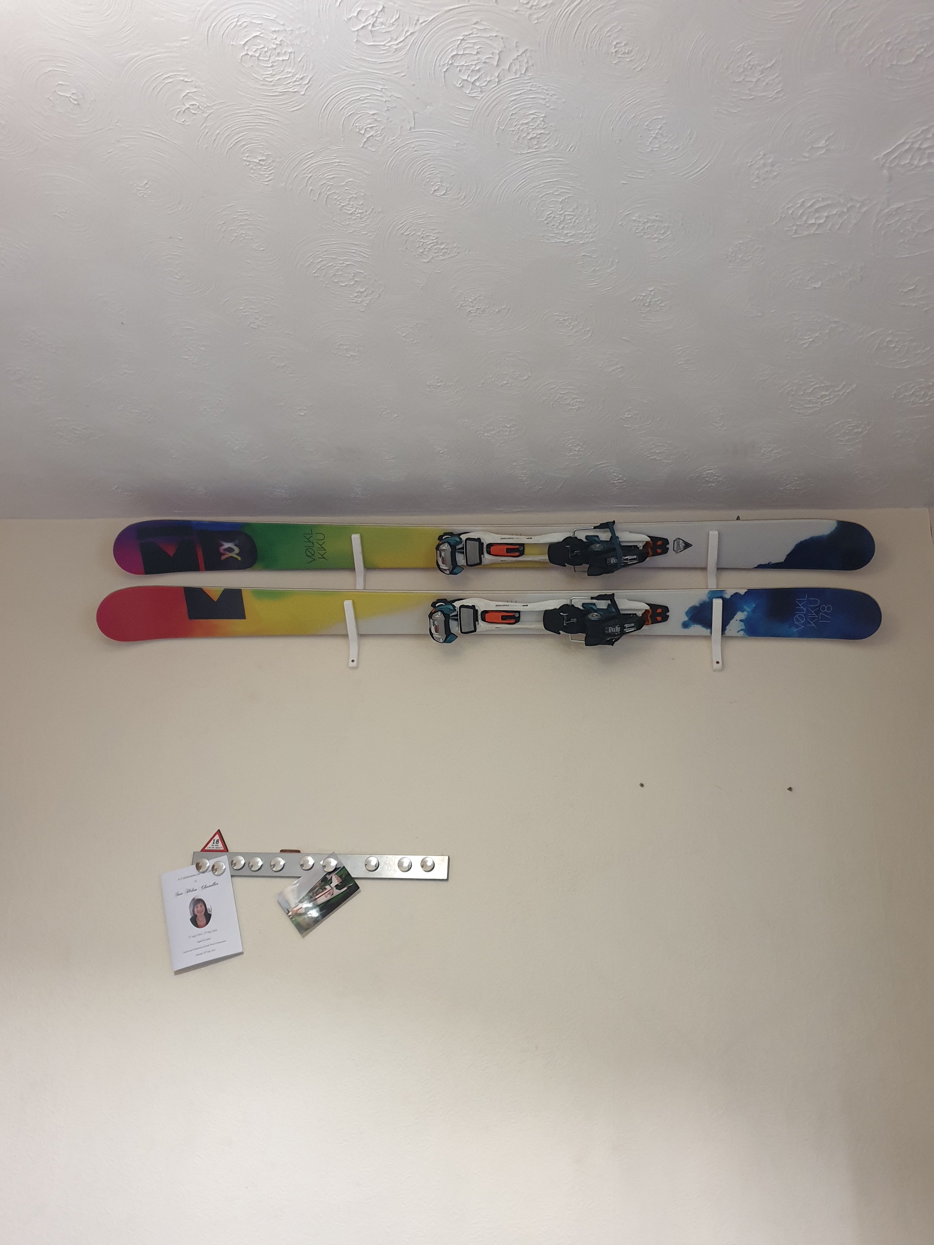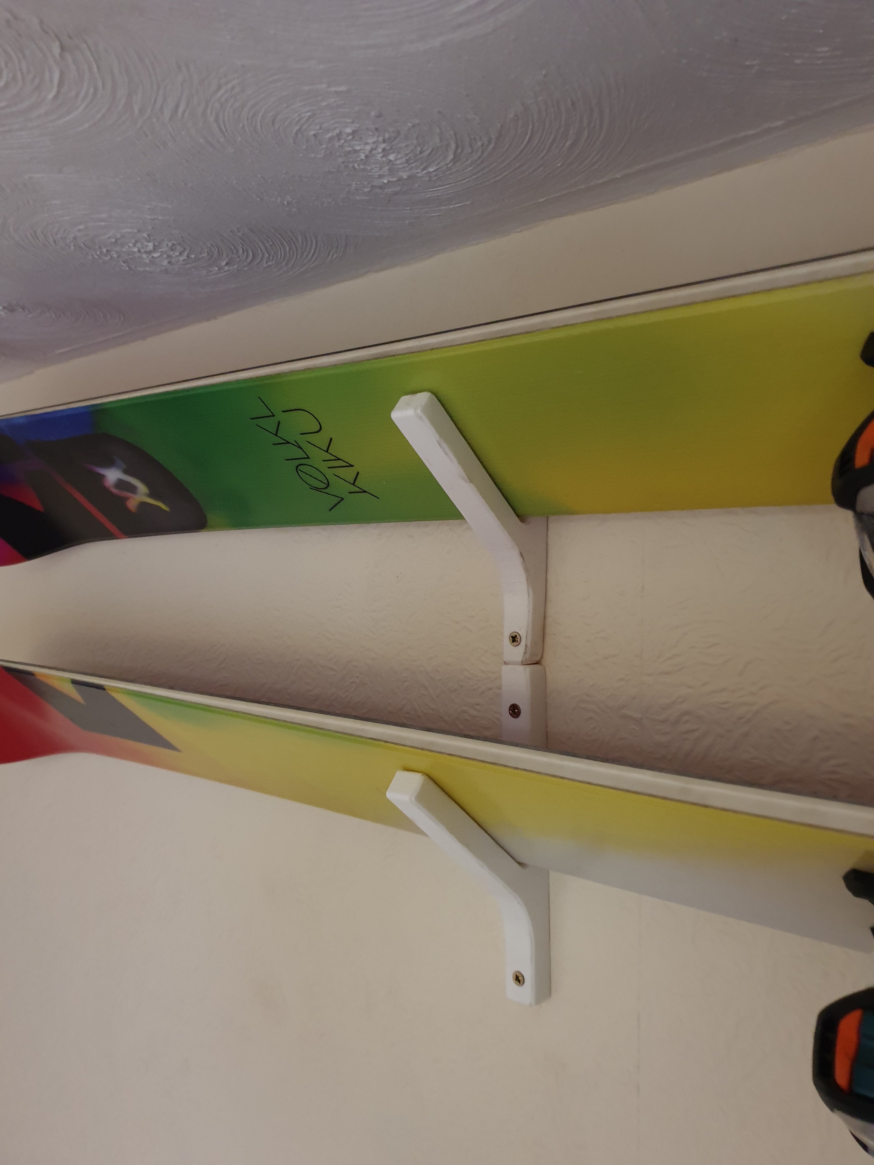 Tämä on kulmikas suksien seinäkiinnike, joka on suunniteltu säilyttämään ja esittelemään suksiasi tyylikkäästi. Kiinnike mahdollistaa suksen päällilevyn näkymisen, ja se on helppo irrottaa tarvittaessa. Se vaatii kaksi ruuvia ja kaksi raakatulppaa kiinnitettäväksi tiiliseinään tai vain puuruuveja, jos se asennetaan kipsilevyyn. Jokainen kiinnike voi pitää yhden suksiparin, joten tarvitset yhteensä 2 kiinnikettä ripustaaksesi suksiparin.