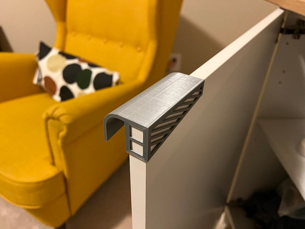 Tämä tuote on kaapin kahva, joka on suunniteltu sopimaan 16,4 mm paksuisiin Ikea KNOXHULT -kaapinoviin. Kahvat eivät vaadi porausta tai reikiä, koska ne on suunniteltu sopimaan tiukasti kaapin oveen kitkan avulla. Jos haluat tiukemman istuvuuden, voit käyttää kaksipuolista teippiä tai asettaa paksua paperia. Voit "vaihtaa" sivua ja käyttää niitä pystysuunnassa vaakasuoran sijaan.