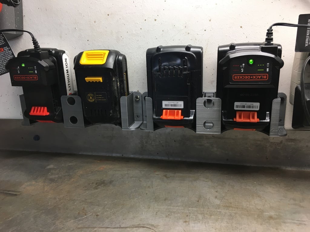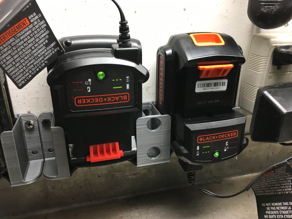 Yksittäiset tai kaksinkertaiset akkupidikkeet pitävät Black & Deckerin (ja jälkimarkkinoiden) akkuja, kun käytetään mukana tulevaa laturin kiinnikettä. Akut voidaan kiinnittää ylös- tai alaspäin.