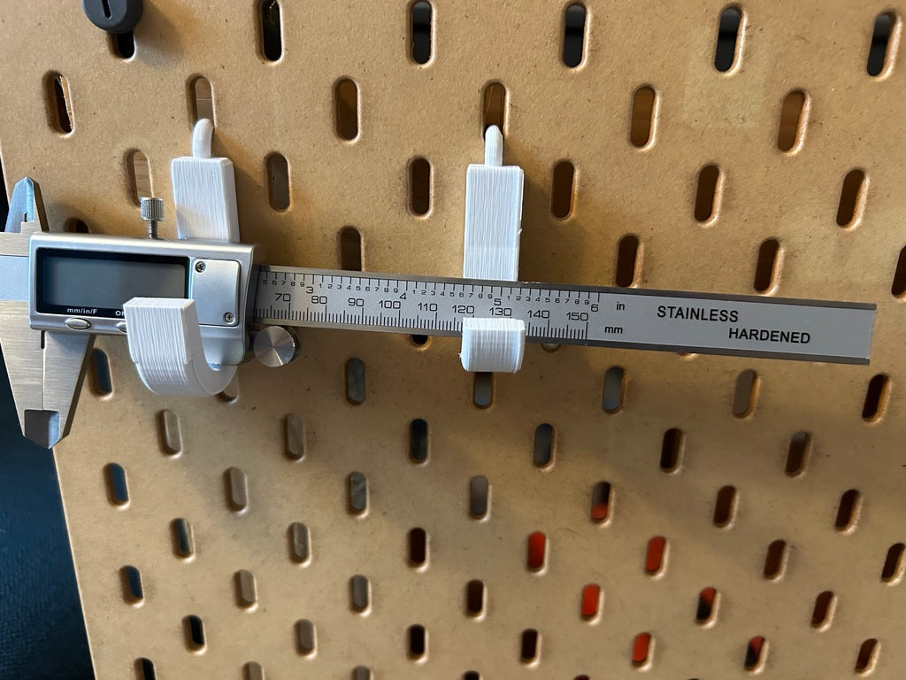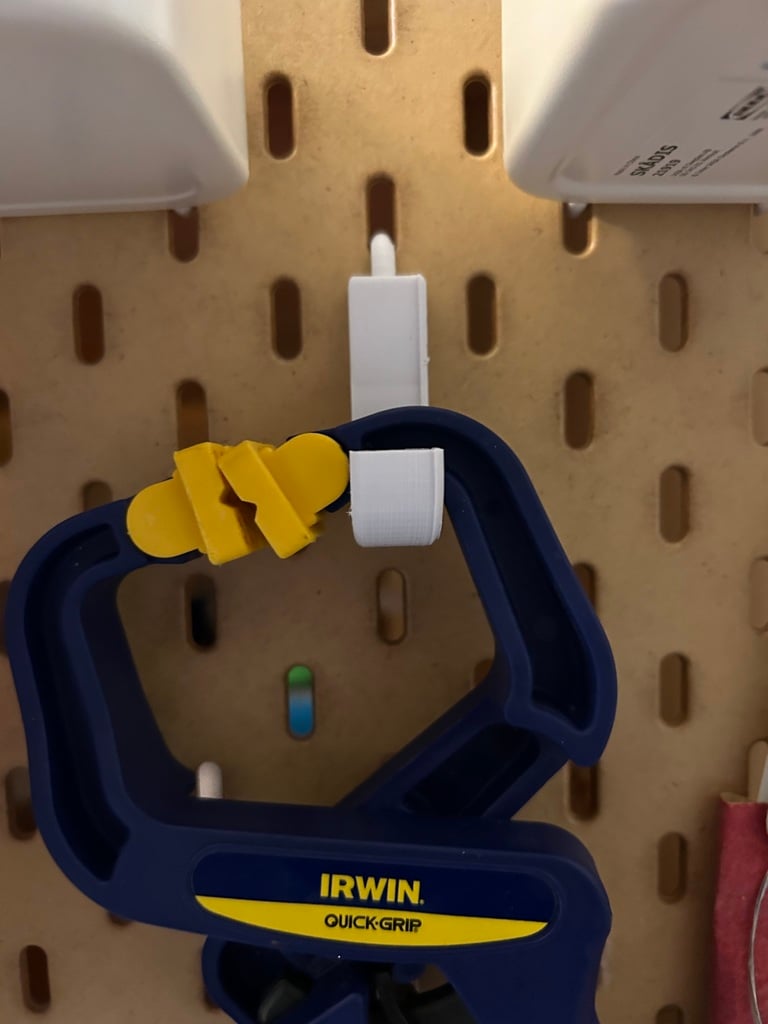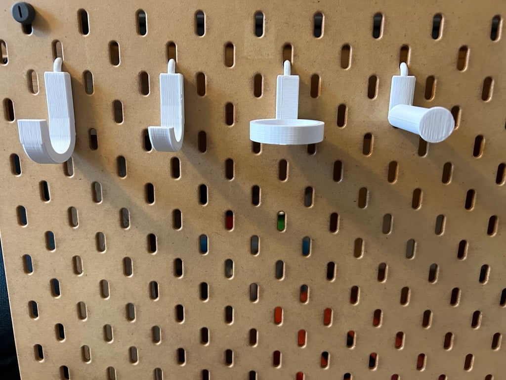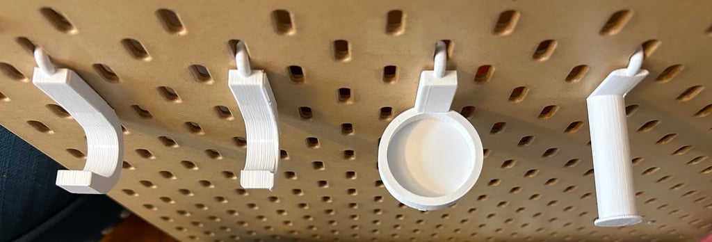 Tämä on kokoelma erityisesti IKEA SKÅDIS -nastalevyyn suunniteltuja tappeja. Jokainen tappi on suunniteltu sopimaan eri työkaluille ja esineille, joilla on eri mitat. Tapeissa on pidempi koukku leveämmille esineille, kelalle tai teippirullalle tarkoitettu pidike ja erityinen pyöreä koukku, jota voi käyttää kuumailmapuhaltimen ripustamiseen. Lisäksi koukun pohja on saatavana myös erikseen, ja se voidaan räätälöidä juuri sinun tarpeisiisi sopivaksi. Jokainen koukku ja pidike on suunniteltu sopimaan täydellisesti IKEA SKÅDIS -naulalevyn reikiin, jotka ovat noin 6 mm:n kokoisia ja 34 mm:n välein.