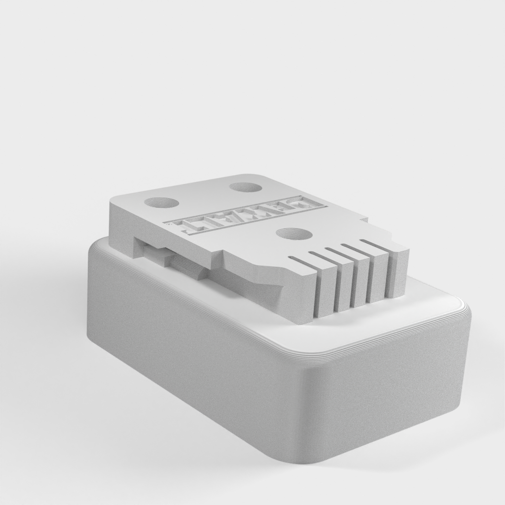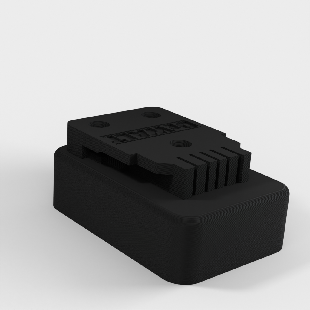 Tämä on yksinkertainen DeWalt-työkaluteline porakoneille/iskukoneille ripustettavaksi hyllyn tai pöytälevyn alle, ja siinä on riittävästi tilaa normaalisti porakoneisiin/iskukoneisiin jne. asennettavan koukun sijoittamiseen.