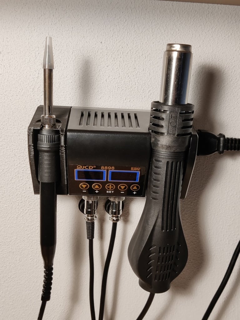 Pidike JCD 8898 -juotoskolville SMD-työasemasta. Se napsahtaa aseman pohjaan ja sopii hyvin aseman sivulle. Juotoskolvi sopii hyvin uraan eikä putoa.