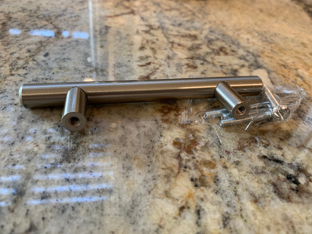 Käyttäjän vinkki: Poraa varovasti ensimmäinen ruuvinreikä ja pidä malli paikallaan asettamalla ruuvi mallin läpi ja reikään. Käytä kiinteitä kahvoja onttojen kahvojen sijasta parempien tulosten saavuttamiseksi. Käyttämäni kiinteät kahvat ostin Amazonista.