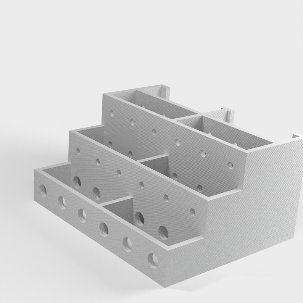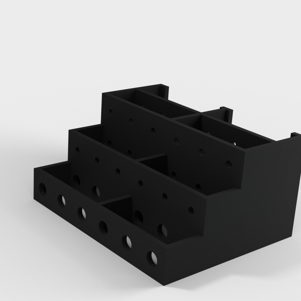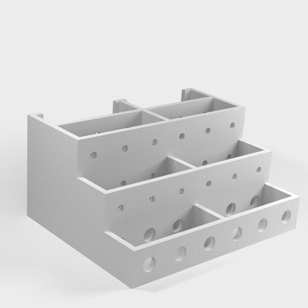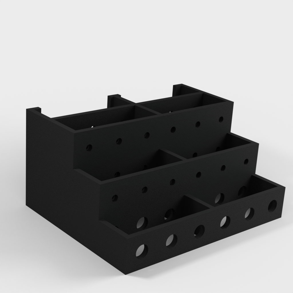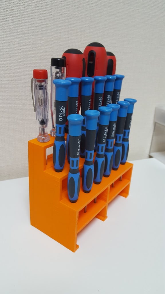 Tämän ruuvimeisselipidikkeen avulla saat helposti ja kätevästi ruuvimeisselisi hallintaan. Pidikkeeseen mahtuu 3 sarjaa 6 ruuvimeisseliä, joten sinulla on aina järjestetty yleiskatsaus työkaluihisi. Jokaisella ruuvimeisselillä on oma paikkansa, kolmella tasolla lyhyille, keskipitkille ja pitkille ruuvimeisseleille. Seinäasennusversion saat tästä mallista: https://www.thingiverse.com/thing:1240992