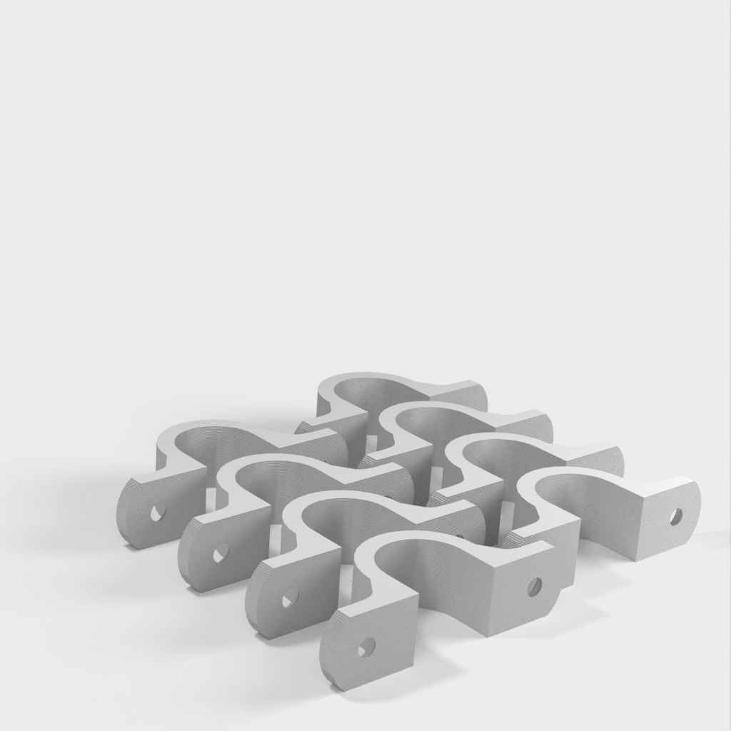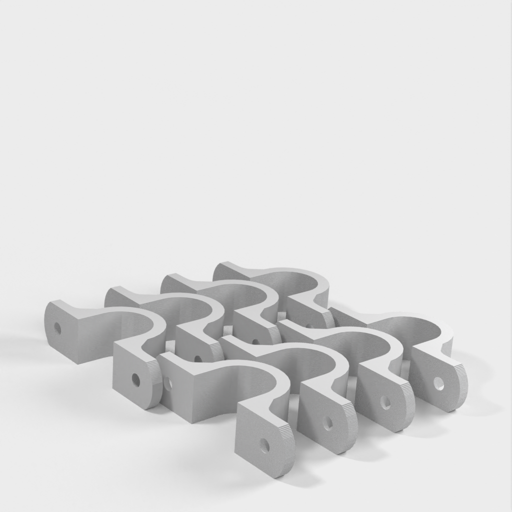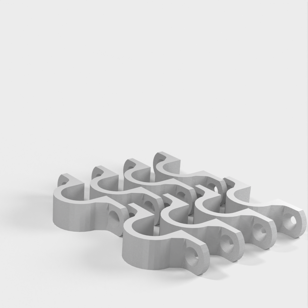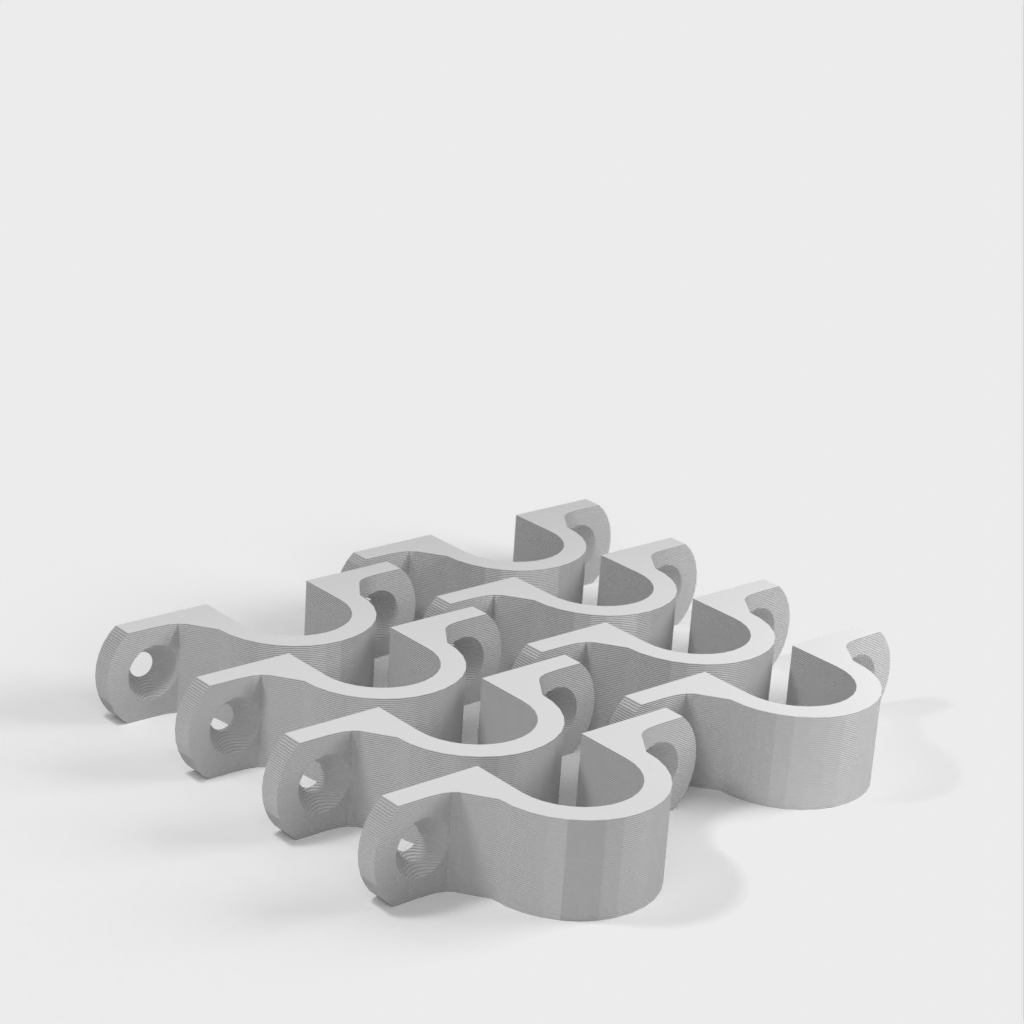 Tämä on kaapeliklipsi, joka on suunniteltu pitämään kaapelit siistinä ja järjestyksessä, kun ne roikkuvat työpajasi katosta. Kiinnike on vahvistettu 90 asteen mutkan kohdalta lisävahvuuden saamiseksi. Kiinnitysreiät on suunniteltu tavallisille kipsilevyruuveille ja ne on upotettu.