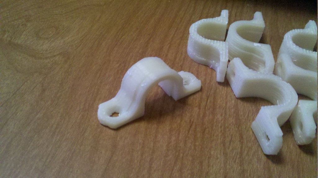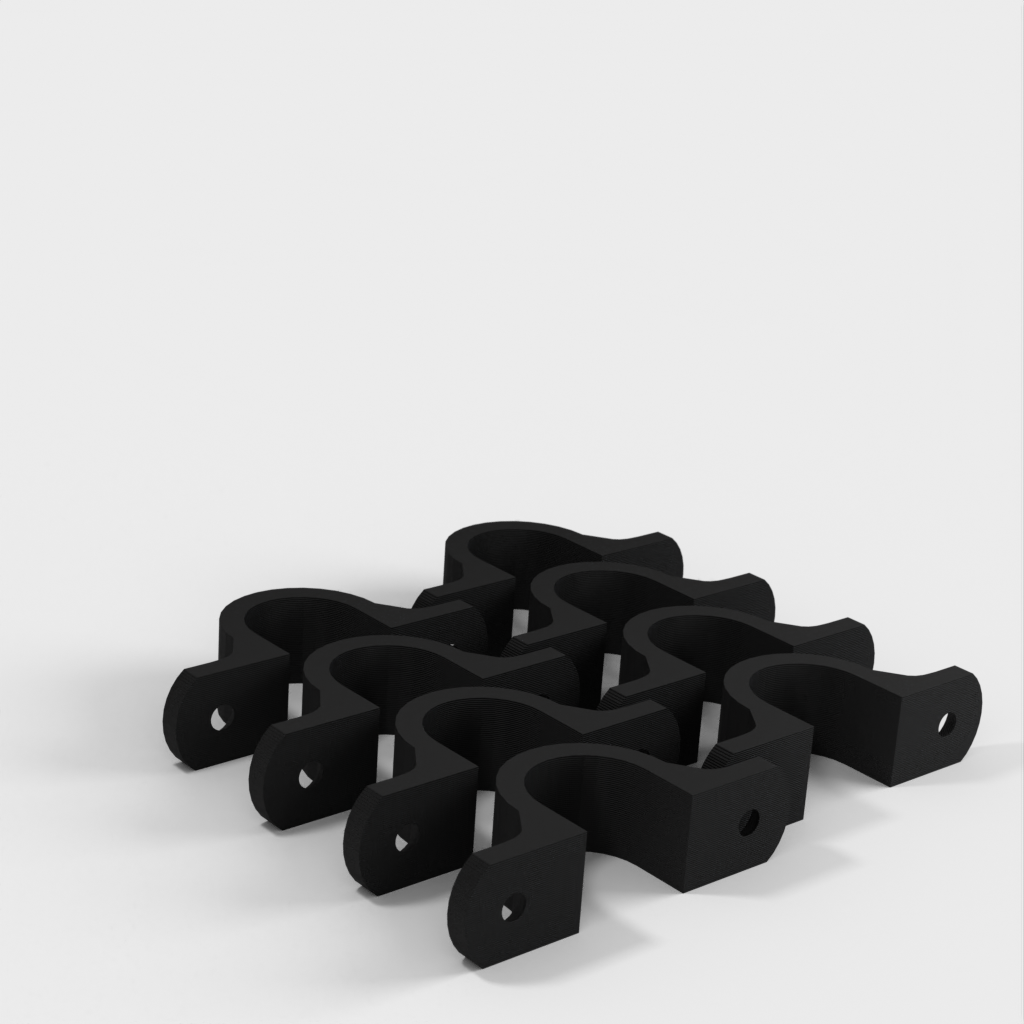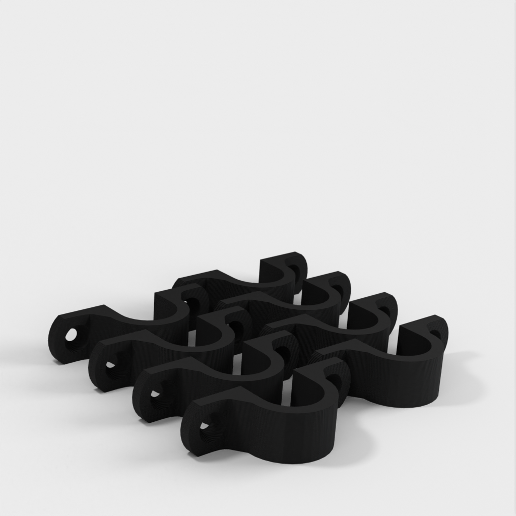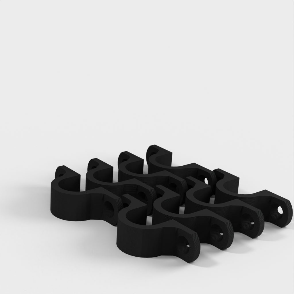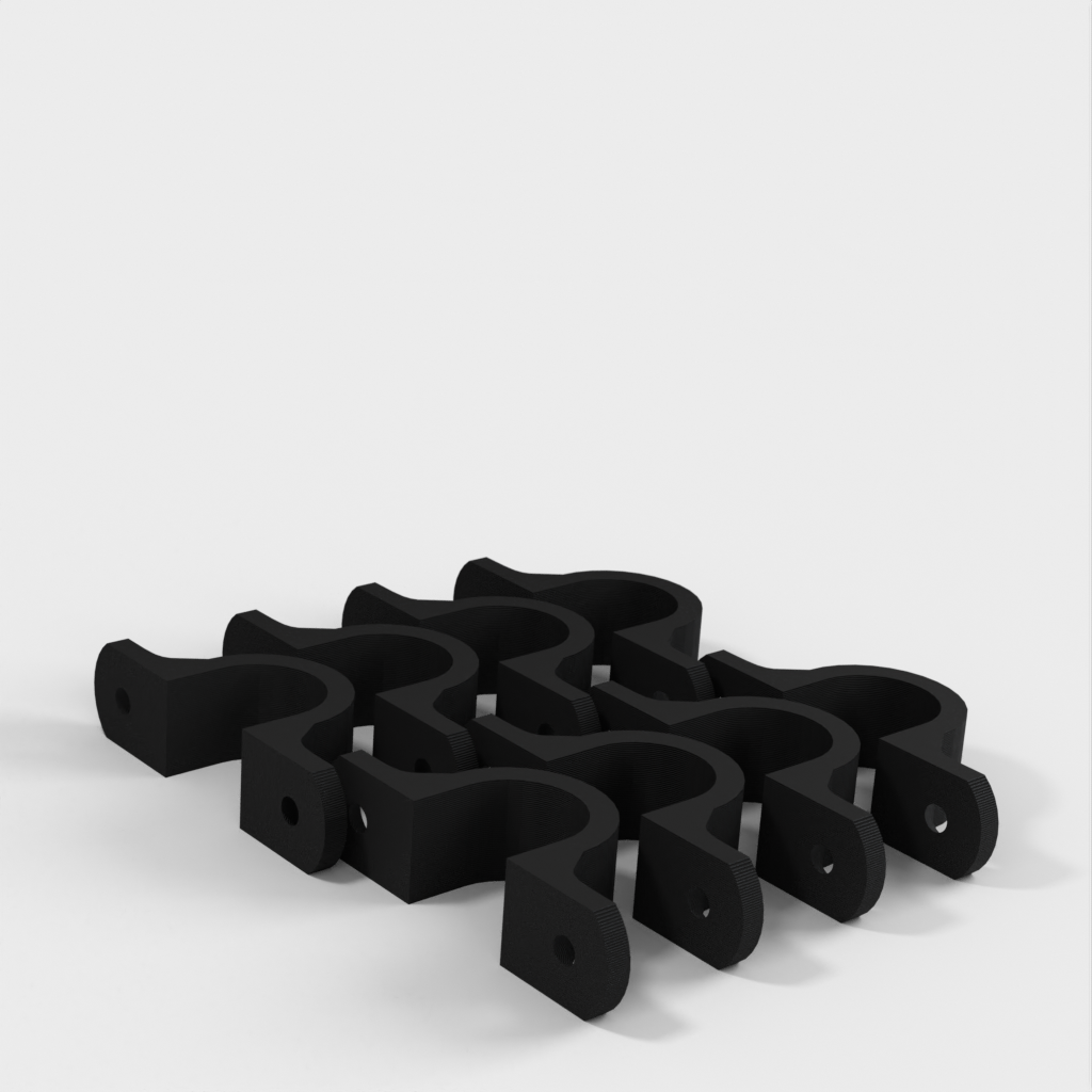 Tämä on kaapeliklipsi, joka on suunniteltu pitämään kaapelit siistinä ja järjestyksessä, kun ne roikkuvat työpajasi katosta. Kiinnike on vahvistettu 90 asteen mutkan kohdalta lisävahvuuden saamiseksi. Kiinnitysreiät on suunniteltu tavallisille kipsilevyruuveille ja ne on upotettu.
