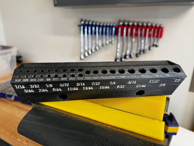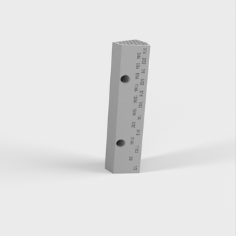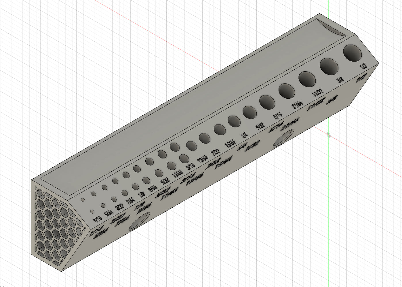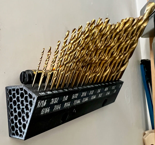 Tämä on kompakti, seinään kiinnitettävä poranteränpidin, joka sopii poranterille, joiden koko on 1/16' - 1/2' 1/64':n askelin. Pidikkeen pituus on 8', ja se pitää bitit 30º kulmassa, jotta niihin pääsee nopeasti ja helposti käsiksi. Pienempiä bittien kokoja (1/16' - 3/16') varten on kaksi paikkaa, jotta voit pitää varapuristinta lähellä, jos yksi bitti rikkoutuu. Bittien takana on syvennetty lokero, jossa voit säilyttää kyniä, lyijykyniä tai jopa projektin aikana käyttämiäsi ylimääräisiä bittejä.