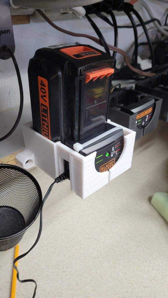 Yksinkertainen ja tyylikäs seinäkiinnike Black & Decker 40V -akulle ja -laturille. Se sopii helposti mihin tahansa työpajaan, ja laturi sopii täydellisesti pidikkeeseen, jolloin akku on käyttövalmis.