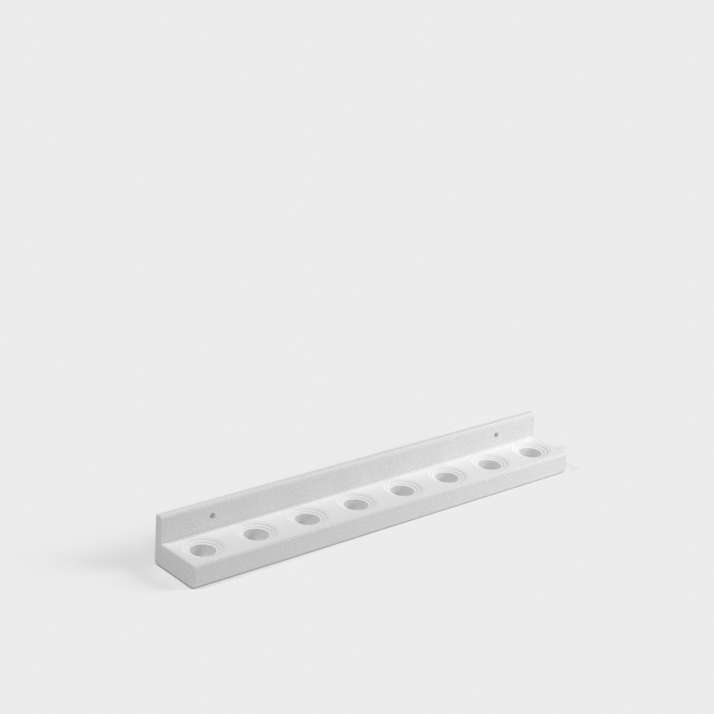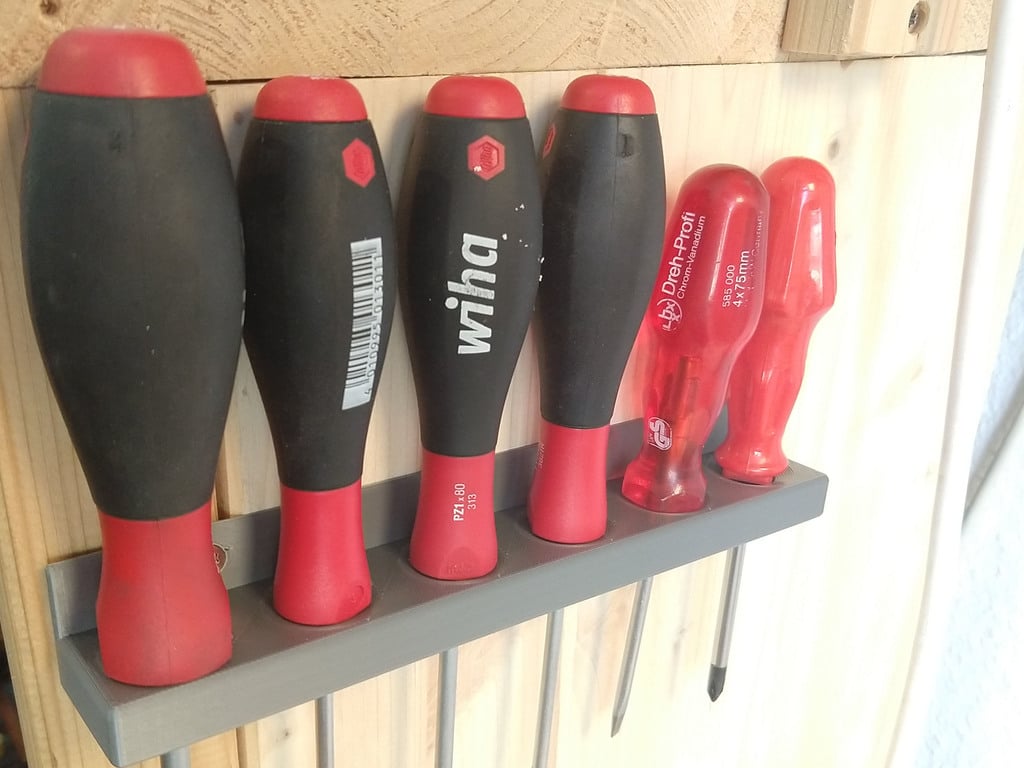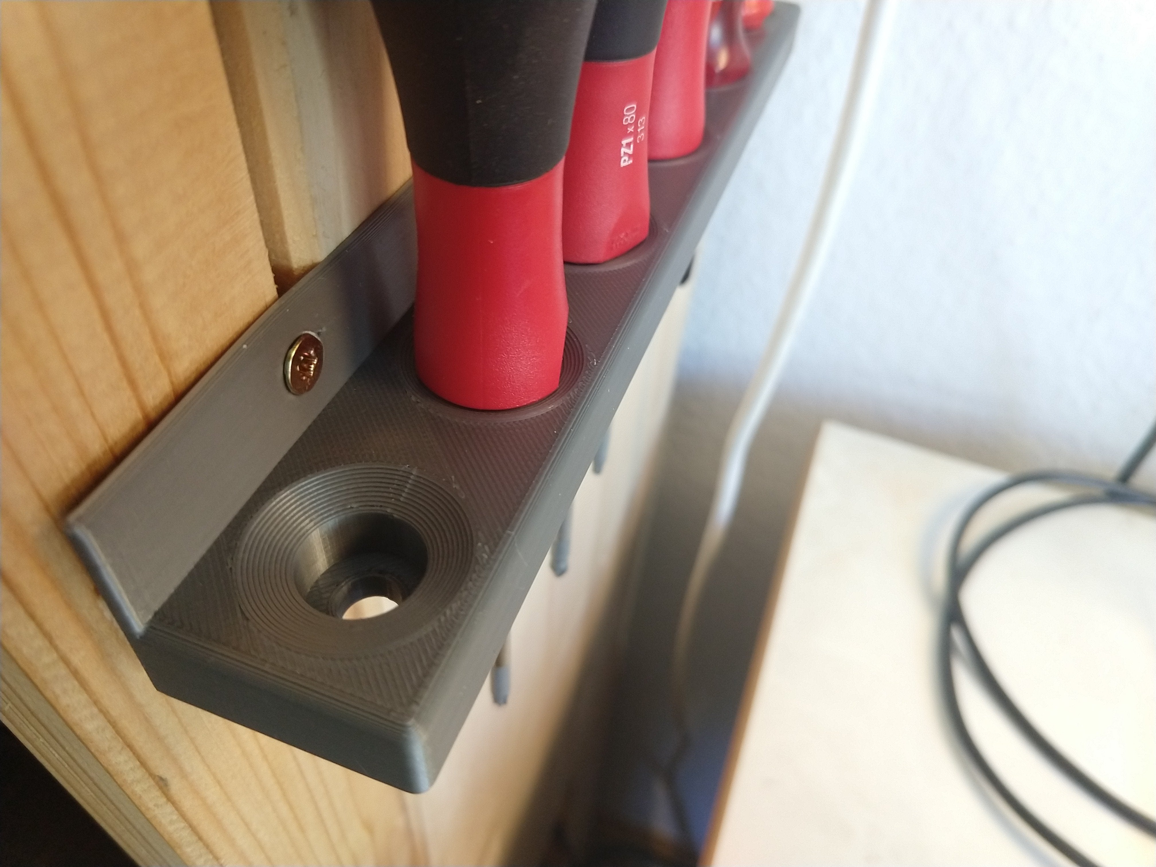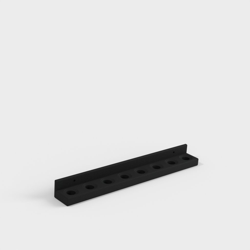 Tämä on yksinkertainen pidike Wiha Soft Touch -ruuvimeisseleille, joka pitää ne tukevasti paikallaan. Uusimmassa versiossa on 8 aukkoa PZ1-, PZ2-, PH1-, PH2-, TX10-, TX15-, TX20- ja TX25-kierteille.