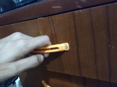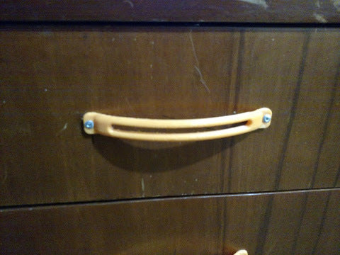 Yksinkertainen laatikon kahva vanhoihin huonekaluihin. Tämä yksinkertainen kahva voidaan helposti kiinnittää pöytään tai kaappiin pop-niiteillä, jolloin laatikoita on helppo vetää ulos. Ruuveja ei tarvita