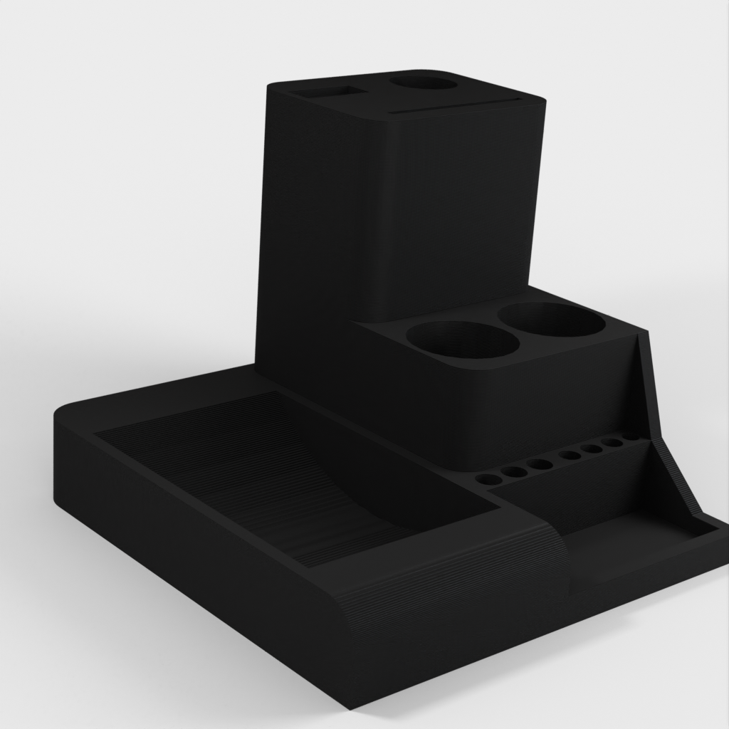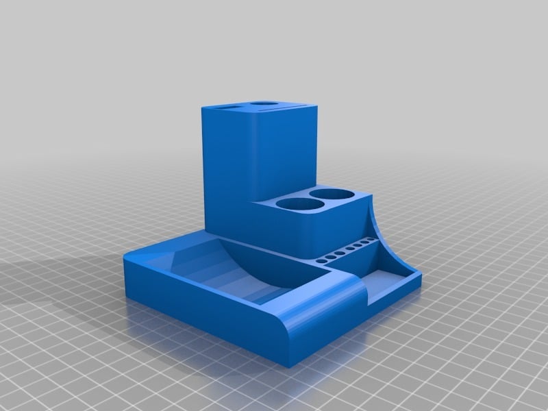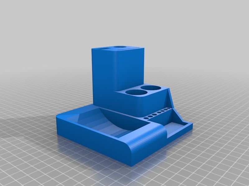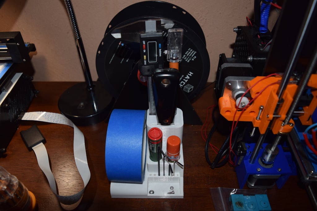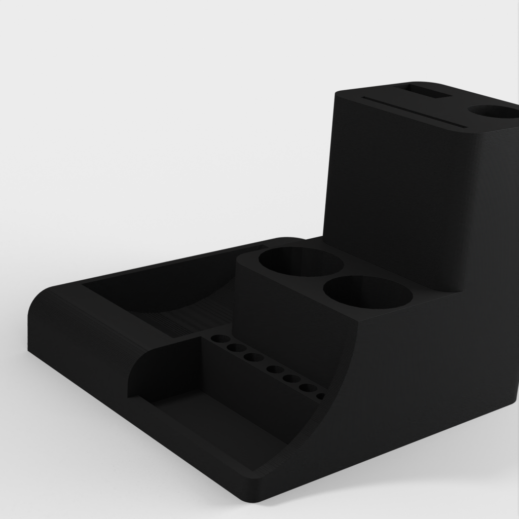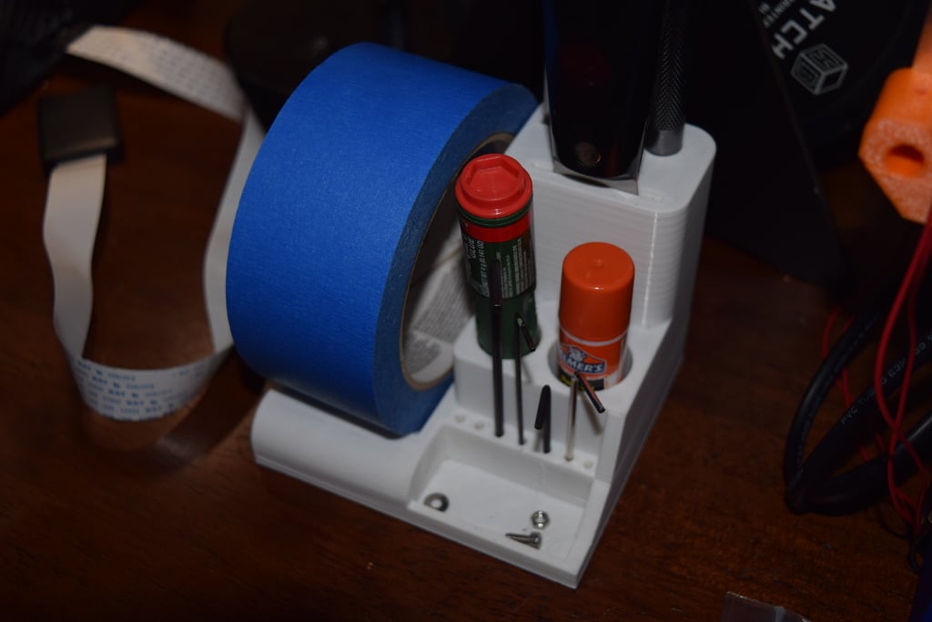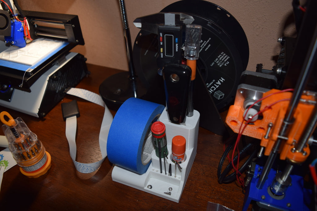 3D-tulostimen työkalupidike, joka on suunniteltu pitämään työkalut järjestyksessä. Siihen mahtuu monenlaisia esineitä polttimesta, liimapuikosta tai krazy glue -liimasta aina 38,2 mm leveään kaapimeen. Lisäksi työkalupidike on yhteensopiva sekä Monoprice Mini Select- että Prusa I3 3D-tulostimien kanssa, joten se on monipuolinen lisä mihin tahansa 3D-tulostimen kokoonpanoon. Kokonaispinta-ala on 110mm x 110mm, mikä osoittaa, että se ei vie liikaa tilaa.