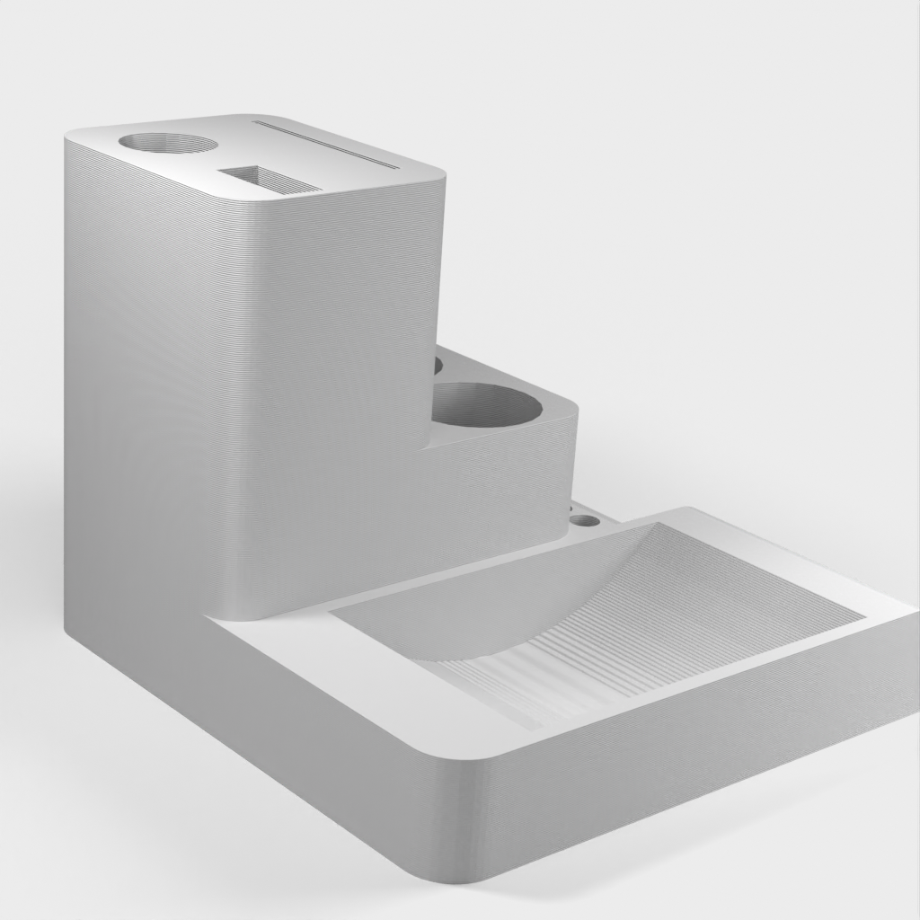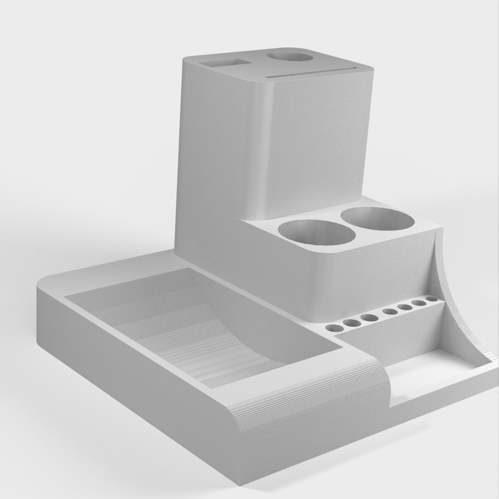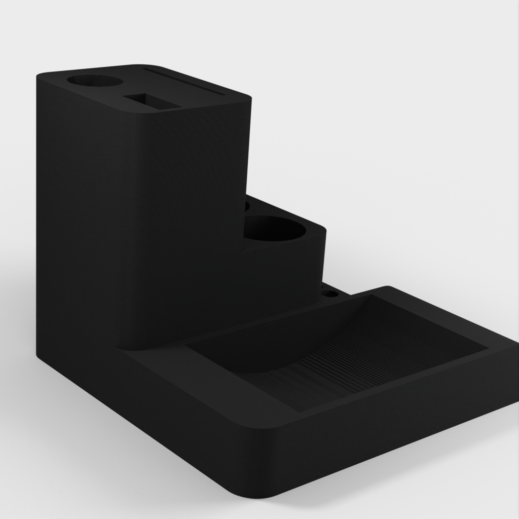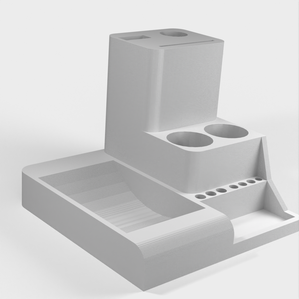 3D-tulostimen työkalupidike, joka on suunniteltu pitämään työkalut järjestyksessä. Siihen mahtuu monenlaisia esineitä polttimesta, liimapuikosta tai krazy glue -liimasta aina 38,2 mm leveään kaapimeen. Lisäksi työkalupidike on yhteensopiva sekä Monoprice Mini Select- että Prusa I3 3D-tulostimien kanssa, joten se on monipuolinen lisä mihin tahansa 3D-tulostimen kokoonpanoon. Kokonaispinta-ala on 110mm x 110mm, mikä osoittaa, että se ei vie liikaa tilaa.
