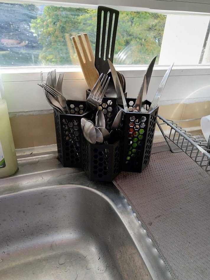 Käytännöllinen ruokailuvälineastia, joka on jaettu neljään laatikkoon: yksi pienille lusikoille, yksi haarukoille, yksi veitsille ja suurempi laatikko isommille lusikoille ja muille keittiövälineille. Pienet reiät pohjassa auttavat veden valumista.
