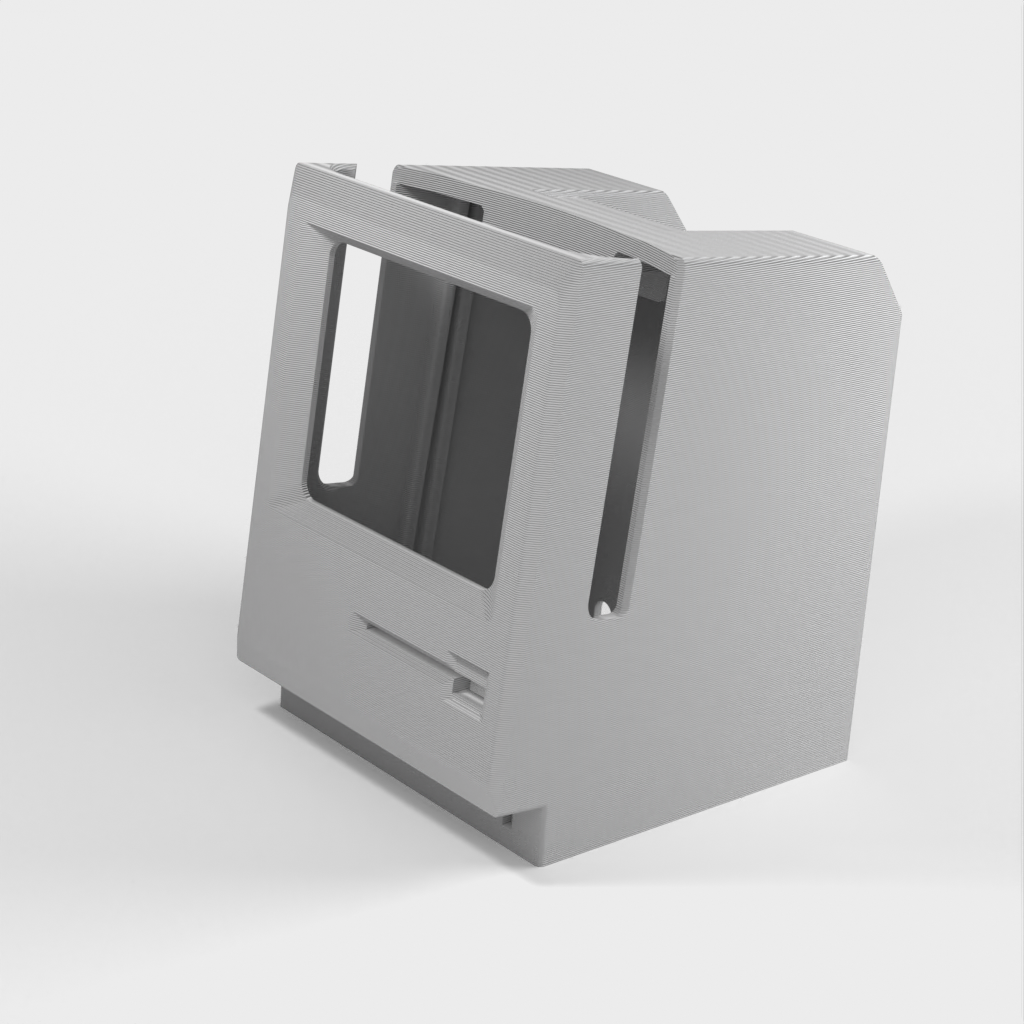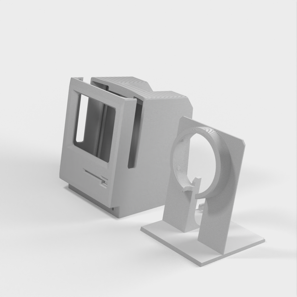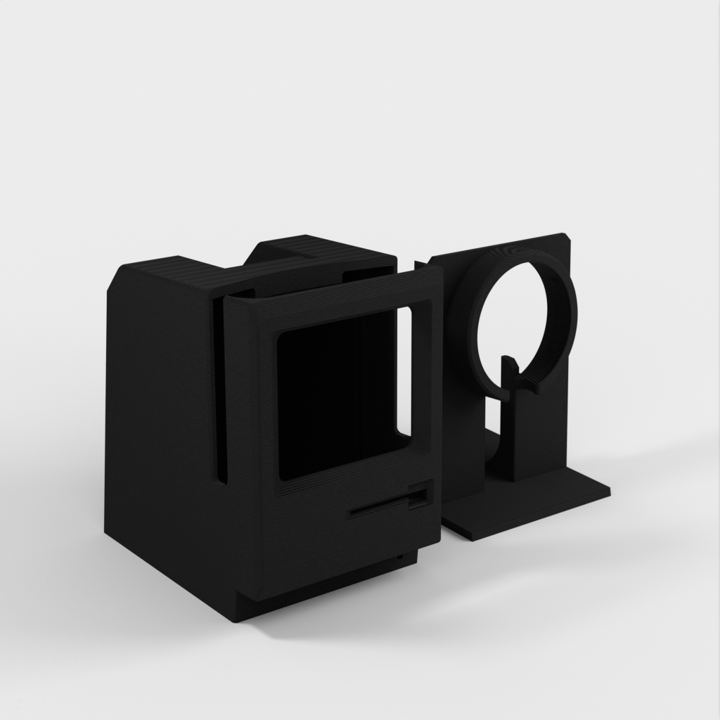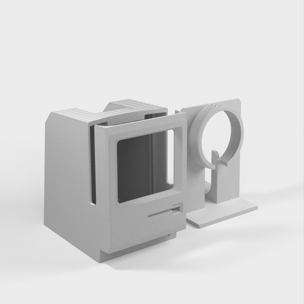 Apple Watch -latausteline klassiseen Mac-tyyliin. Tämä on kaksiosainen latausteline Apple Watchille, jossa osa 1 pitää langattoman latausmekanismin paikallaan ja osa 2 liukuu päälle ja tarjoaa paikan Apple Watchin telakoimiseen. Kuoren sivuilla on aukot, jotka pitävät kellon tukevasti kiinni sen rannekkeesta, kun taas magneettilatauslaite pitää sen paikallaan latausta varten. Näyttö on samassa linjassa Macin näytön kanssa, joten voit nähdä näytön, kun kello on yöpöytätilassa.
