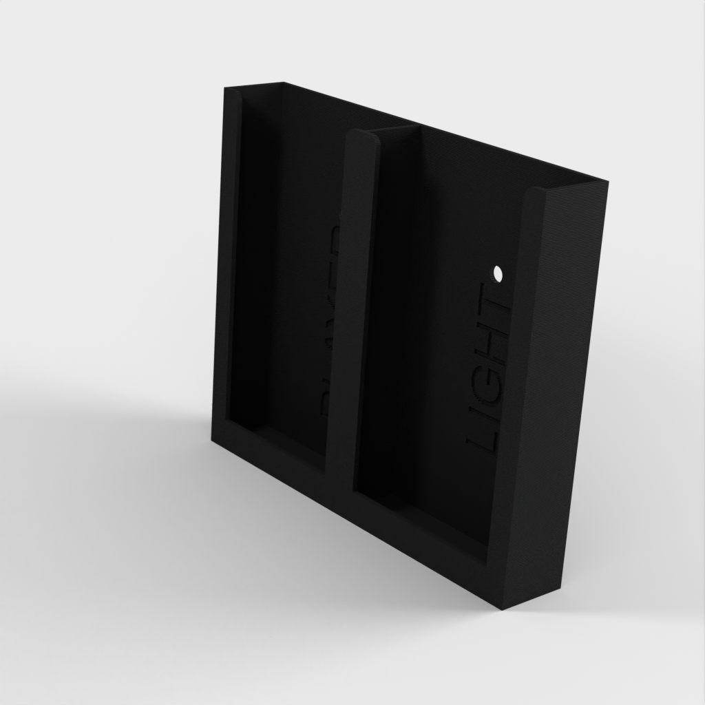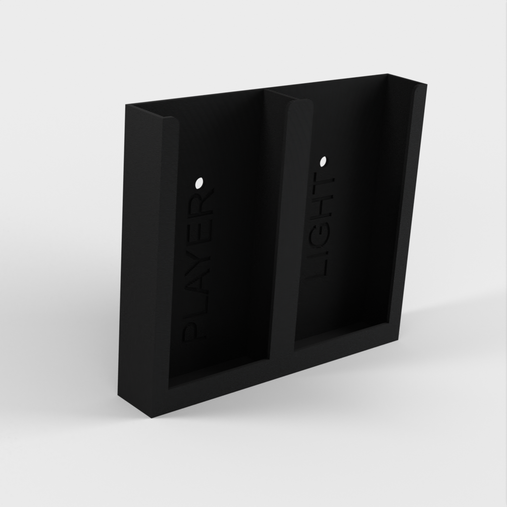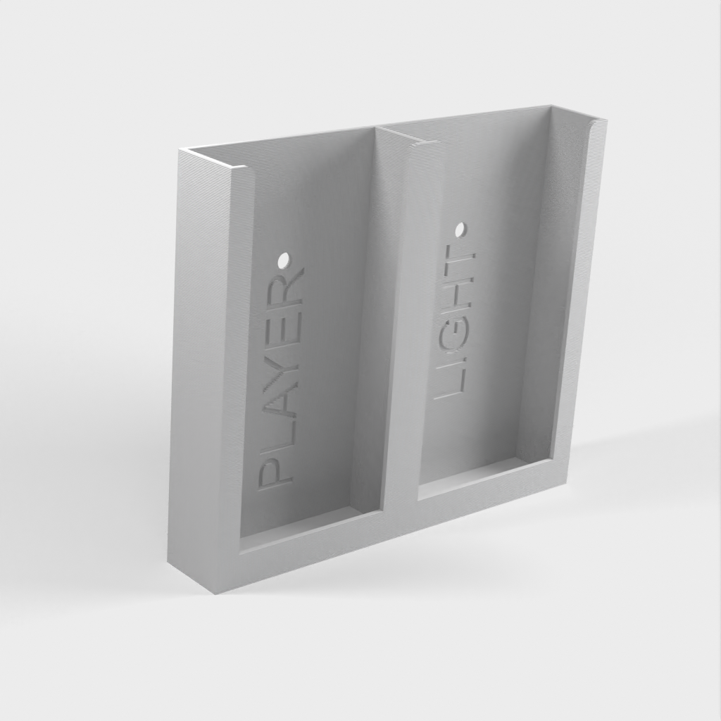 Tämä on yksinkertainen pidike, johon mahtuu 2 kaukosäädintä. Se voidaan asentaa joko pysty- tai vaakasuoraan. Voit kiinnittää sen joko kahdella ruuvilla tai kaksipuolisella teipillä, kumpi sopii parhaiten kotiisi.