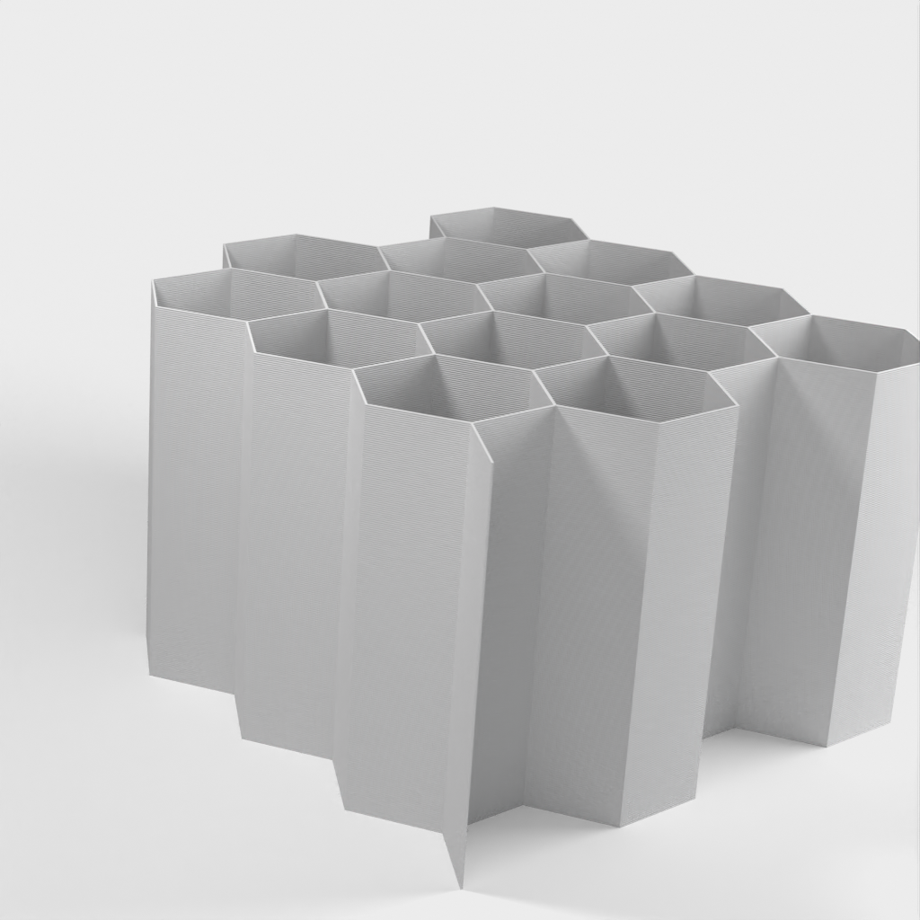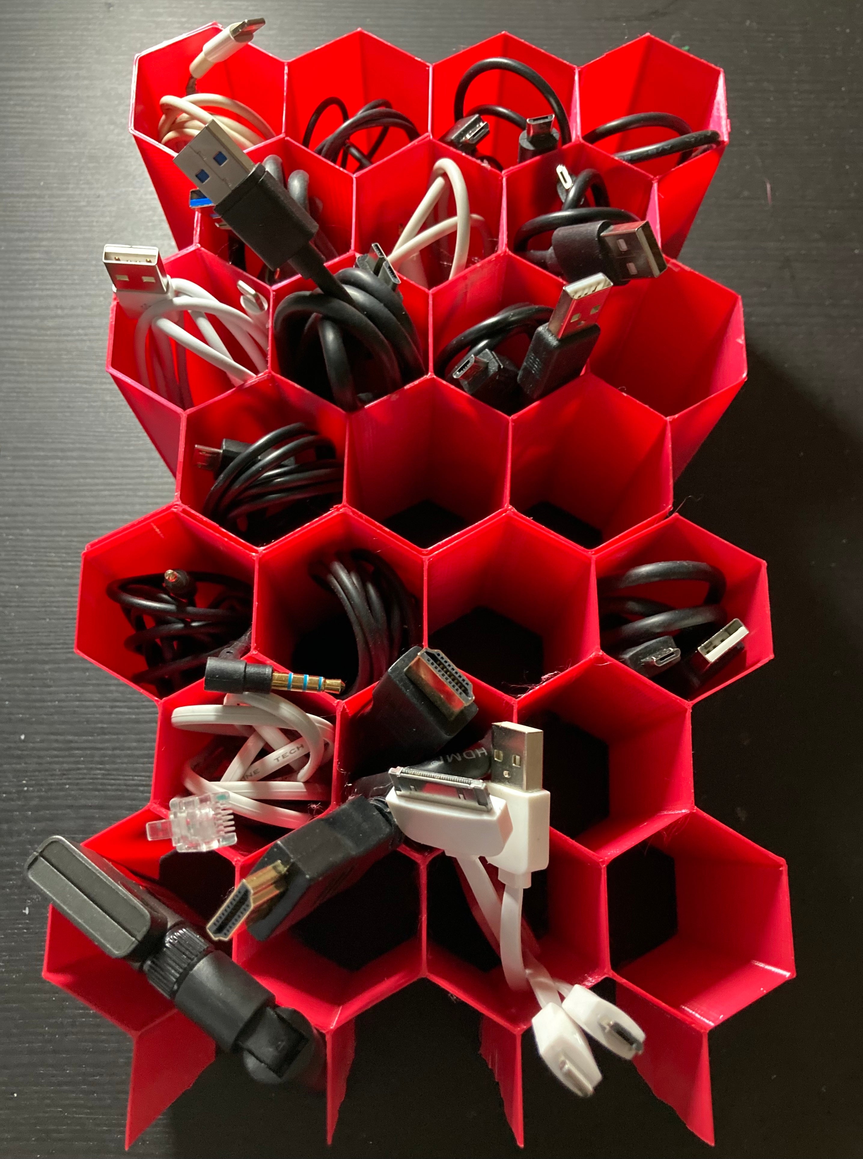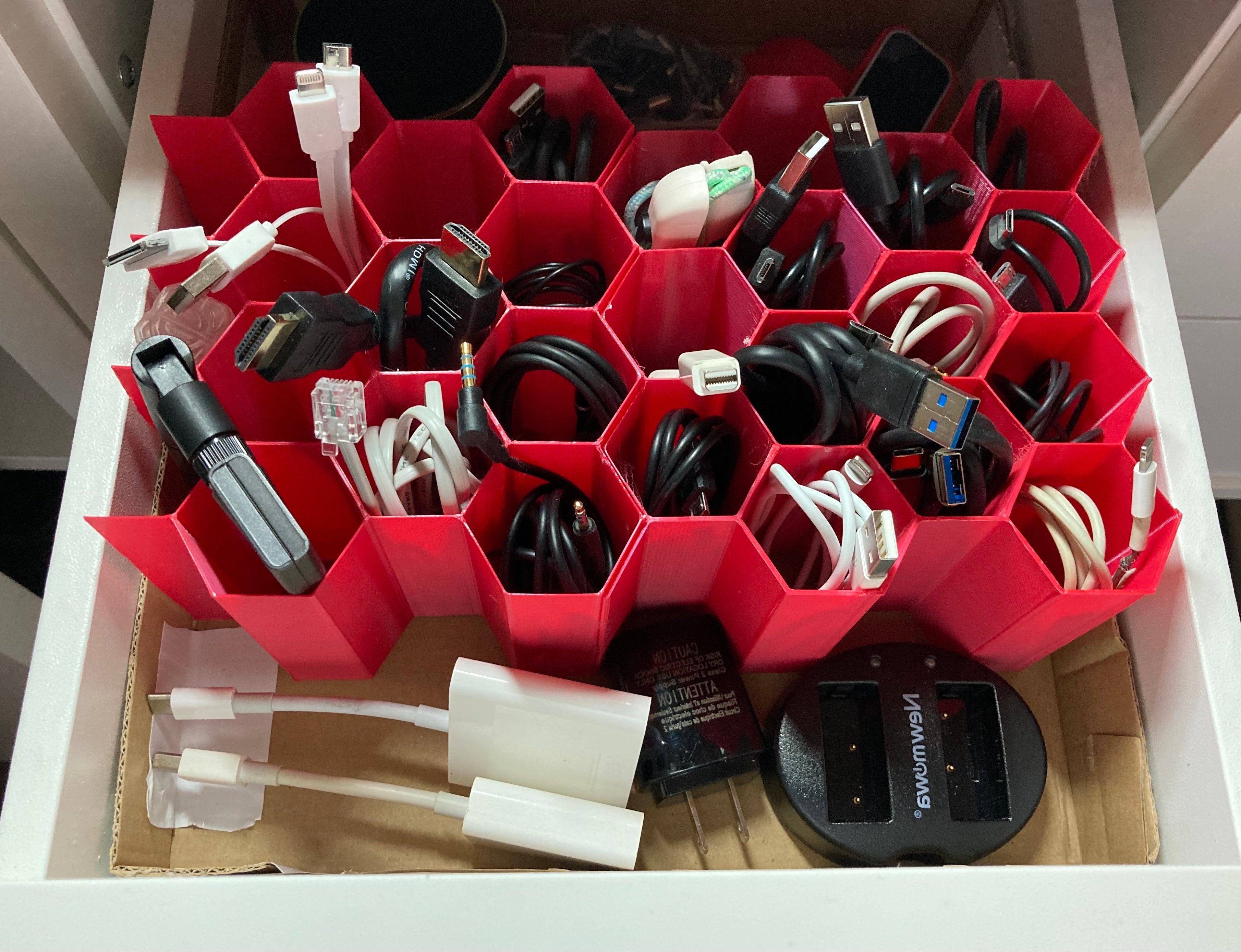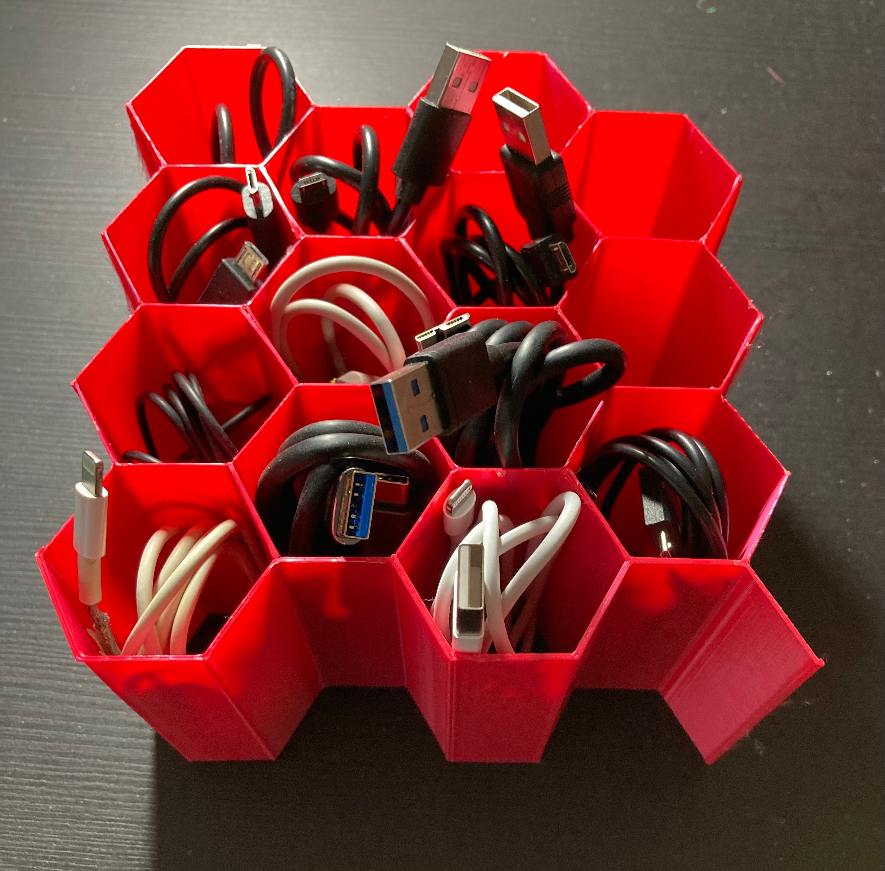 Hex Cable Organiser on modulaarinen kaapelien säilytysjärjestelmä, joka paikallistaa ja säilyttää kaapelit nopeasti ilman, että niistä tulee sotkuista sotkua. Kaapelit voidaan sijoittaa siististi kuusikulmaisiin aukkoihin. Lisää kaapelien säilytyspaikkoja voidaan helposti lisätä.