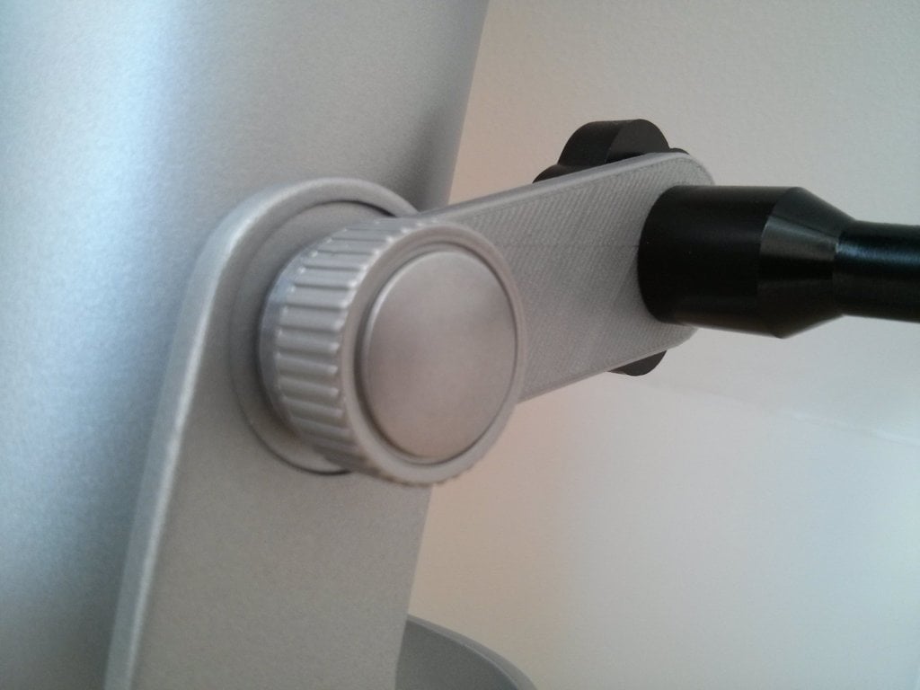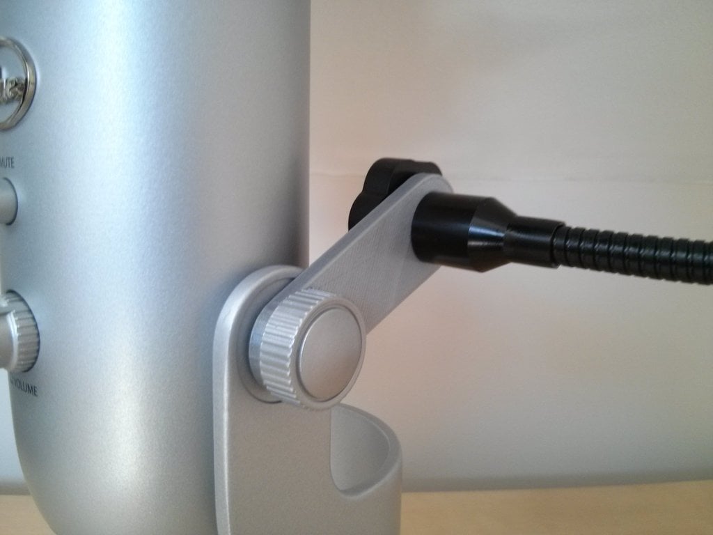 Blue Yeti -mikrofonin pop-suodattimen kiinnikkeen avulla tavallisen pop-suodattimen kiinnittäminen Blue Yeti -pöytämikrofoniin on helppoa. Pop-suodattimet on suunniteltu ruuvattavaksi normaaliin mikrofonitelineeseen metallikiinnikkeellä. Tämä kiinnike korvaa nykyisen ja mahdollistaa pop-suodattimen kiinnittämisen suoraan Blue Yeti -mikrofoniin. Kiinnike on helppo kiinnittää ruuvaamalla se kiinni. Kulmaa voidaan säätää myös löysäämällä pulttia.