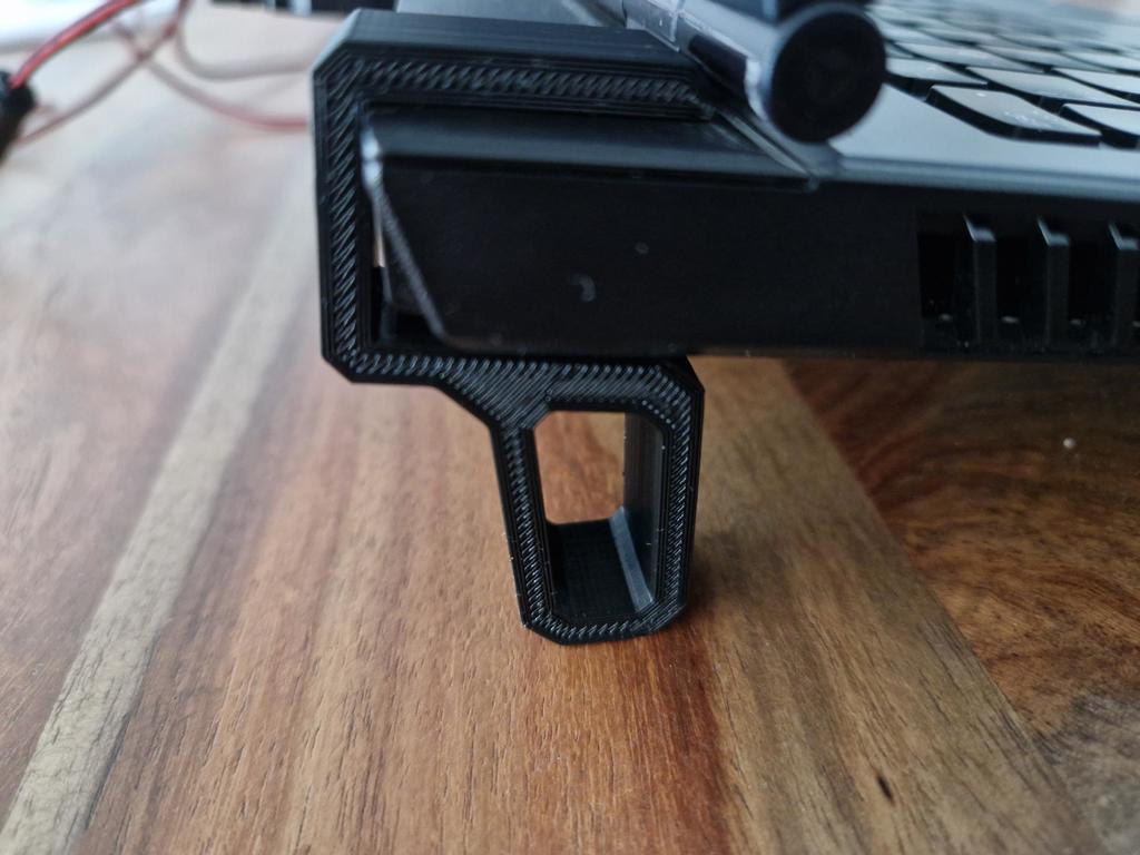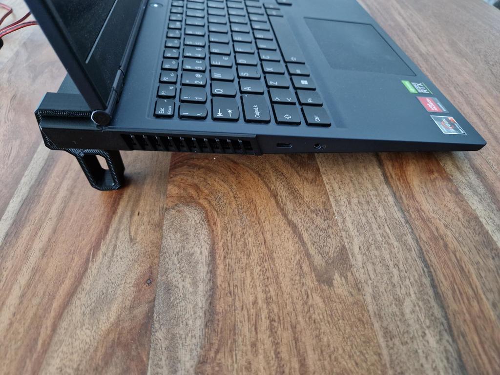 Laptop-teline on suunniteltu Lenovo Legion 5:lle. Nostamalla kannettavan tietokoneen takaosaa voit parantaa kannettavan tietokoneen ilmanvaihtojärjestelmän ilmavirtaa. Sinun on tulostettava pari jalkaa ja myös pari pientä kumia, jotta jalat eivät pääse liukumaan pois. Jalat tulee sijoittaa selkänojan kulmiin peittämättä tuuletusaukkoja.