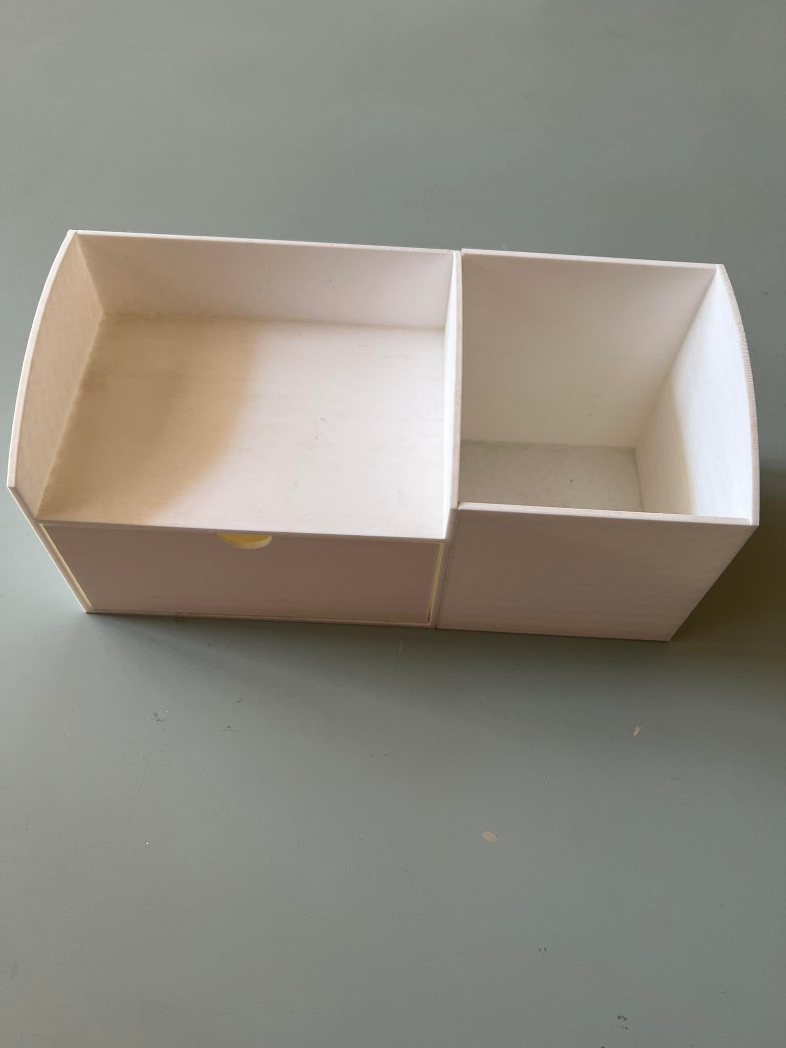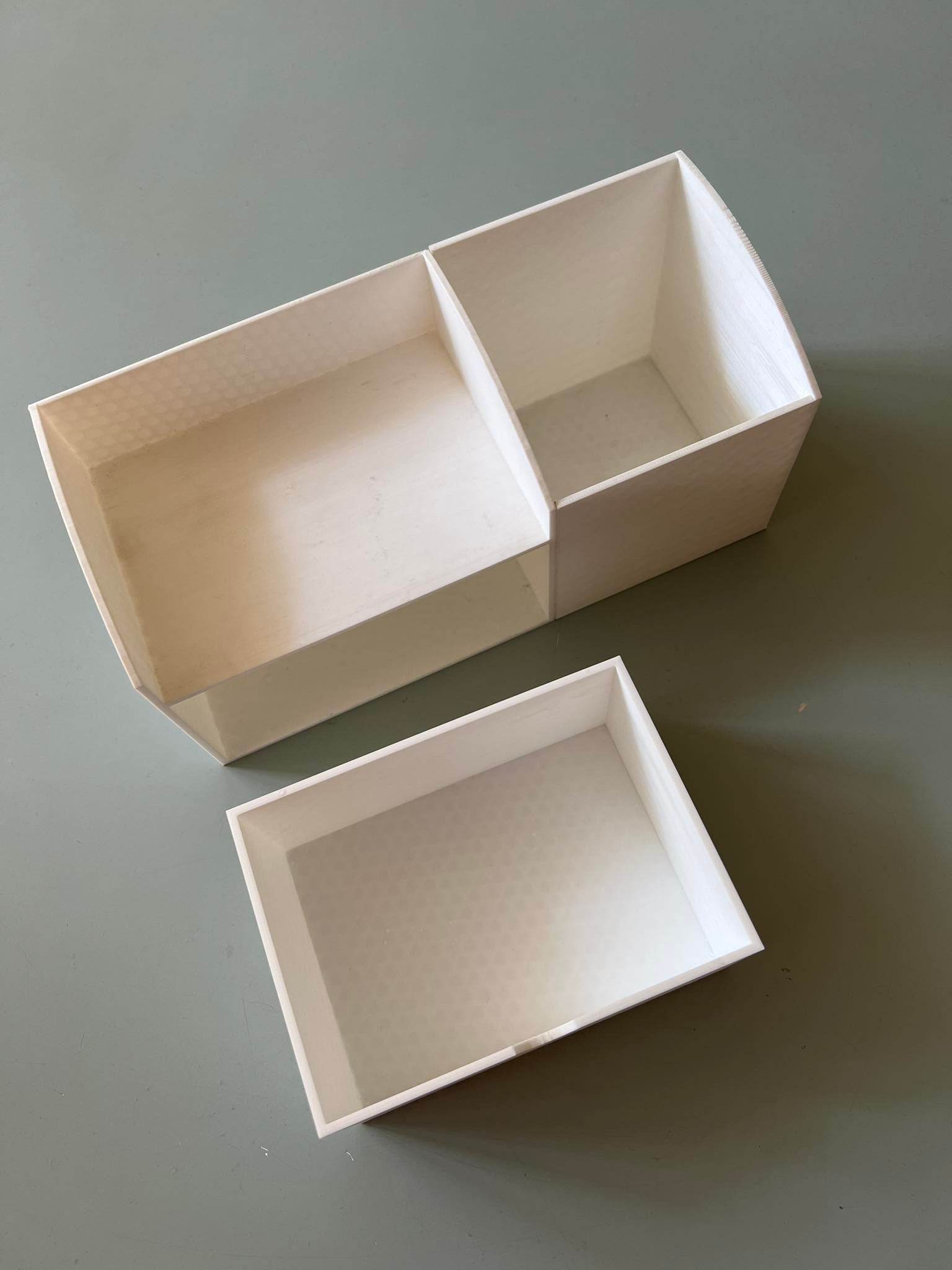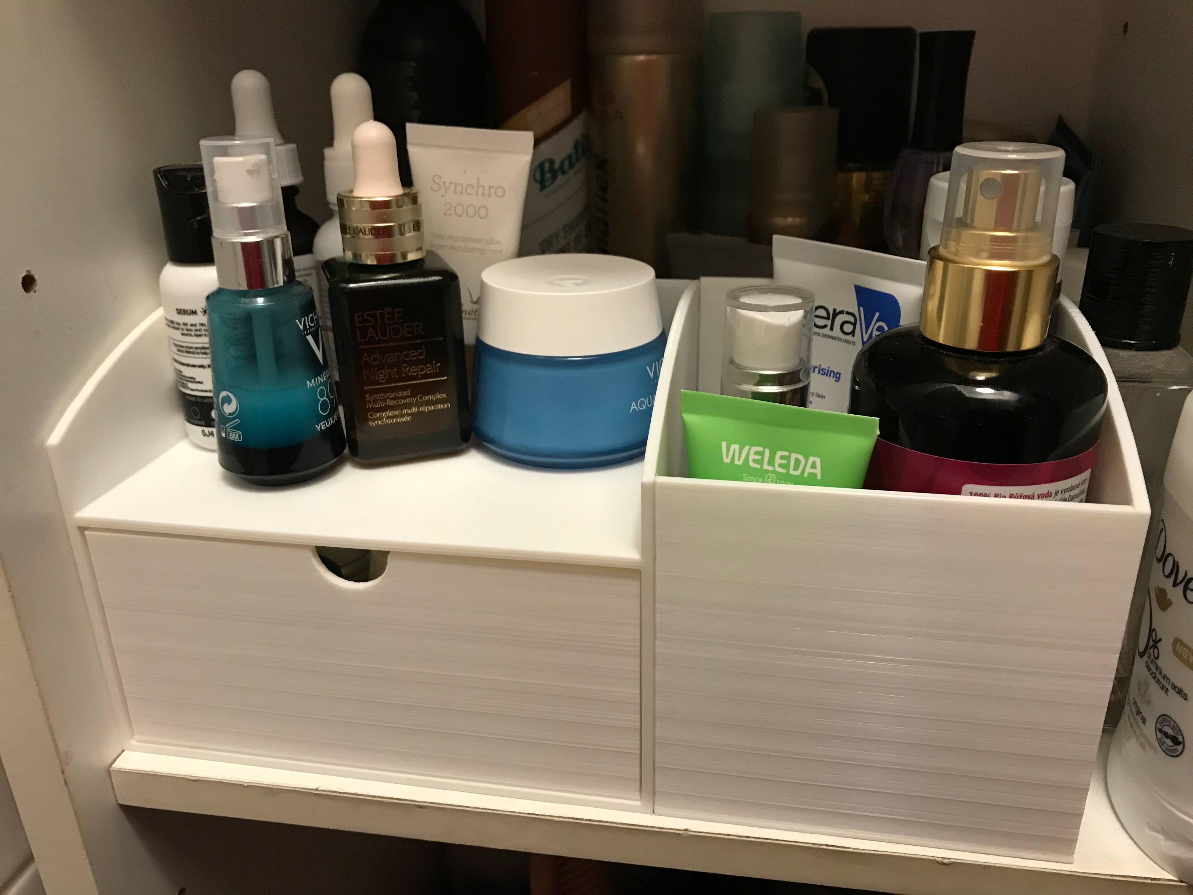 Tämä on PLA:sta painettu kylpyhuoneen järjestäjä. Tulostettu 0,2 mm:n kerroskorkeudella, 0,4 mm:n suuttimella, 20 %:n täytteellä, eikä tukia tarvita. Jokainen osa tulostetaan erikseen ja liimataan sitten yhteen. Tulostettu Ender 3v2:lla.