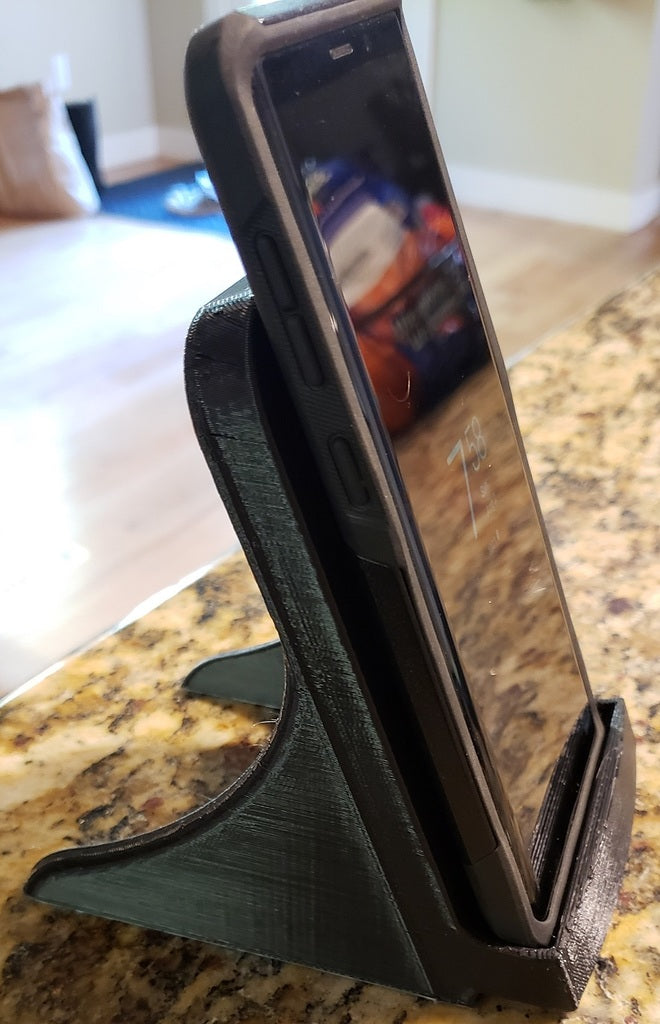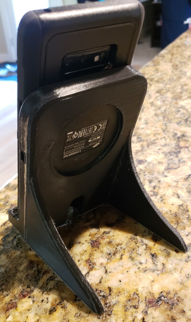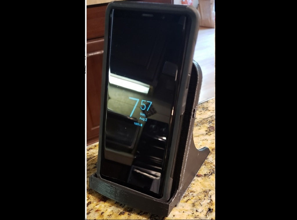 Tämä on Samsung Galaxy Note 9:n laturiteline, joka on suunniteltu sopimaan Samsung EP-PG900IBE -neliön muotoiseen laturiin. Se on erityisesti säädetty siten, että se sopii puhelimelle, kun se on vielä vankassa Otterbox-kotelossaan. Kaiuttimen reikä on sijoitettu uudelleen oikein pohjaan ja laturi on nostettu ylös, jotta se toimii yhdessä Note-laitteen sisäisen langattoman latauspaikan kanssa. Koko laite on hieman järeämpi, ja sen tulostamiseen kuluu noin 3,5 tuntia nopeudella 80 mm/s 0,3 kerroksen korkeudella ja 20 prosentin täytöllä.