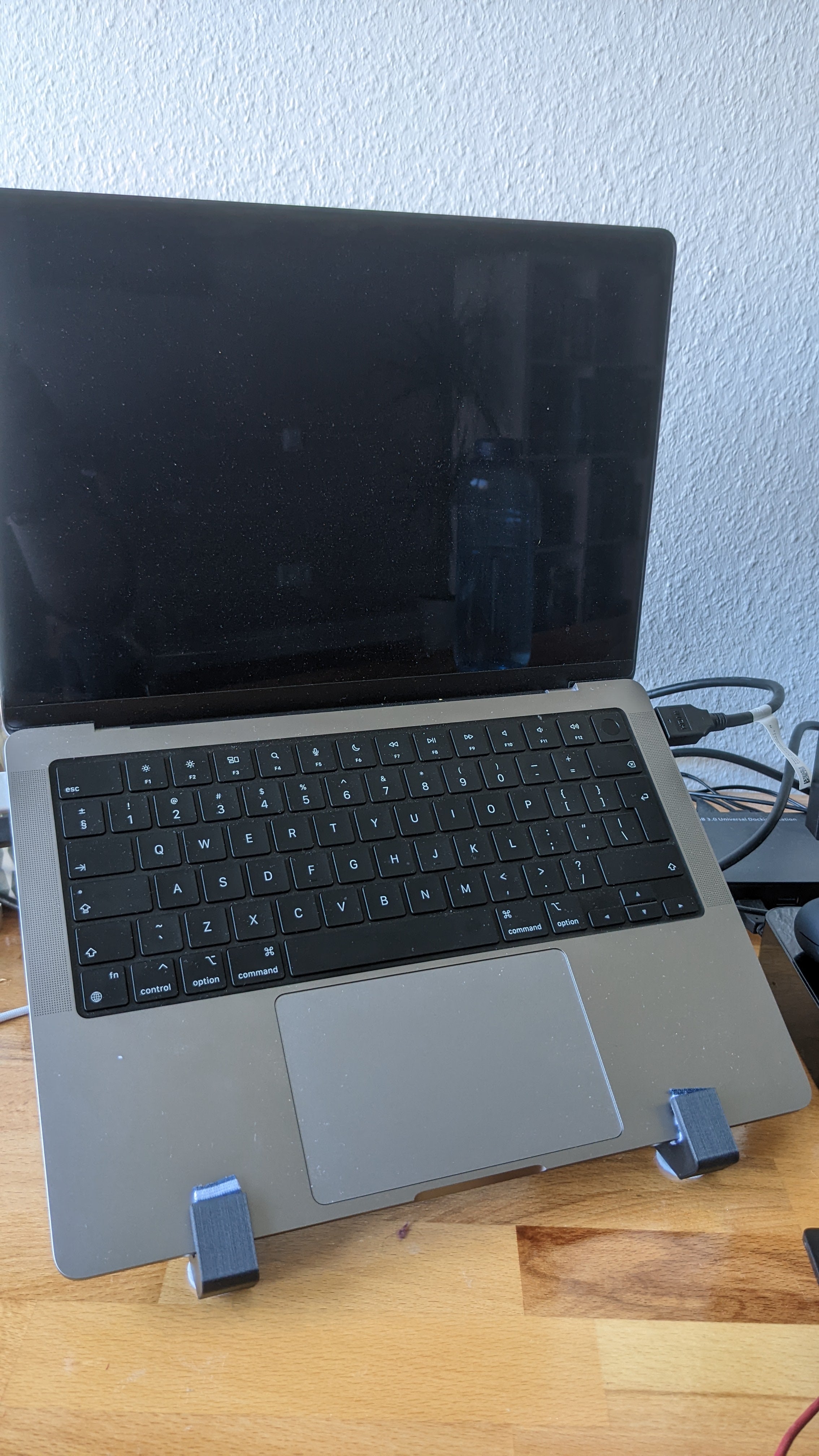 Meidän Macbook Pro -jalustamme sopii täydellisesti 14' Macbookin (2021) tai minkä tahansa muun kannettavan tietokoneen säilytykseen. Jalustan kahden pidikkeen välinen etäisyys on 18 cm, joten tilaa riittää useimmille trackpadeille. Tämä jalusta sisältää 2 pidikettä ja 2 akselia, jotka napsahtavat helposti yhteen. Suosittelemme lisäämään koukkuihin kankaan tai vastaavan, jotta kannettavat tietokoneet eivät naarmuuntuisi.