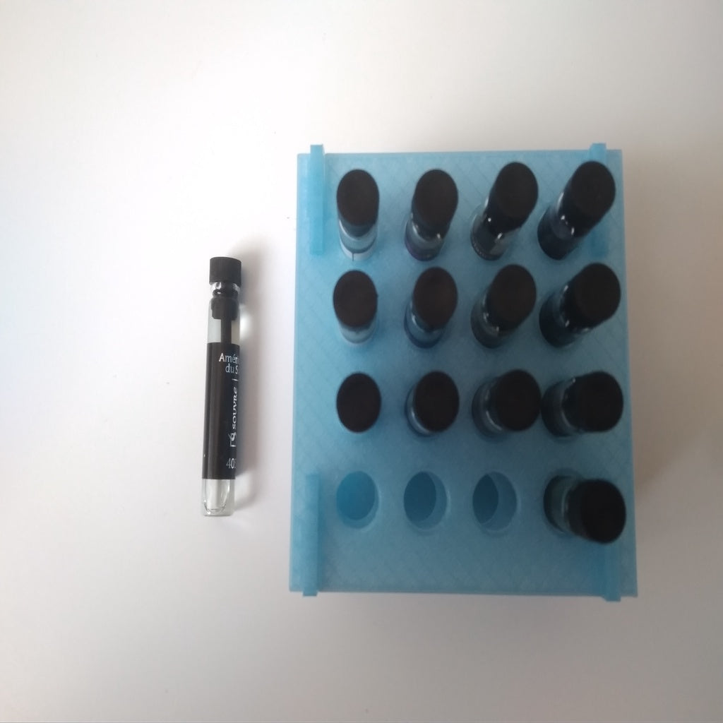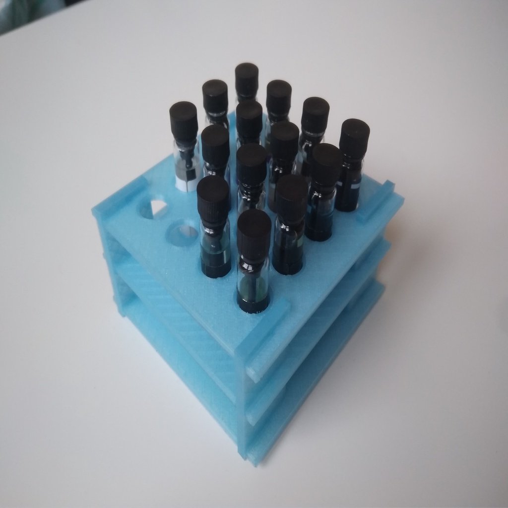 Hajuvesipullojen näytepidikkeisiin mahtuu jopa 16 näytettä, ja ne sopivat näytteille, joiden halkaisija on noin 8 mm. Tämä käytännöllinen pidike auttaa pitämään näytteet järjestyksessä, ja se voidaan helposti sijoittaa hyllylle tai pöydälle.
