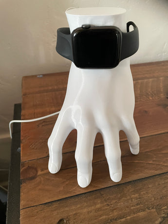 Yksinkertainen ja tyylikäs kelloteline Apple Watchille, suunniteltu kädeksi. Langaton laturi voidaan sijoittaa käden sisään, eikä asennus vaadi liimaa. Tämän pidikkeen avulla Apple Watch saa kauniin ja käytännöllisen paikan yöpöydälläsi, työpöydälläsi tai missä tahansa muualla, missä haluat sen olevan.