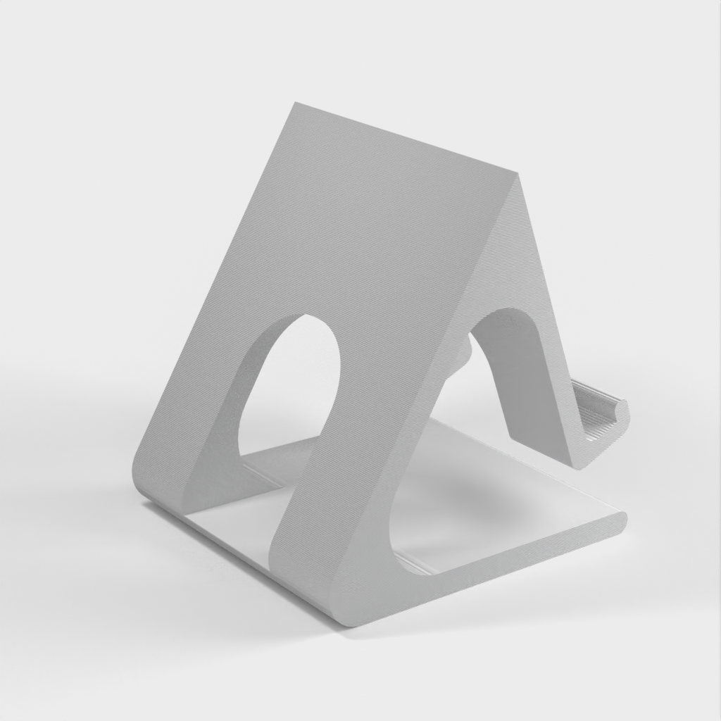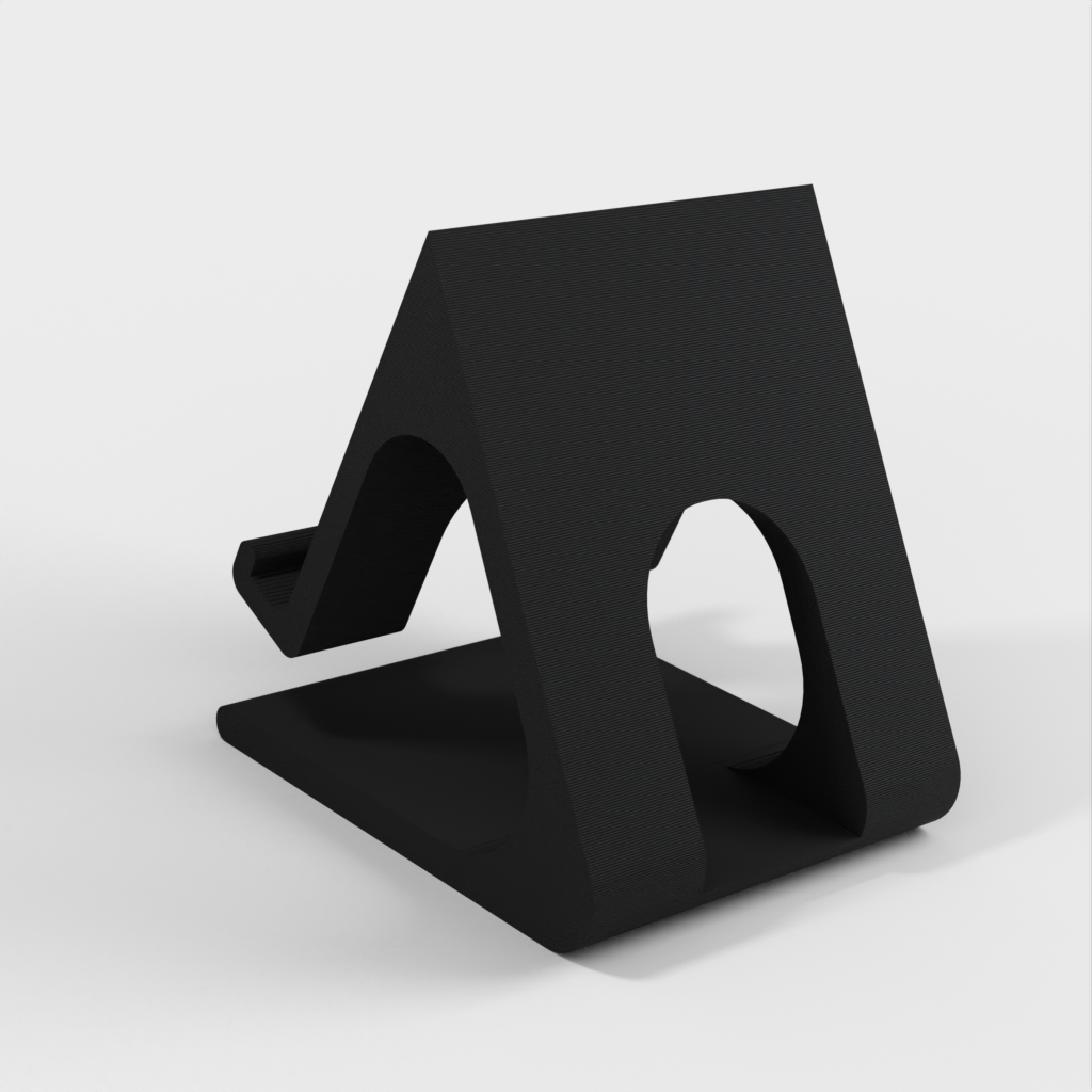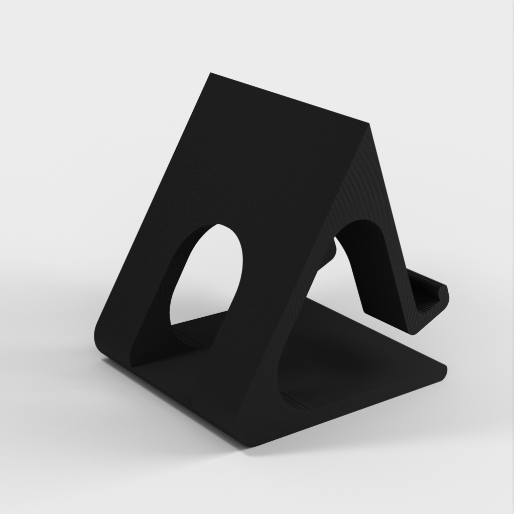 Yksinkertainen puhelinteline iPhone 6:lle, joka sopii myös muihin malleihin. Kaapeli menee reiän läpi, joten se on käyttövalmis. Tämä puhelinteline sopii erinomaisesti työpöydällesi tai toimistoosi, ja se voidaan helposti muokata tarpeisiisi sopivaksi.