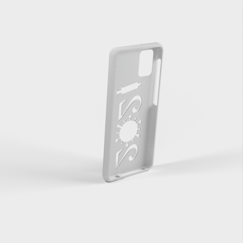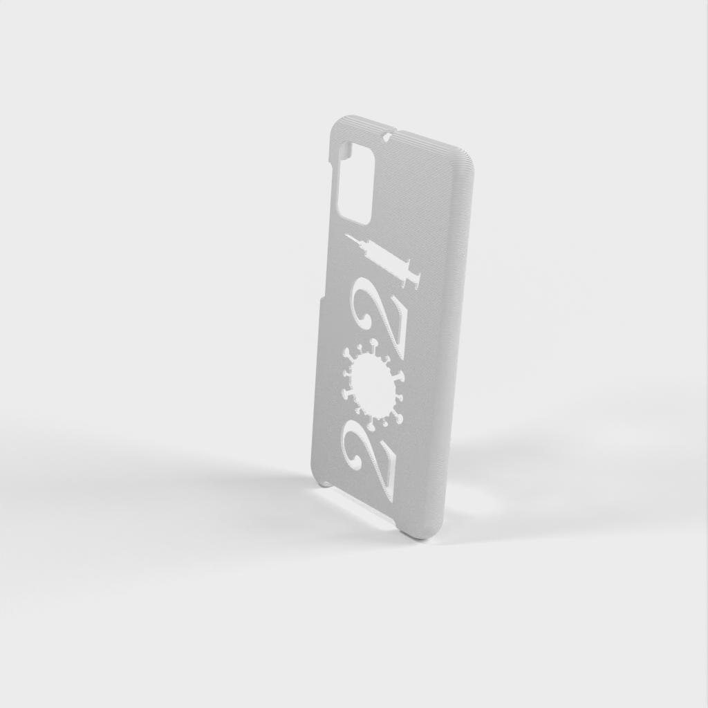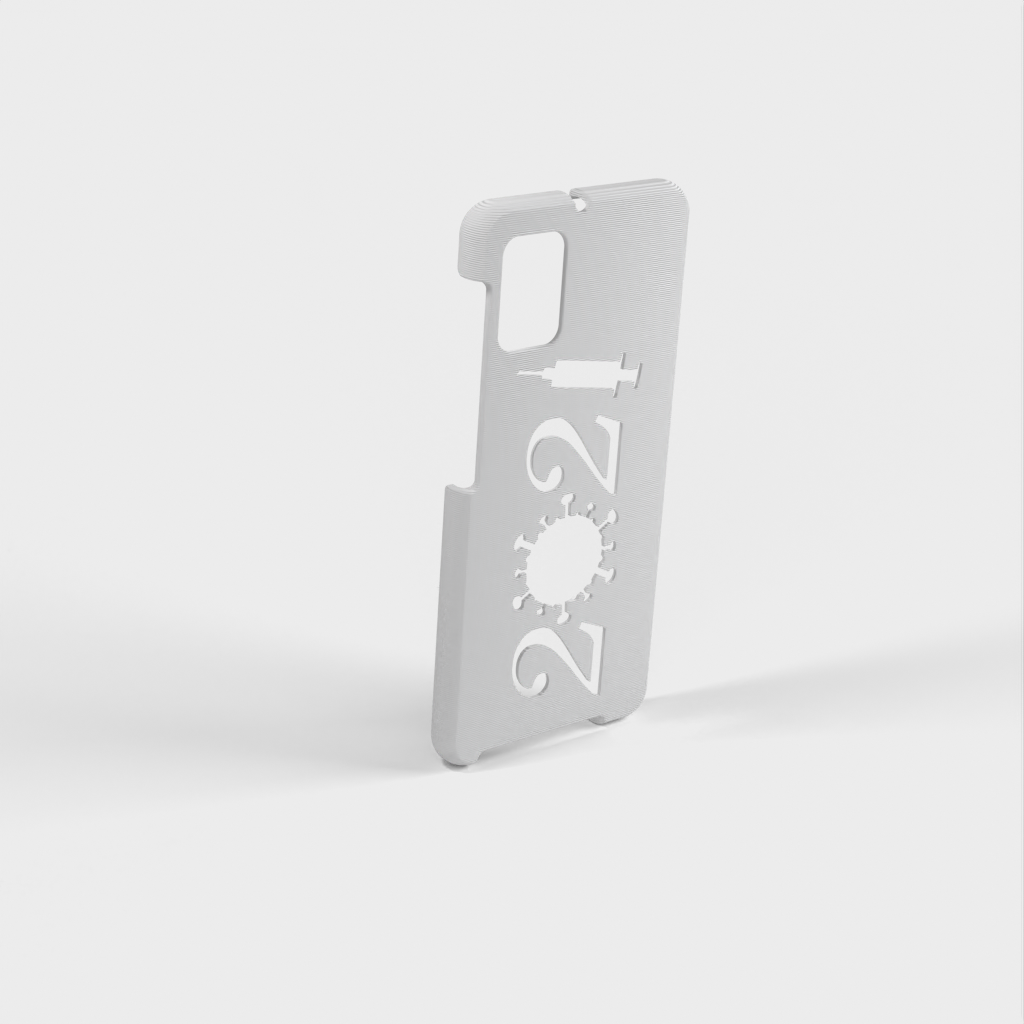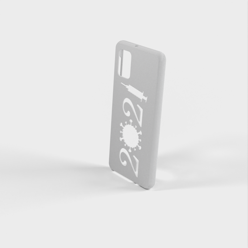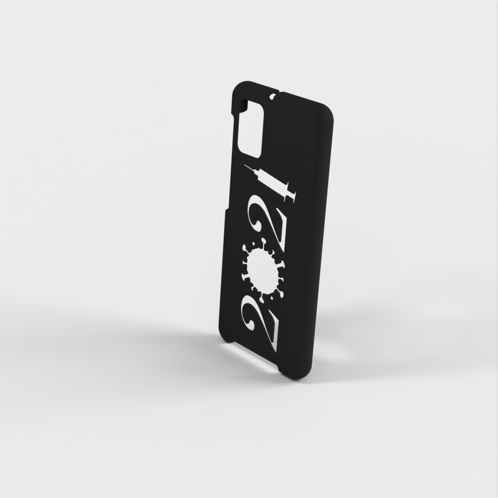 Kännykkäkotelo Samsung Galaxy A31 a315:lle. Kotelo on suunniteltu sopimaan täydellisesti puhelimen ympärille ja siinä on aukot kaikille painikkeille ja toiminnoille. Kotelon takaosassa on ainutlaatuinen muotoilu, jossa on viruksen muotoinen vuosiluku '2021' ja ruisku - COVID-19-rokotuksen symboli.