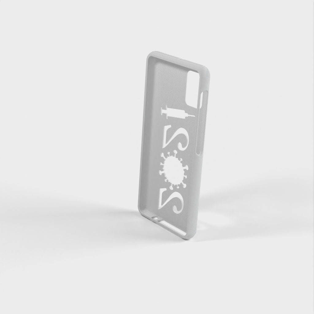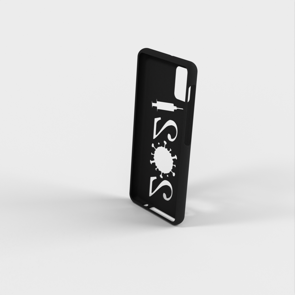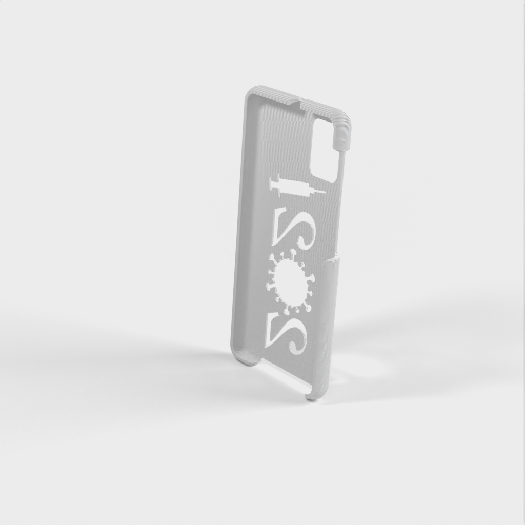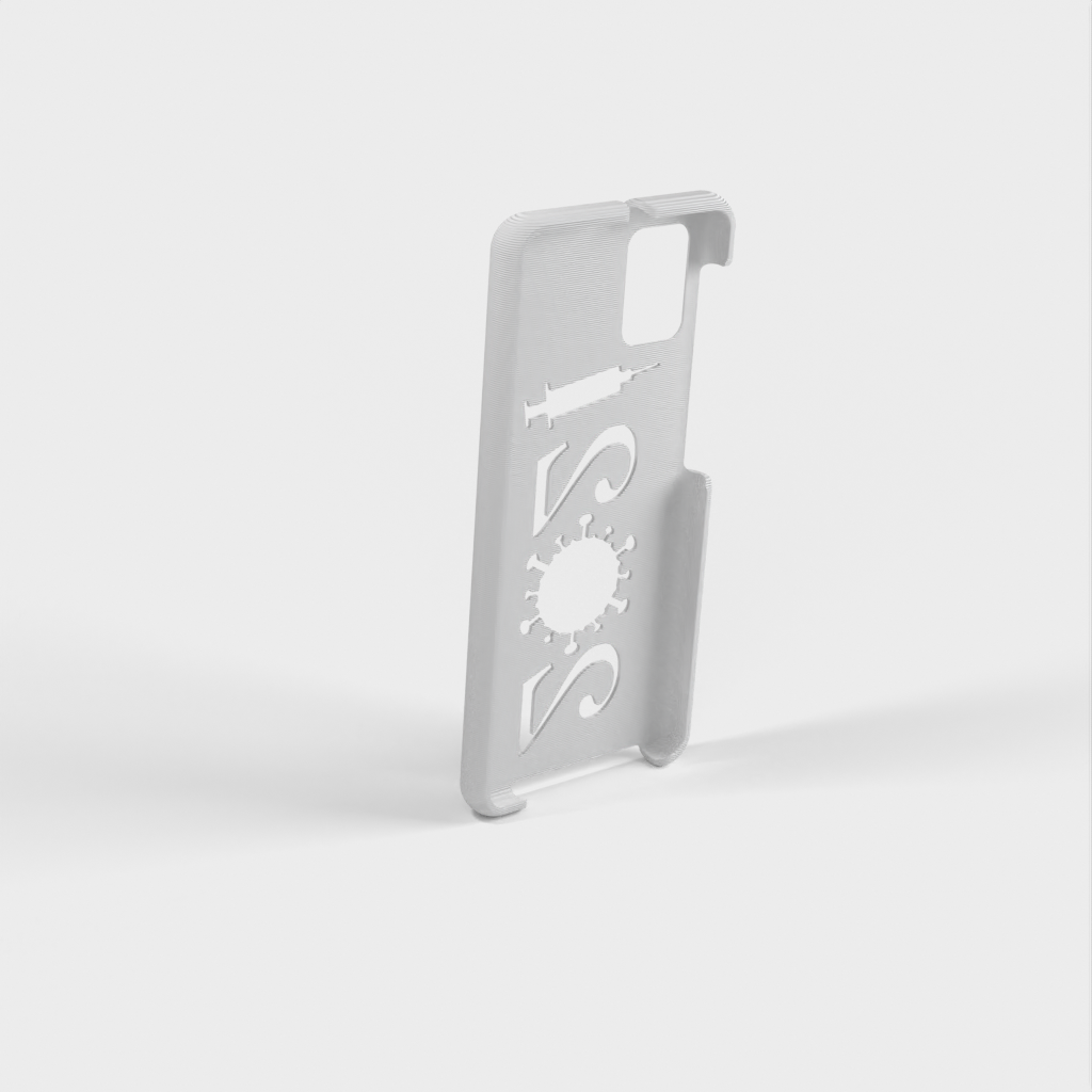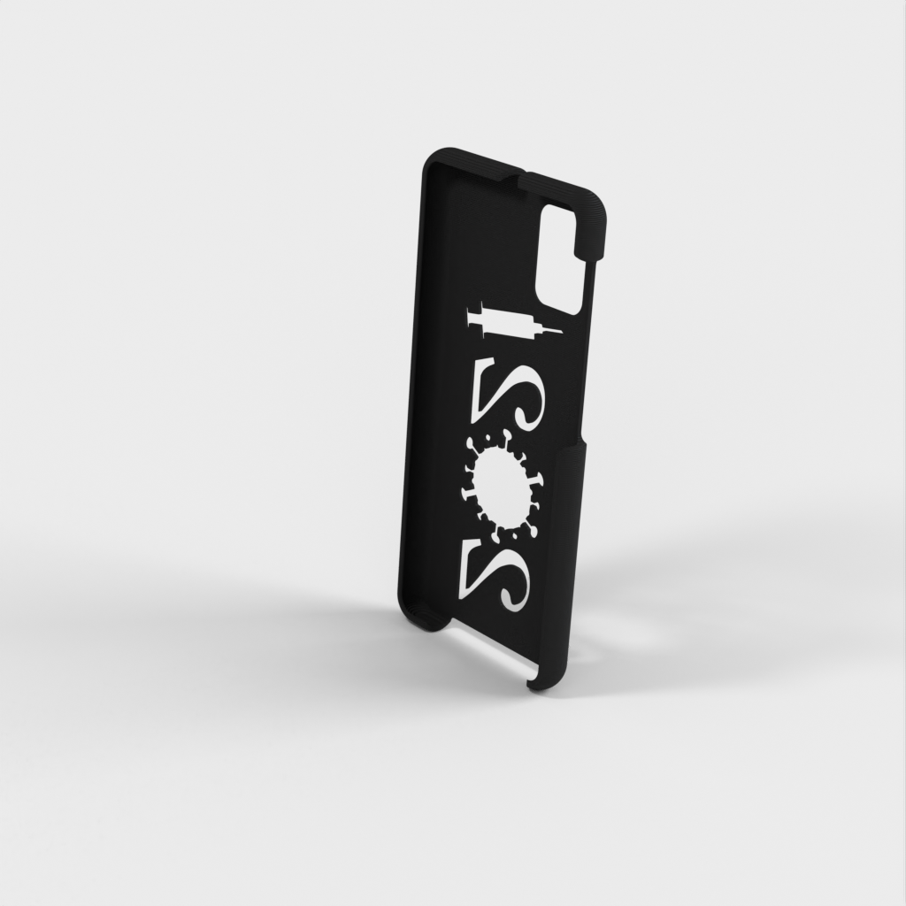Kännykkäkotelo Samsung Galaxy A31 a315:lle. Kotelo on suunniteltu sopimaan täydellisesti puhelimen ympärille ja siinä on aukot kaikille painikkeille ja toiminnoille. Kotelon takaosassa on ainutlaatuinen muotoilu, jossa on viruksen muotoinen vuosiluku '2021' ja ruisku - COVID-19-rokotuksen symboli.
