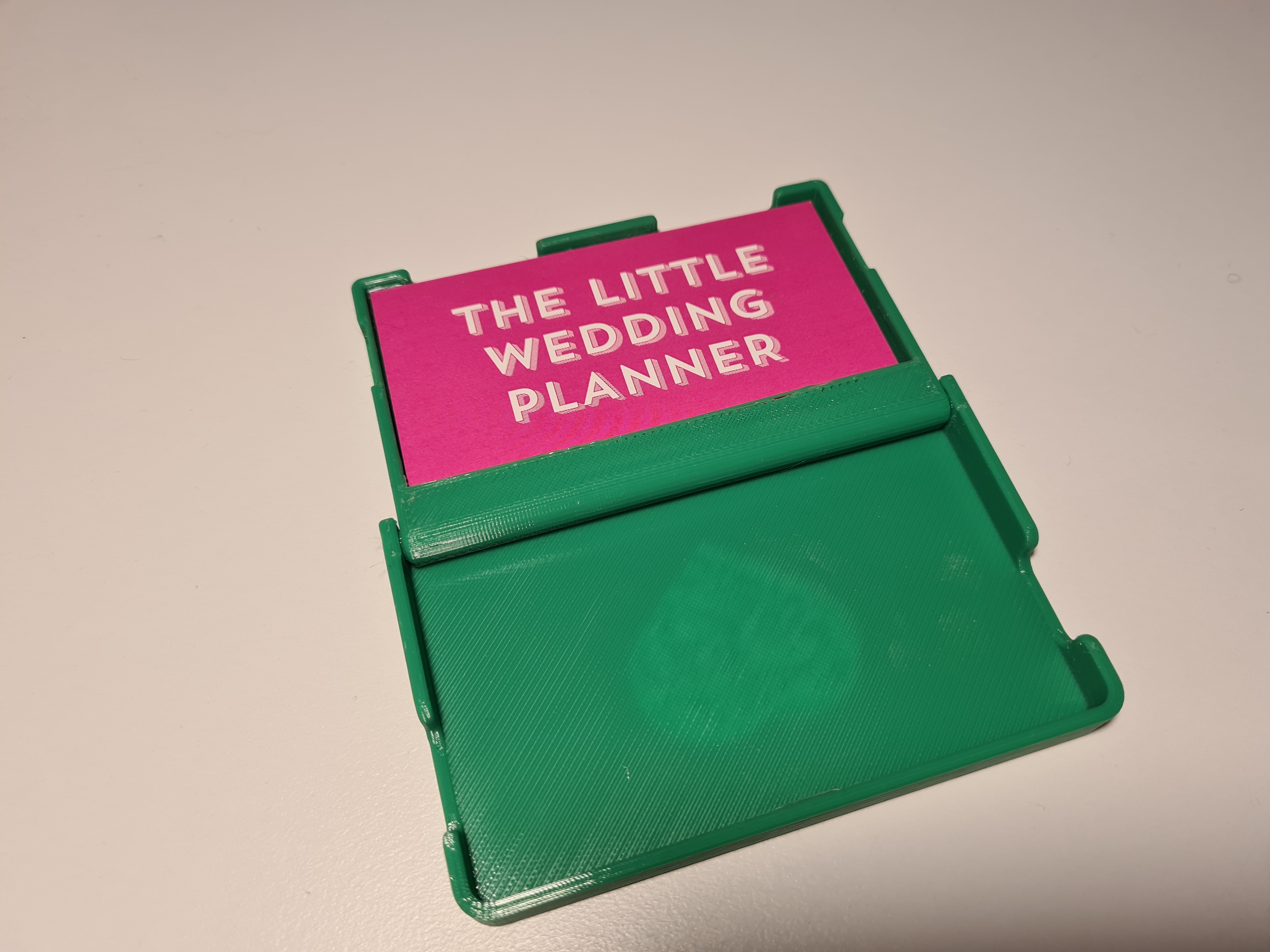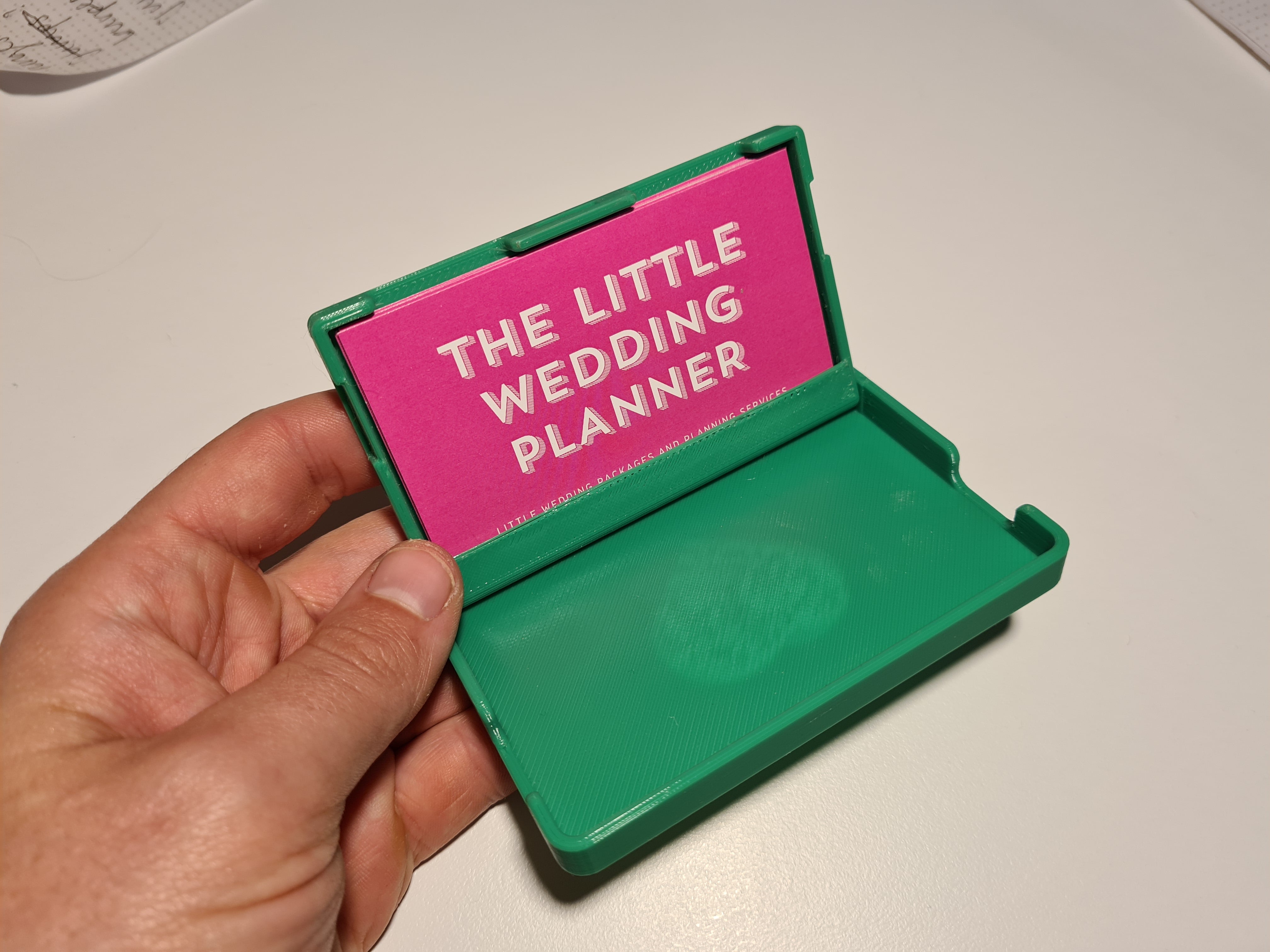 Tämä pieni käyntikorttipidike suojaa korttejasi taskussa tai laukussa. Se sulkeutuu napsautuksella, joten korttisi eivät roisku ulos laukussasi. Se aukeaa simpukkamaisesti paljastaen kortit. Mukana on kannen versio, jossa on sydän, ja tyhjä versio. Voit vapaasti laittaa siihen logon tai nimen.
