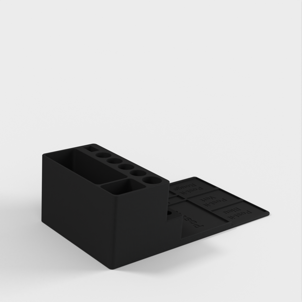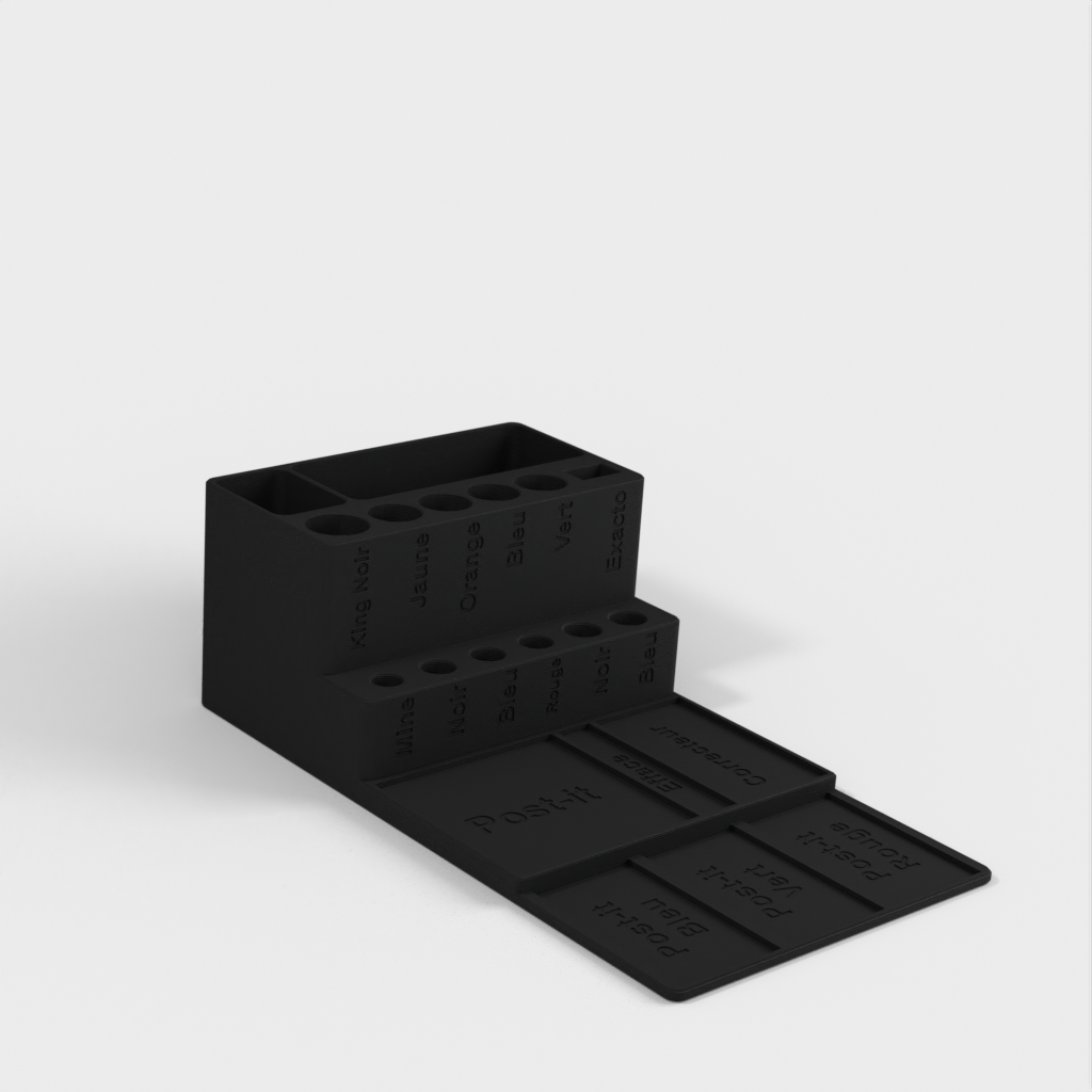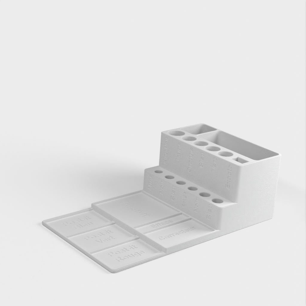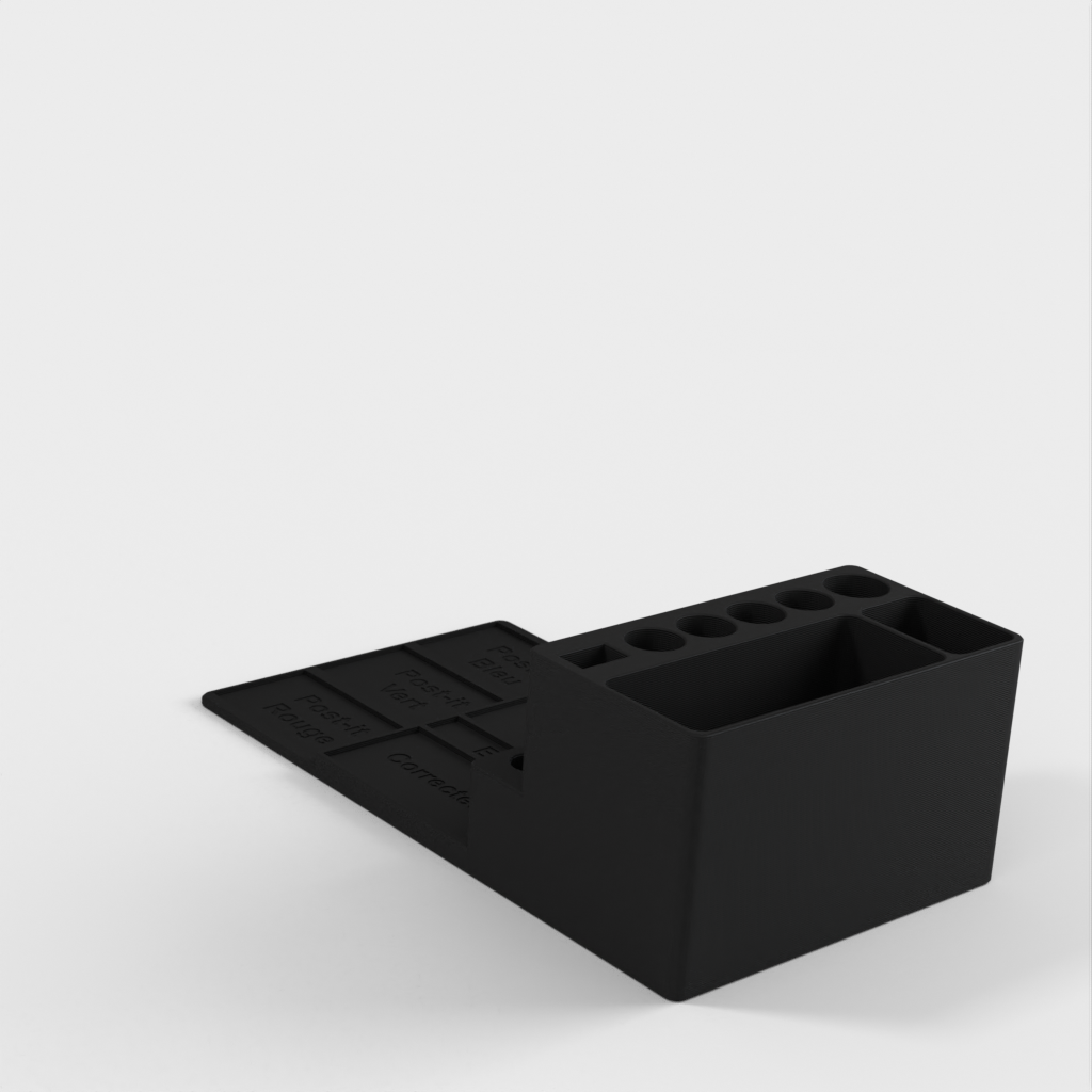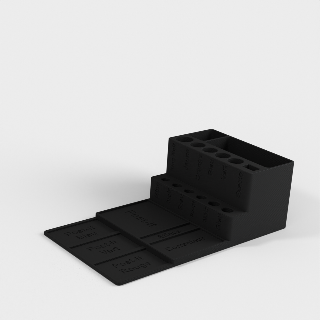 Tämä on pöytäjärjestelijä, joka on suunniteltu päivittäisten toimistotyökalujesi tehokkaaseen järjestämiseen. Tämä järjestelijä helpottaa erilaisten työkalujen, kuten kynien, lyijykynien, markkereiden ja muiden päivittäisessä toimistokäytössä välttämättömien kirjoitusvälineiden säilytystä. Pidä työpöytäsi siistinä ja järjestyksessä ja lisää tuottavuuttasi pitämällä toimistotyökalusi helposti saatavilla.