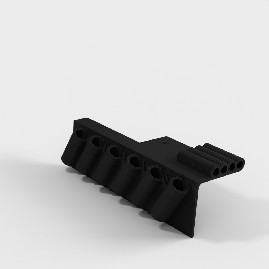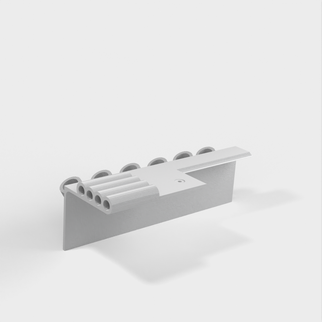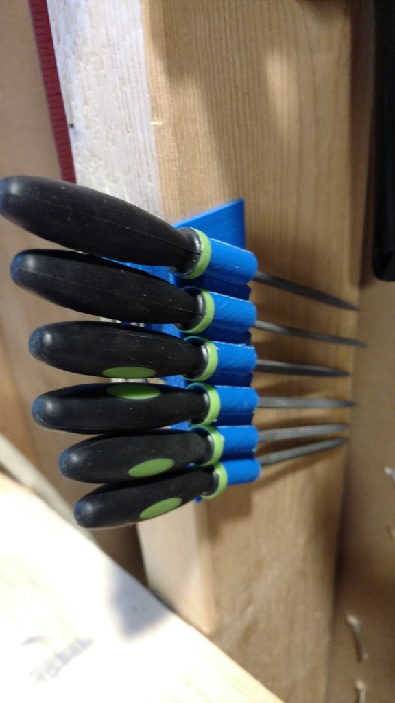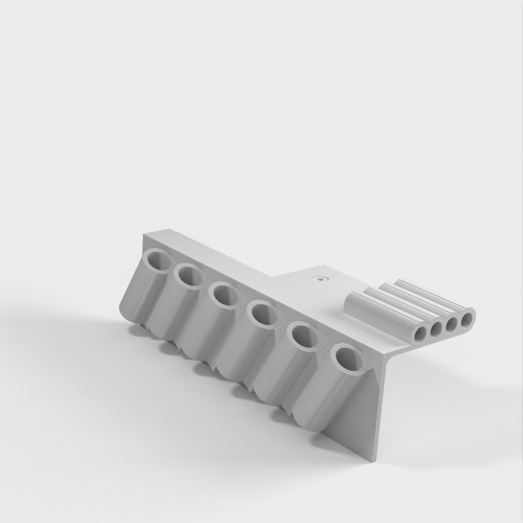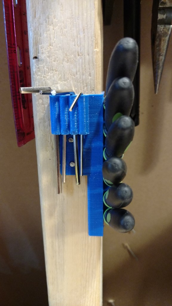 Työkalupidike, joka on suunniteltu 6-osaista neulaviilaa (kuten nämä: http://a.co/iLnJ8kb) tai vastaavia työkaluja varten, sekä 4 kuusiokoloavainta/ kuusiokoloavainta/avainta, kuten Anet A8 3D-tulostimen mukana tulevat. Kuusi aukkoa on kulmattu ja sijoitettu erilleen toisistaan, jotta työkalukahvat eivät törmäisi toisiinsa. Kaksi upotettua naulanreikää seinätolppaan kiinnittämistä varten.