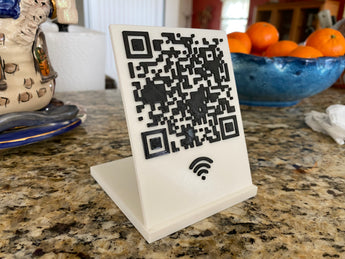 Tämä on yksinkertainen ja tyylikäs WiFi-kyltti jalustalla, jolla voit jakaa WiFi-hotspotisi SSID:n ja salasanan vieraillesi. Useimpien iOS- ja Android-laitteiden pitäisi pystyä tulkitsemaan QR-koodi ja muodostaa yhteyden WiFi-verkkoon ilman manuaalista hotspot-valintaa tai salasanan manuaalista syöttämistä.