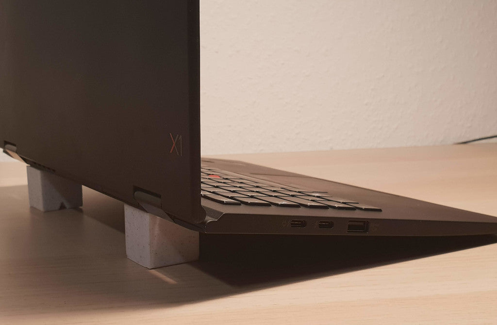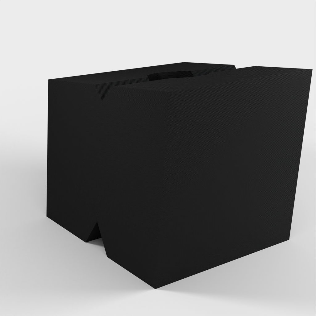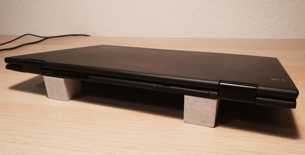 Tämä on yksinkertainen universaali kannettavan tietokoneen pidike, joka tarjoaa 10 asteen kulman kannettavalle tietokoneelle. Useimmille kannettaville tietokoneille riittää kaksi tällaista, jotta ne saavat hyvän tuen. Koko on kuutio, jonka sivun pituus on 30 mm, ja korkeus riittää noin 20 cm:n etäisyydelle kannettavan tietokoneen alusta.