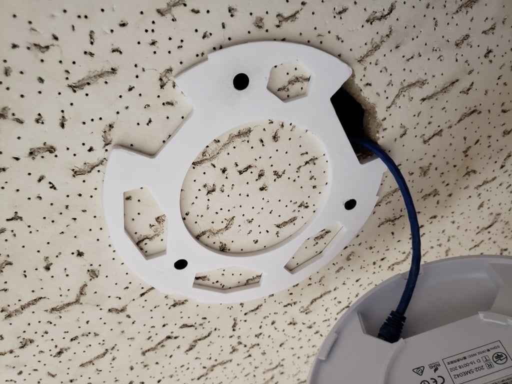 Tämä on asennuslevy Ubiquiti Unifi UAP AC Pro:lle. Se sisältää ruuvikiinnitysreiät ja joitain leikkauksia. Tämän levyn avulla Ubiquiti Unifi UAP AC Pro on helppo kiinnittää haluttuun pintaan.