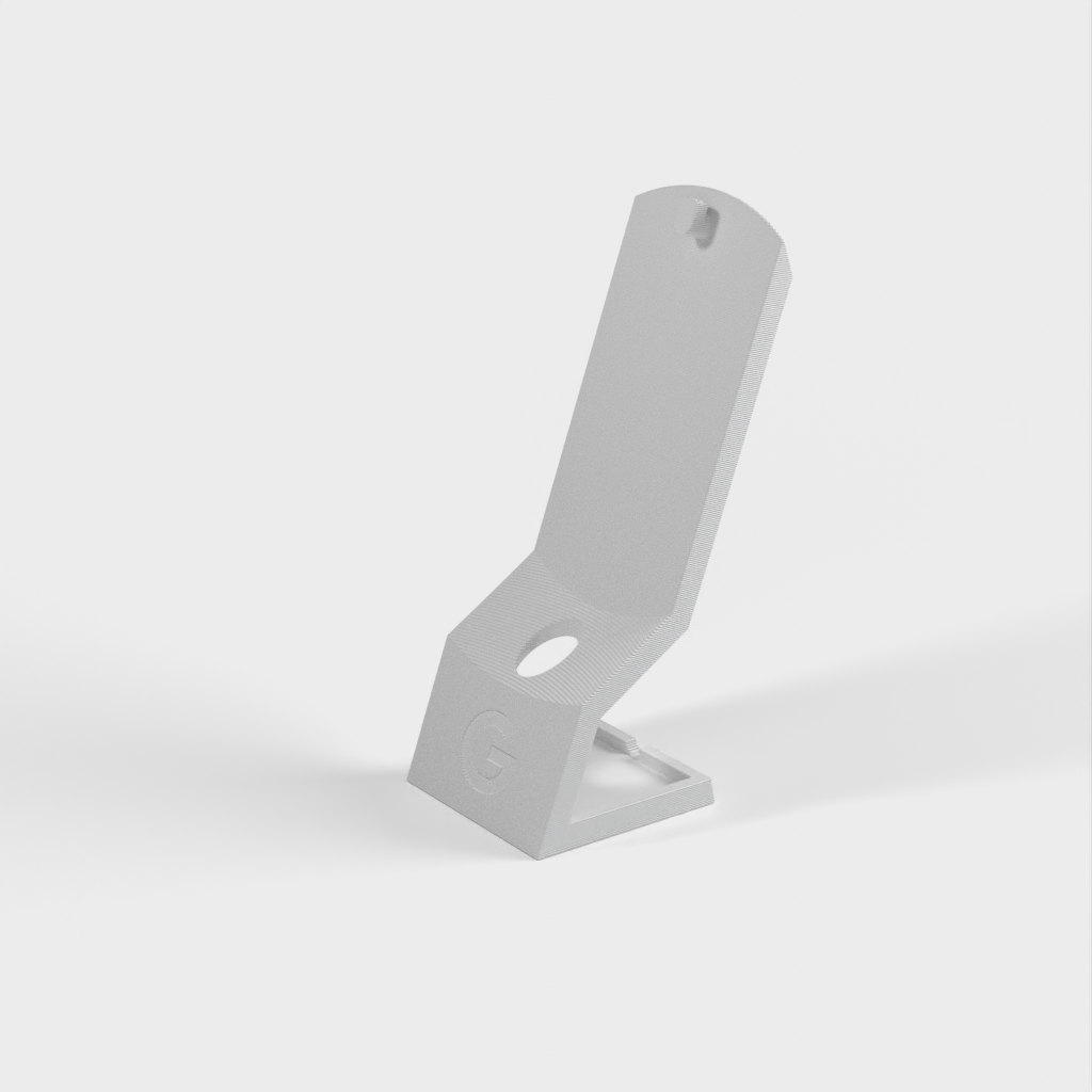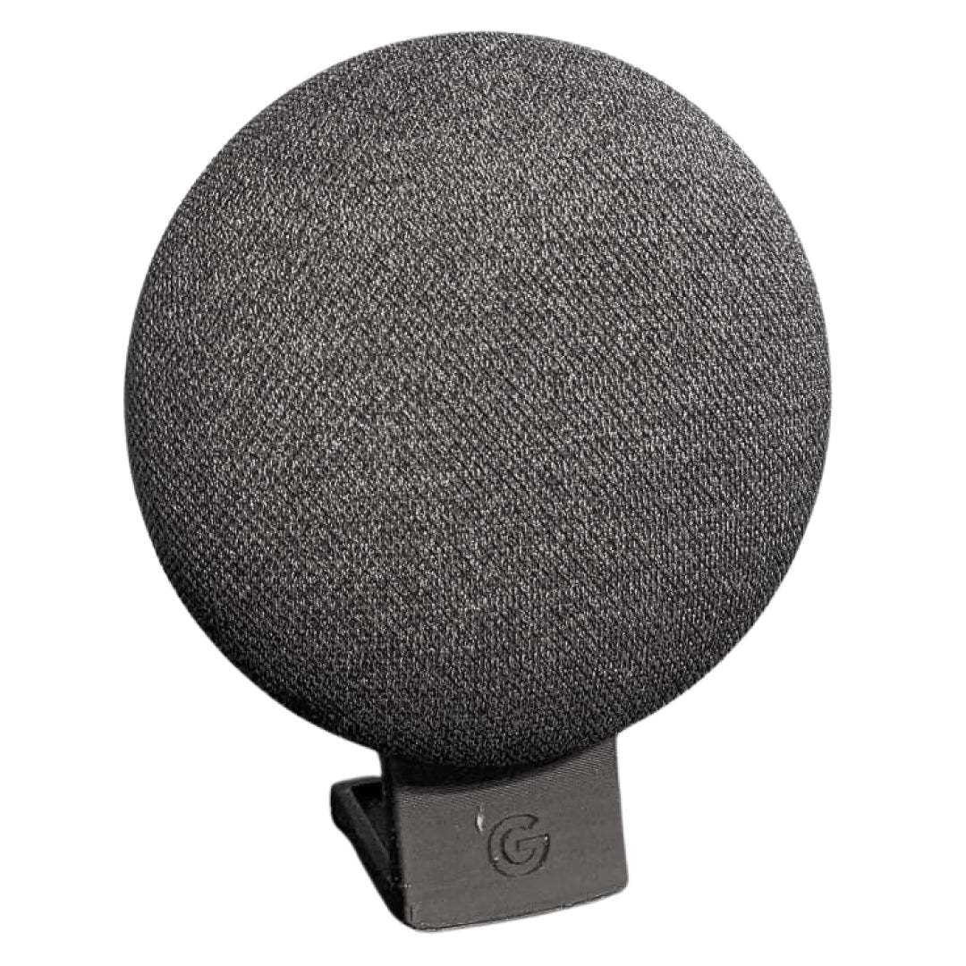 Minimalistinen jalusta, joka asettaa Google Nest Mini 2. sukupolven pystyasentoon työpöydälle tai hyllylle.