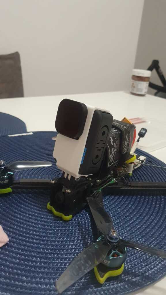 Tämä on pystysuora kiinnike GoPro Hero 9, 10 ja 11 -kameroille. Kiinnike on tukeva ja kiinteä, ja kamera on pidetty etäällä kehyksestä, jotta potkurin lavat eivät näy. Lisäksi se mahdollistaa ND-suodattimien käytön. Täydellinen FPV-droonillesi.