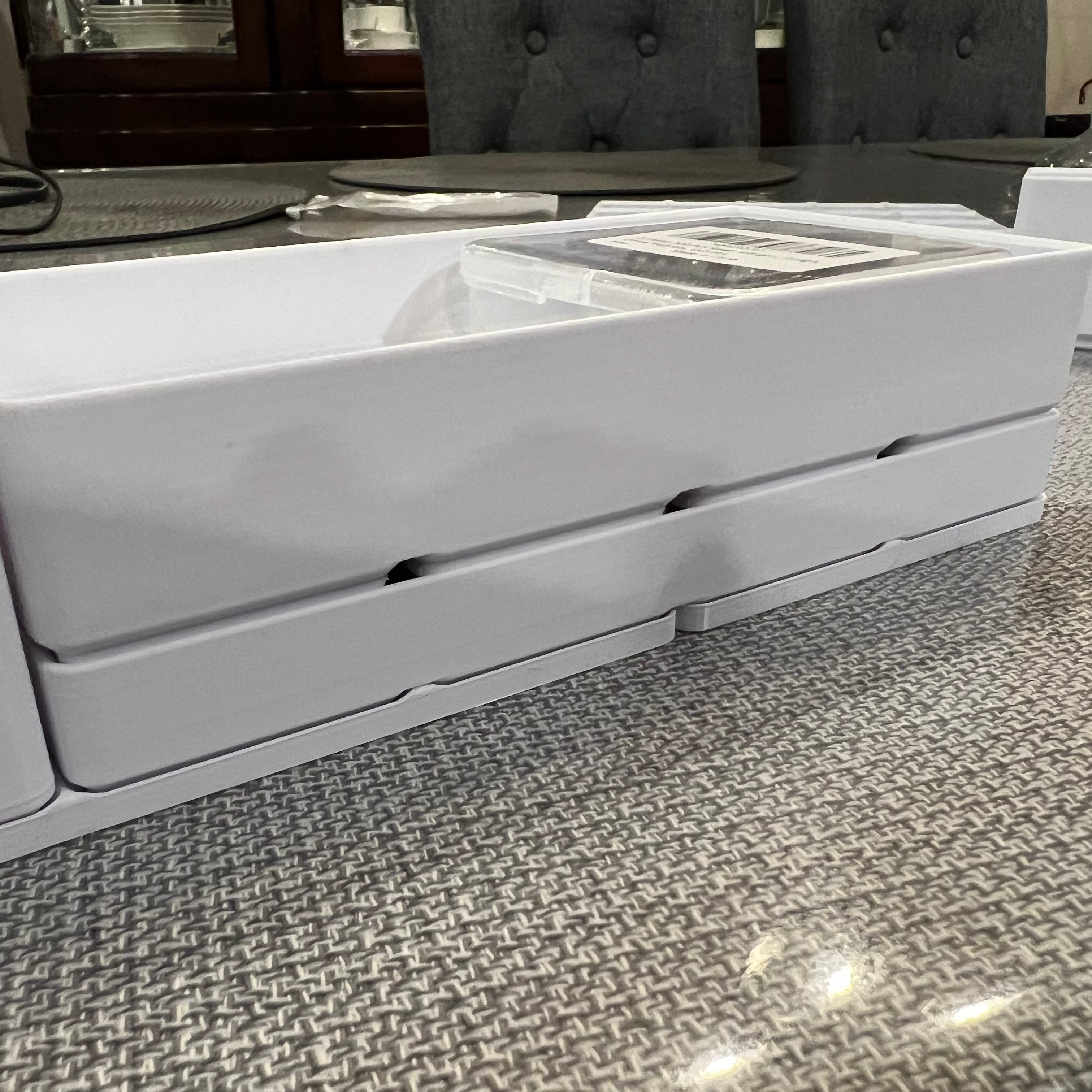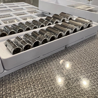 Tämä järjestäjä on suunniteltu pitämään 1/4 tuuman hylsyavaimia Harbor Freight -sarjasta ja tarjoaa jäsennellyn säilytysratkaisun. Se on yhteensopiva Gridfinity-järjestelmän kanssa, mikä mahdollistaa järjestetyn ja modulaarisen asennuksen työkalulaatikkoosi tai -laatikkoosi. Pidike on valmistettu tarkkojen mittojen mukaan, mikä varmistaa, että SAE- ja metriset hylsyavaimesi pysyvät turvallisesti paikoillaan pyörimättä, mutta ovat silti helposti irrotettavissa. Tämän moduulin syvyys on optimoitu, joten voit sijoittaa päälle muita Gridfinity-säilytysratkaisuja, mikä maksimoi 1x4-tilankäyttösi. Se tukee laajaa valikoimaa hylsykokoja, mukaan lukien yleisimmät SAE- (3/16" - 9/16") ja metriset (5 mm - 14 mm) mitat.