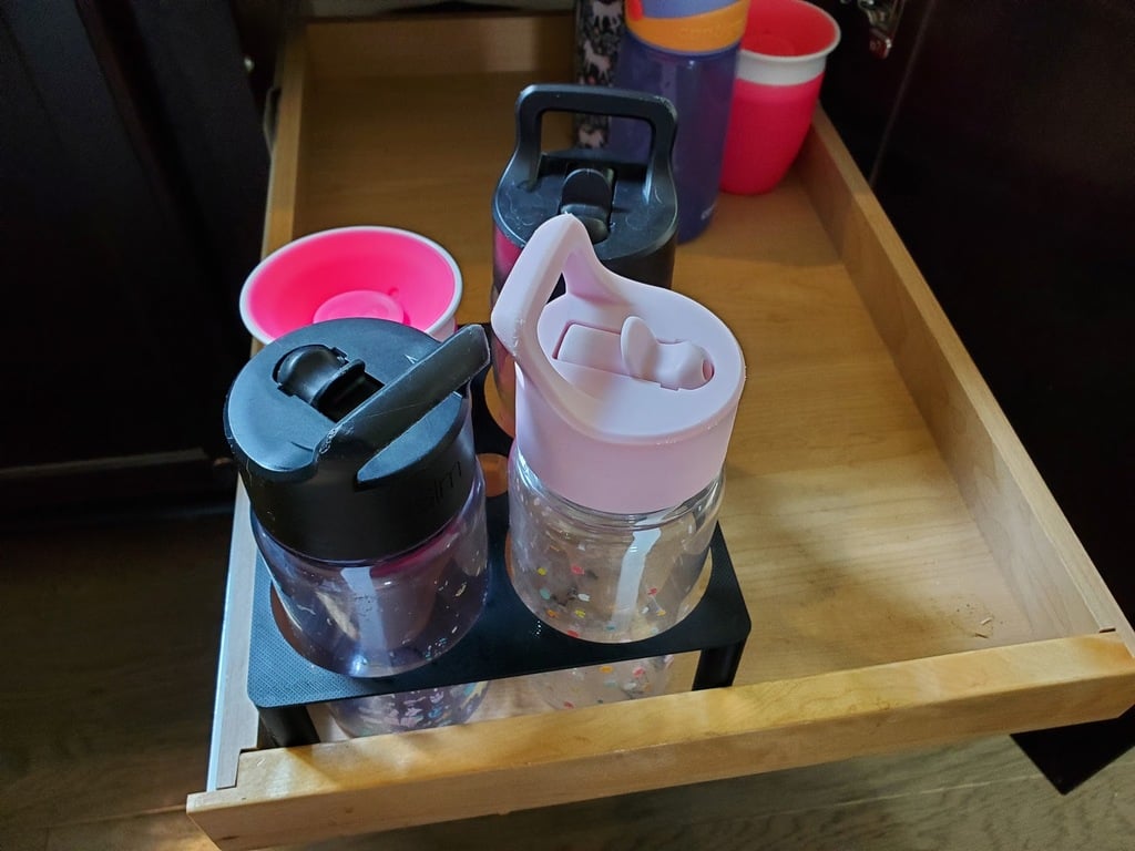 Pidä lasten vesipulloista huolta tällä käytännöllisellä vesipullotelineellä, joka on suunniteltu luomaan järjestystä laatikoihin ja kaappeihin. Tähän järjestäjään mahtuu jopa neljä pulloa, ja sen tukeva rakenne varmistaa, että ne seisovat vakaasti eivätkä pyöri ympäriinsä, vaikka laatikko vedetään nopeasti ulos. Halkaisijaltaan 80 mm:n ympyrän ansiosta pidike on yhteensopiva monien suosittujen lastenpullojen kanssa, mukaan lukien Contigo ja Simple Modern, mikä tekee siitä monipuolisen ratkaisun useimpiin kotitalouksiin. Se on yhtä käytännöllinen pulloille, jotka on otettava mukaan lastenvaunuihin matkalle, kuin niille, joita käytetään kotona. Tämä älykäs säilytysratkaisu poistaa sotkun ja tekee pulloista helposti saatavilla, joten sinun ei tarvitse suorittaa laajaa "kilpailijoiden hakua" löytääksesi ihanteellisen järjestäjän. Jos sinulla on suurempi määrä pulloja, useita yksiköitä voidaan helposti sijoittaa vierekkäin säilytyskapasiteetin laajentamiseksi. Ihanteellinen lisä hyvin järjestettyyn keittiöön tai lastenhuoneeseen.