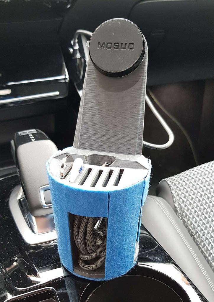 Puhelimen säilytyksen lisäksi suunnittelu sisältää kuusi kolikkolokeroa, joita voidaan käyttää pienten kolikoiden kätevään säilytykseen esimerkiksi pysäköintiä tai tietulleja varten. Tuote on suunniteltu sopimaan tarkasti auton olemassa olevaan mukitelineeseen, ja lisäksi voidaan lisätä huopakangas, jotta istuvuus olisi vieläkin optimaalisempi.