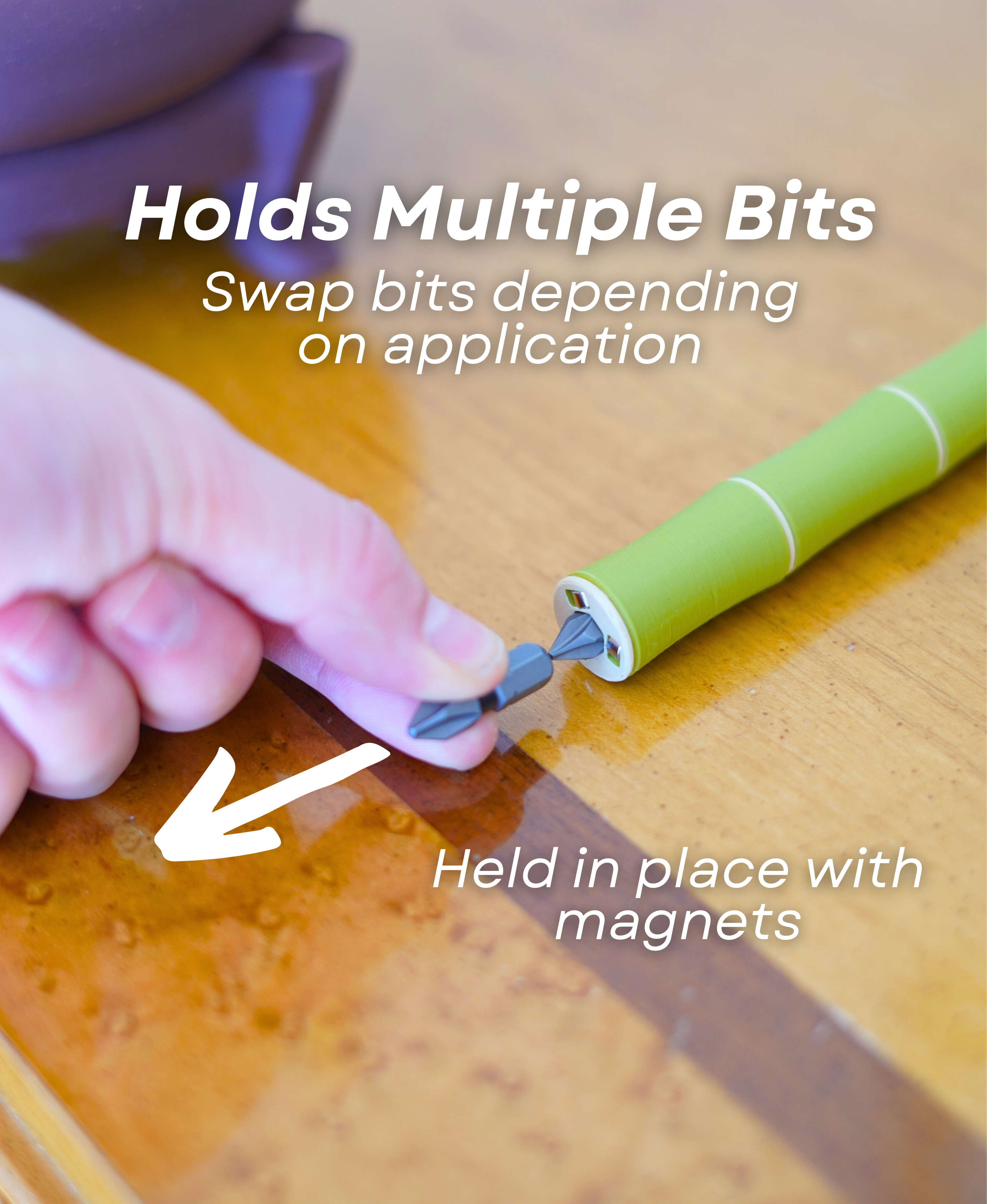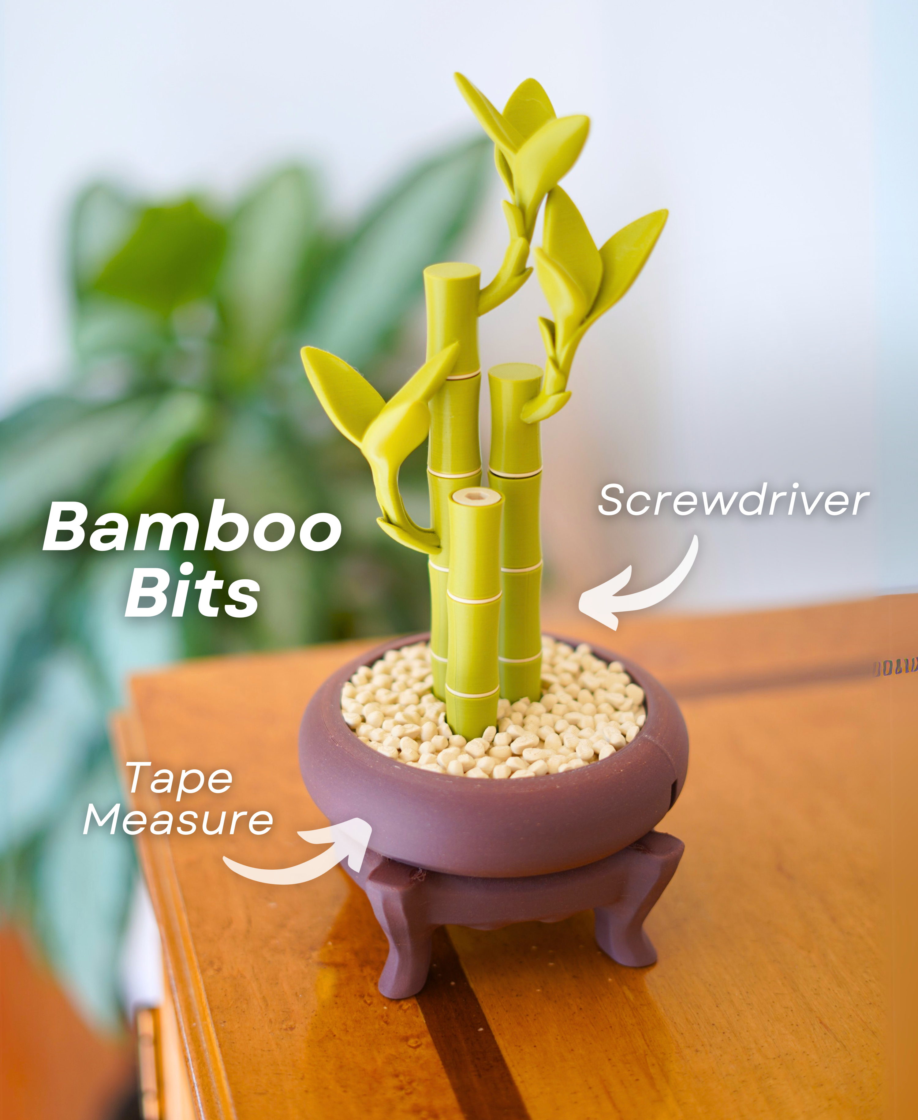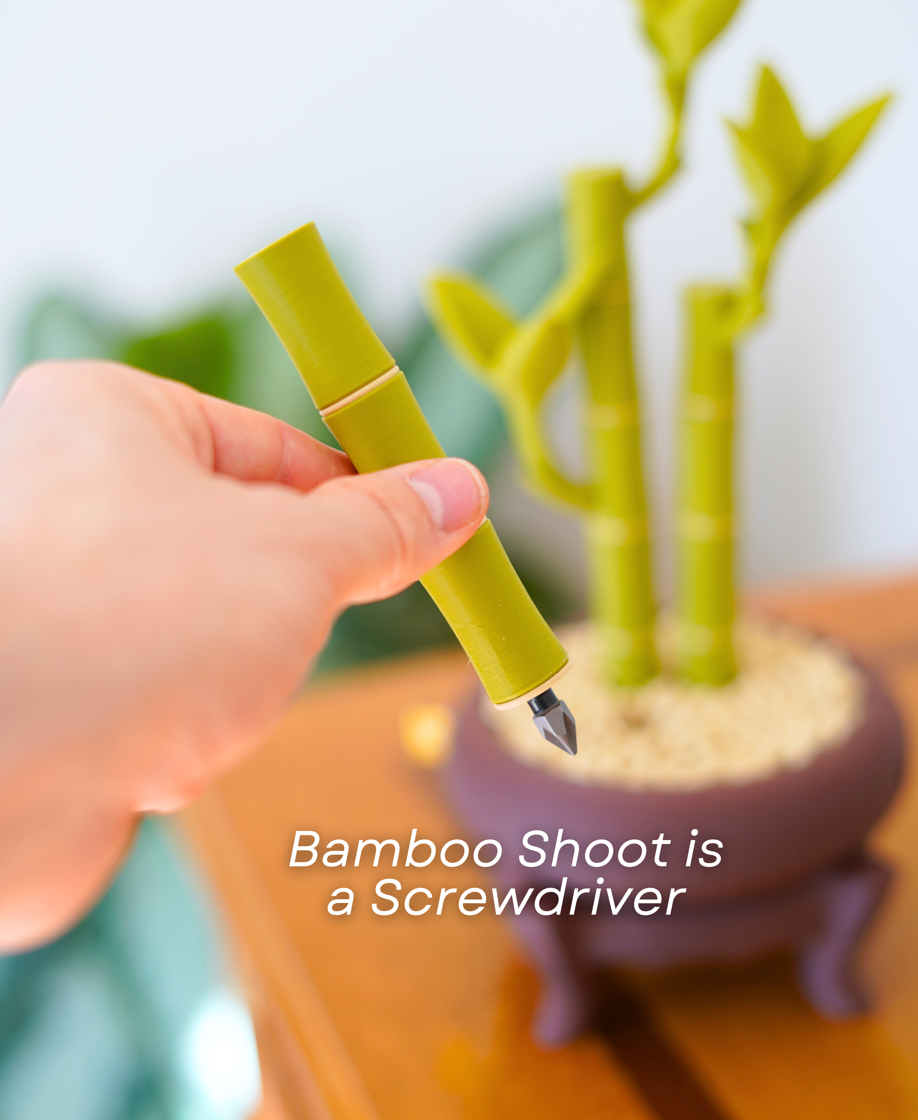 Bamboo Bits -järjestelmän ydin on ruuvimeisseli, joka on tyylikkäästi integroitu yhteen bambunversoista. Tämä toimiva ruuvimeisseli on varustettu magneettisilla paikoilla, joihin mahtuu jopa neljä erilaista ruuvimeisselikärkeä. Se varmistaa, että voit aina vaihtaa nopeasti erityyppisten kärkien, kuten tähti- ja litteäpäisten ruuvimeisselien, välillä ja että oikea työkalu on aina käden ulottuvilla.