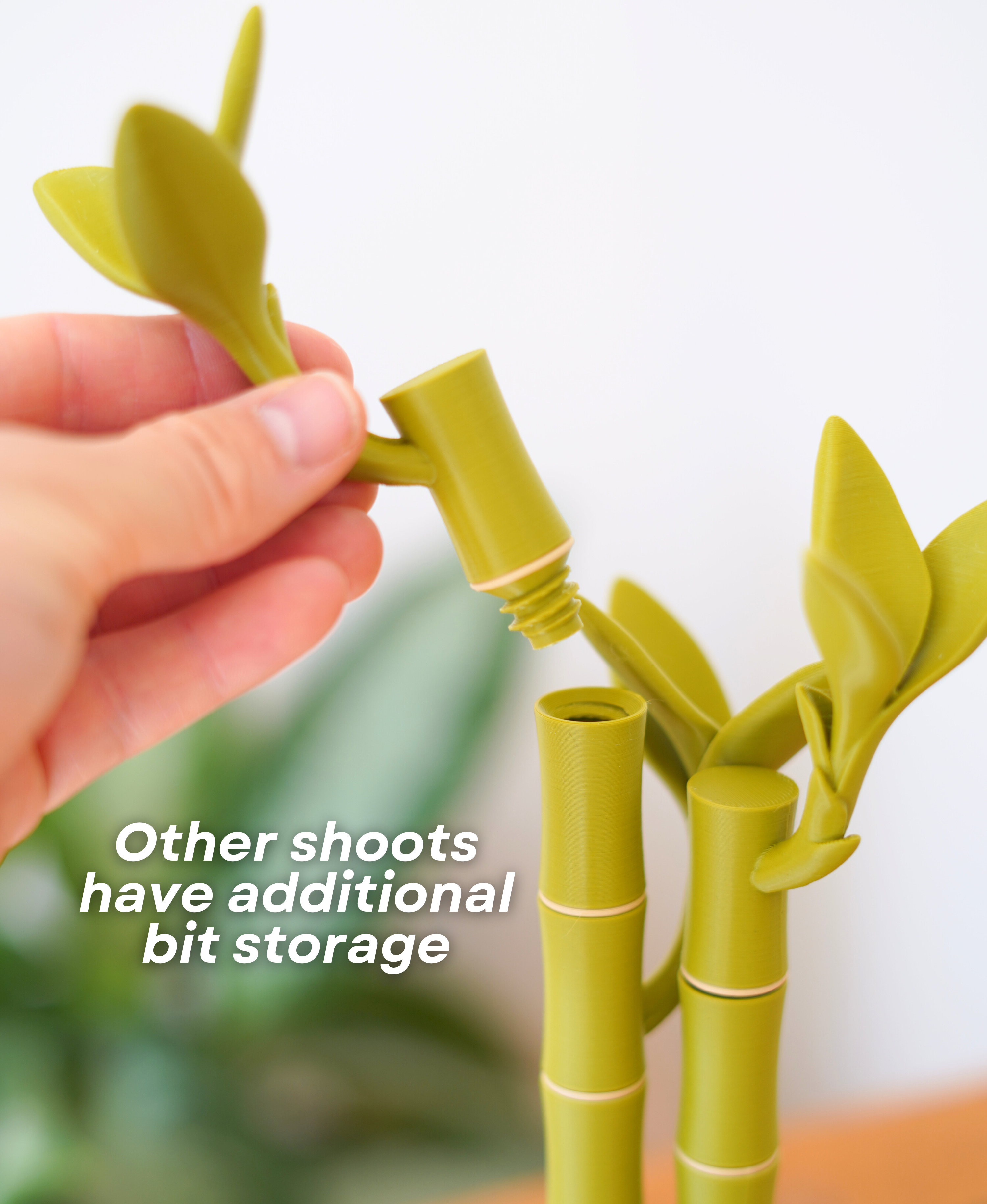 Päätäydennystoimintojen lisäksi Bamboo Bits tarjoaa lisää työkalujen säilytystilaa kahdessa ylimääräisessä bambunversossa. Nämä ovat ihanteellisia erikoistuneiden kärkien, kuten tähti- tai neliökärkien, pitämiseen järjestyksessä, jotta olet valmis kaikkiin tehtäviin. Huolellisesti harkitun bambu-inspiroituneen muotoilunsa ansiosta Bamboo Bits ei ole vain käytännöllinen ratkaisu, vaan myös koristeellinen elementti, joka yhdistää järjestyksen luonnon kauneuteen.