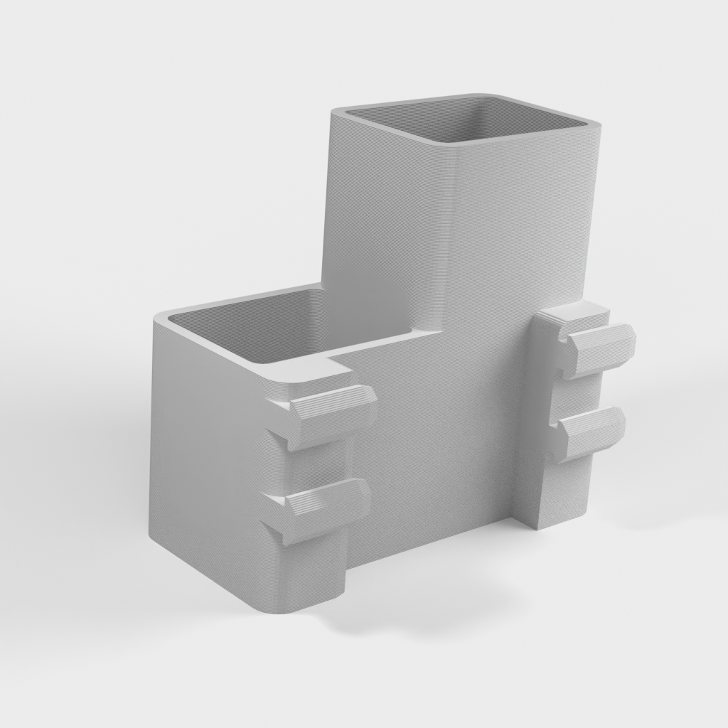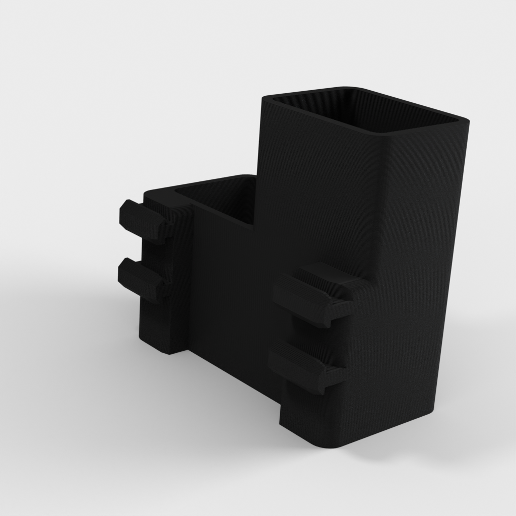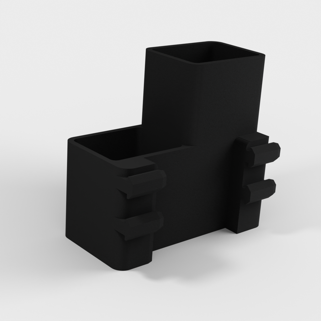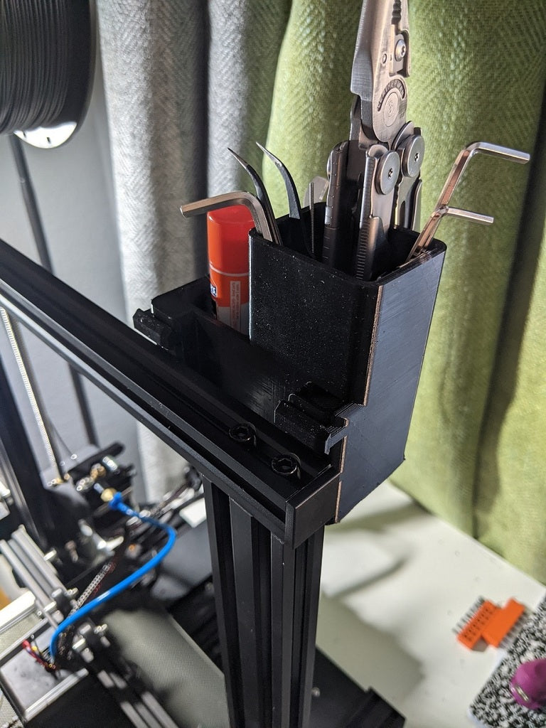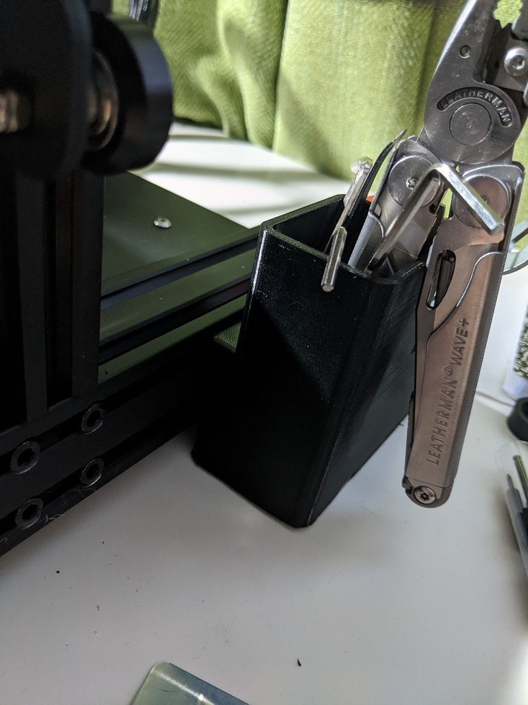 Paranna 3D-tulostinasetuksiasi tällä käytännöllisellä työkalupakilla, joka on suunniteltu erityisesti Ender 3 V2 -mallille. Tämä älykäs säilytysratkaisu sopii täydellisesti tavallisiin alumiiniprofiileihin ja se voidaan helposti asentaa tulostimen rungon sivulle tai päälle. Se tarjoaa runsaasti tilaa olennaisten työkalujen, kuten Leatherman Wave+ -mallin ja muiden pienten lisävarusteiden säilyttämiseen, joten sinulla on ne aina käden ulottuvilla. Työkalupakki auttaa pitämään työtilasi järjestyksessä ja tehokkaana, mikä optimoi työnkulkuasi. Parhaan kestävyyden saavuttamiseksi se voidaan valmistaa edullisesti PETG:stä.