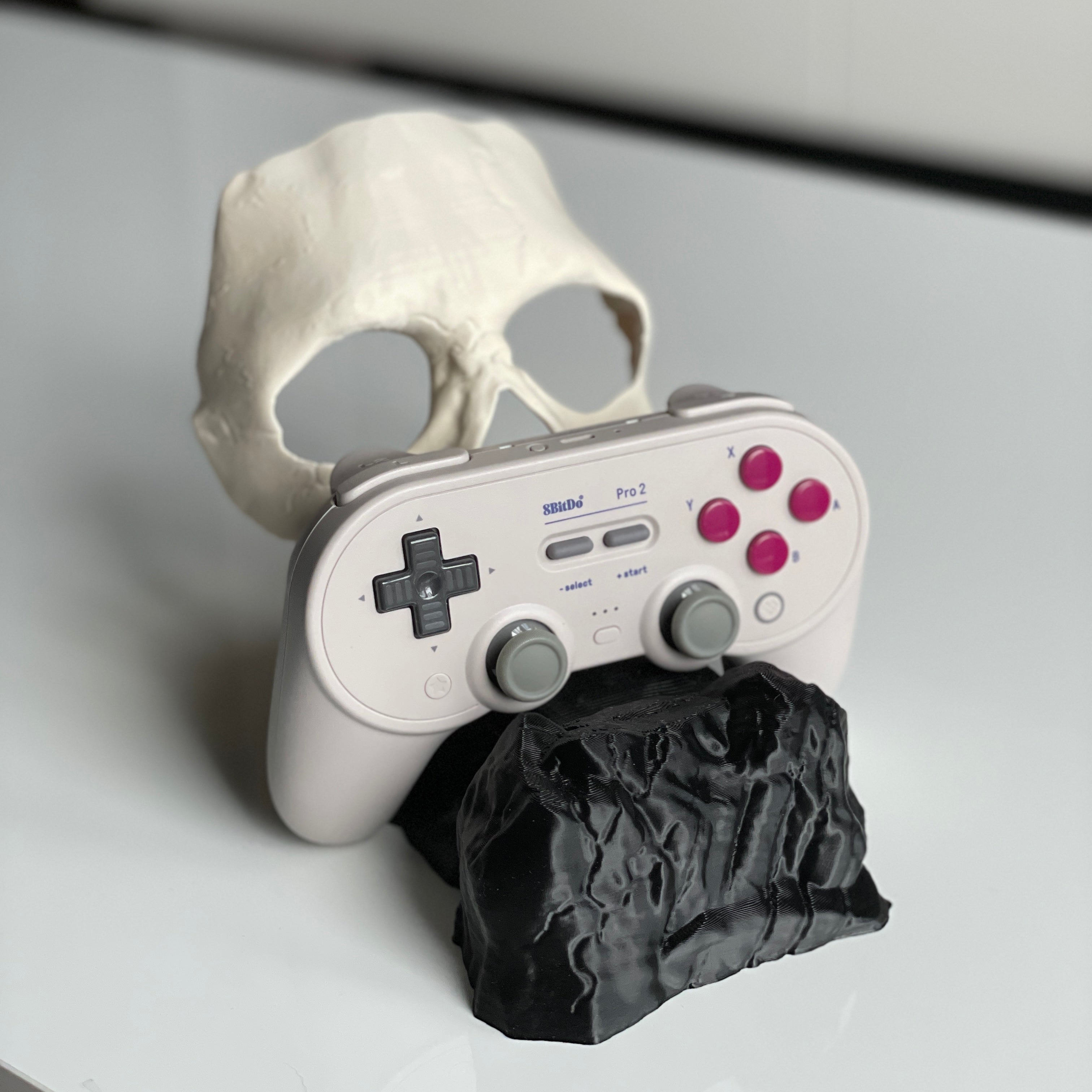 - Ohjain lepää kivimäisellä jalustalla ja nojaa Ghost-naamioon dramaattisen ulkonäön saavuttamiseksi.