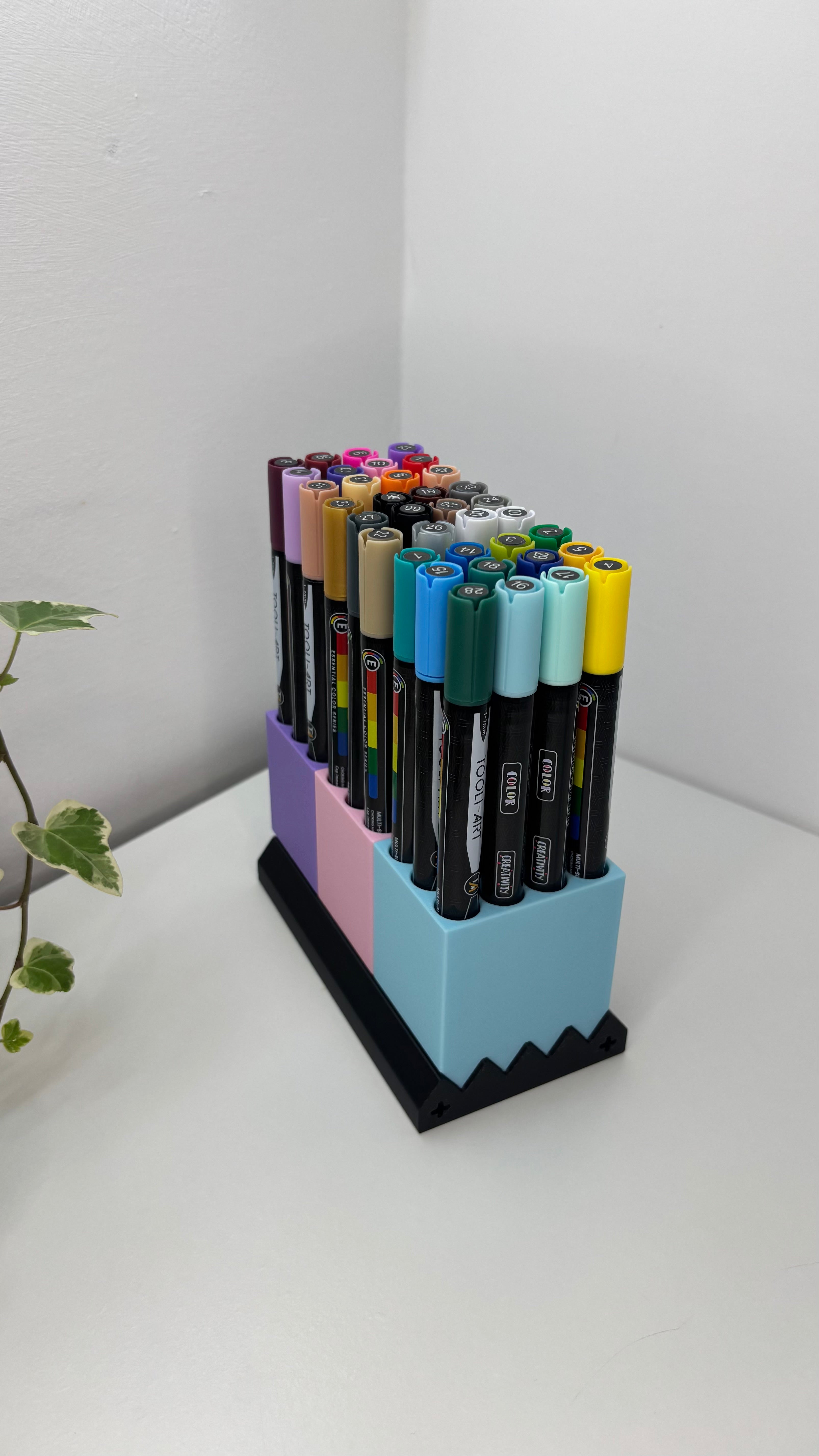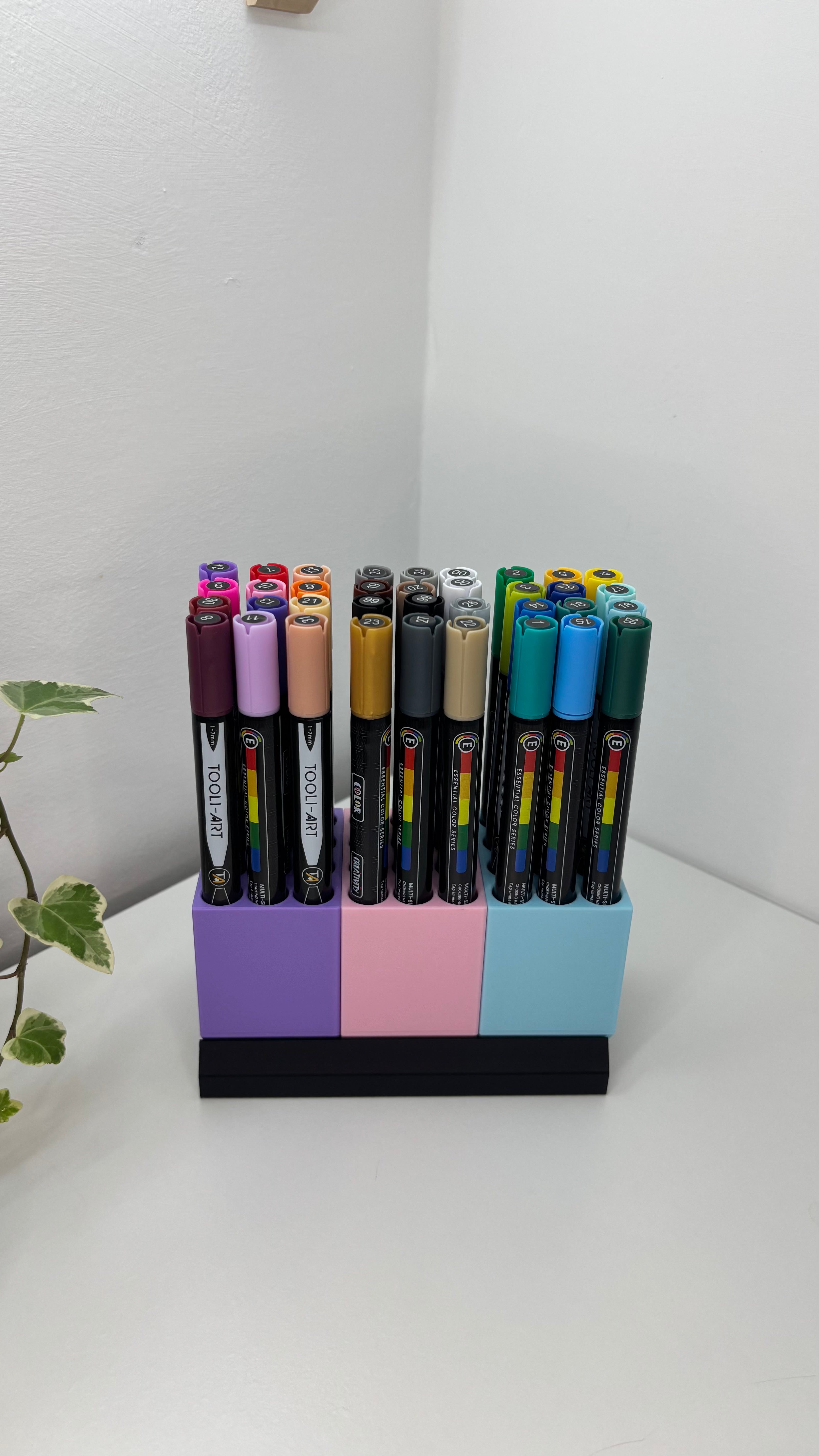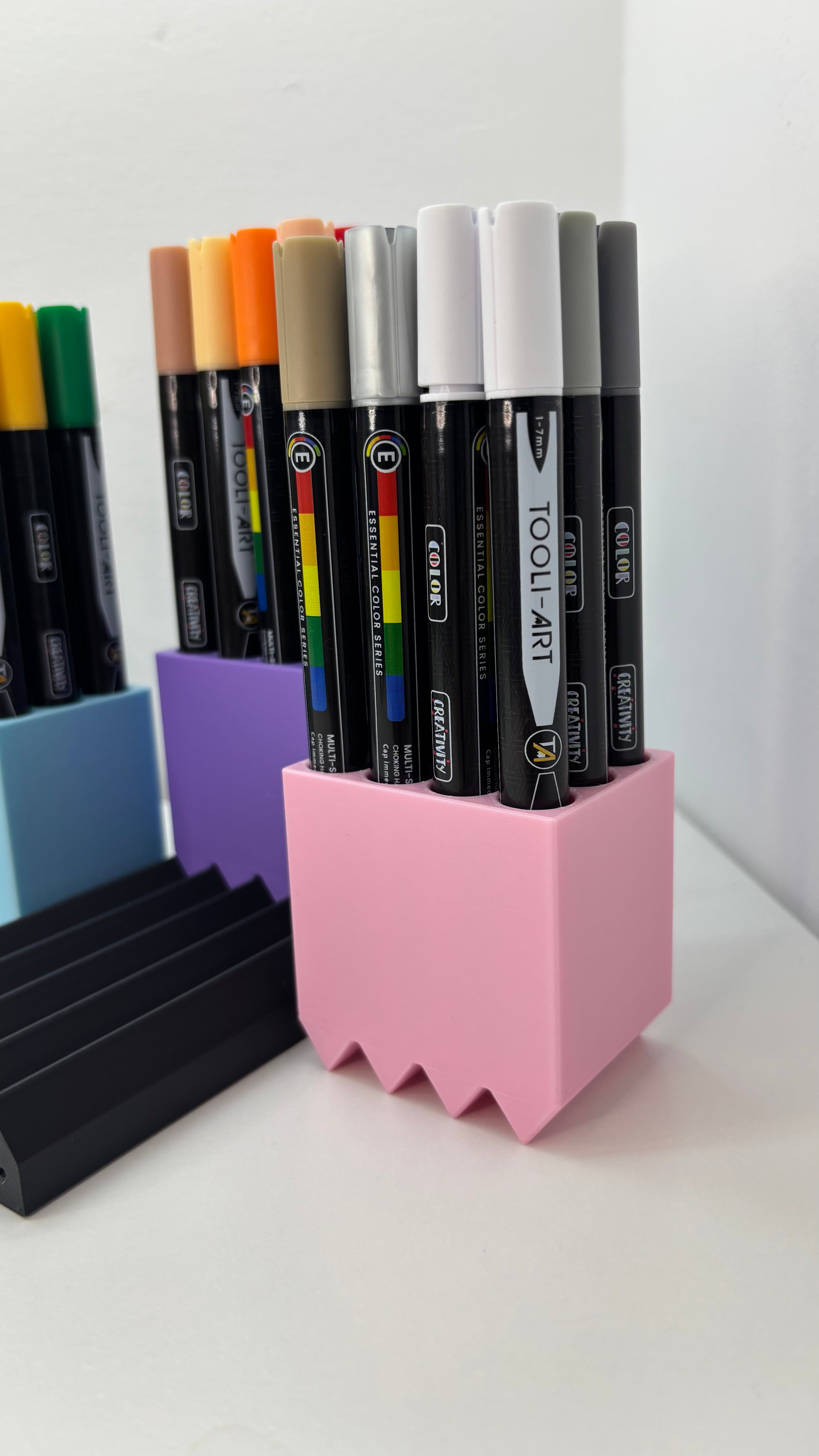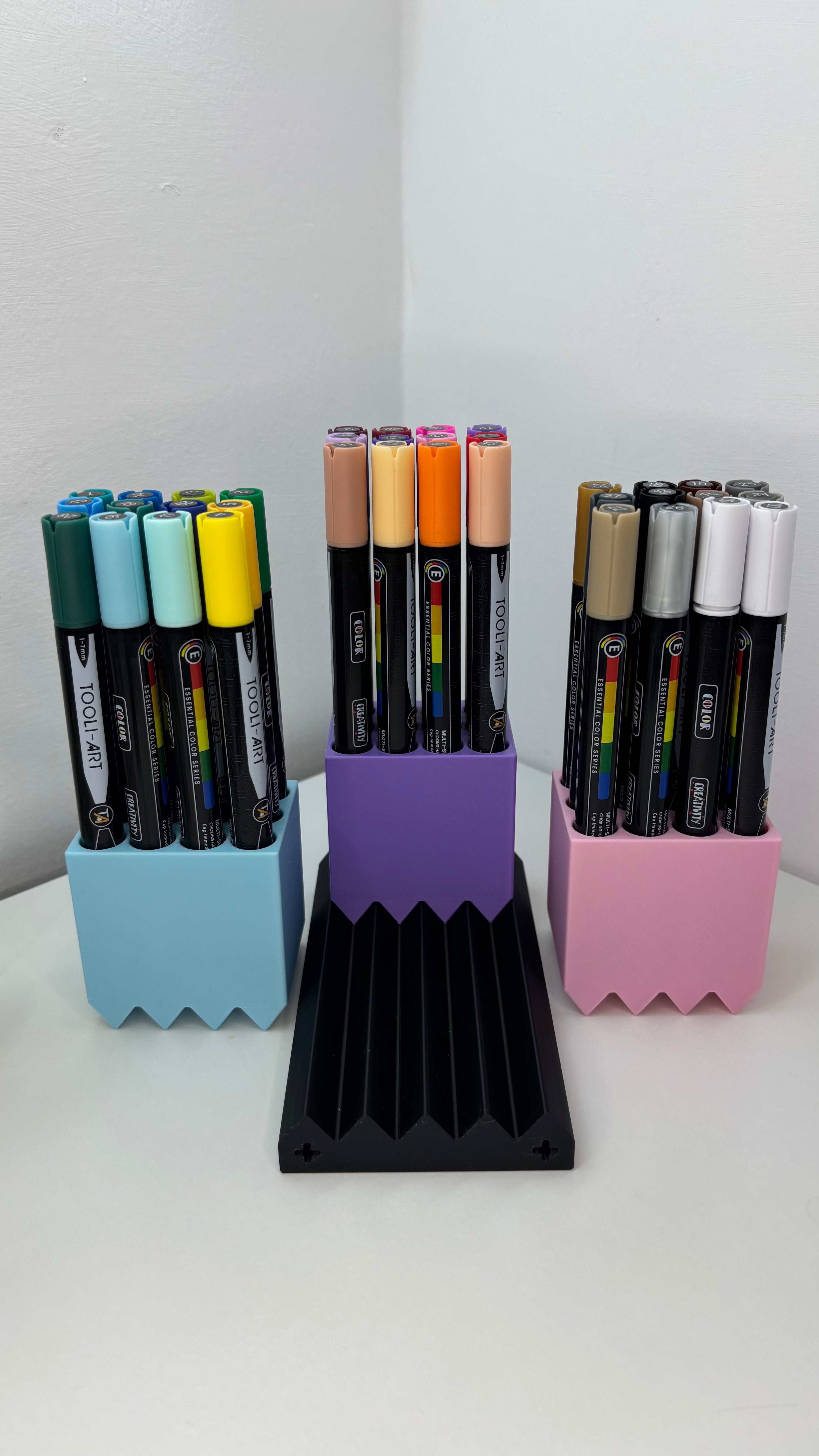 Jokaisessa kynätelineessä on tilaa 12 kynälle tai tussille, ja pohjaan mahtuu jopa kolme telinettä, mikä tarjoaa yhteisen kynien säilytysratkaisun jopa 36 kirjoitustarvikkeelle. Muokattavissa oleva kynäteline ja skaalautuva muotoilu tekevät siitä monipuolisen toimistojärjestäjän ja olennaisen työpöytätarvikkeen mihin tahansa kotitoimistoon, taideasemalle tai luovaan ympäristöön. Se toimii modernina työpöytäjärjestäjänä, joka edistää siistiä ja toimivaa työtilaa, joka on ihanteellinen taiteilijoille, opiskelijoille ja ammattilaisille, jotka etsivät modulaarista säilytysratkaisua.