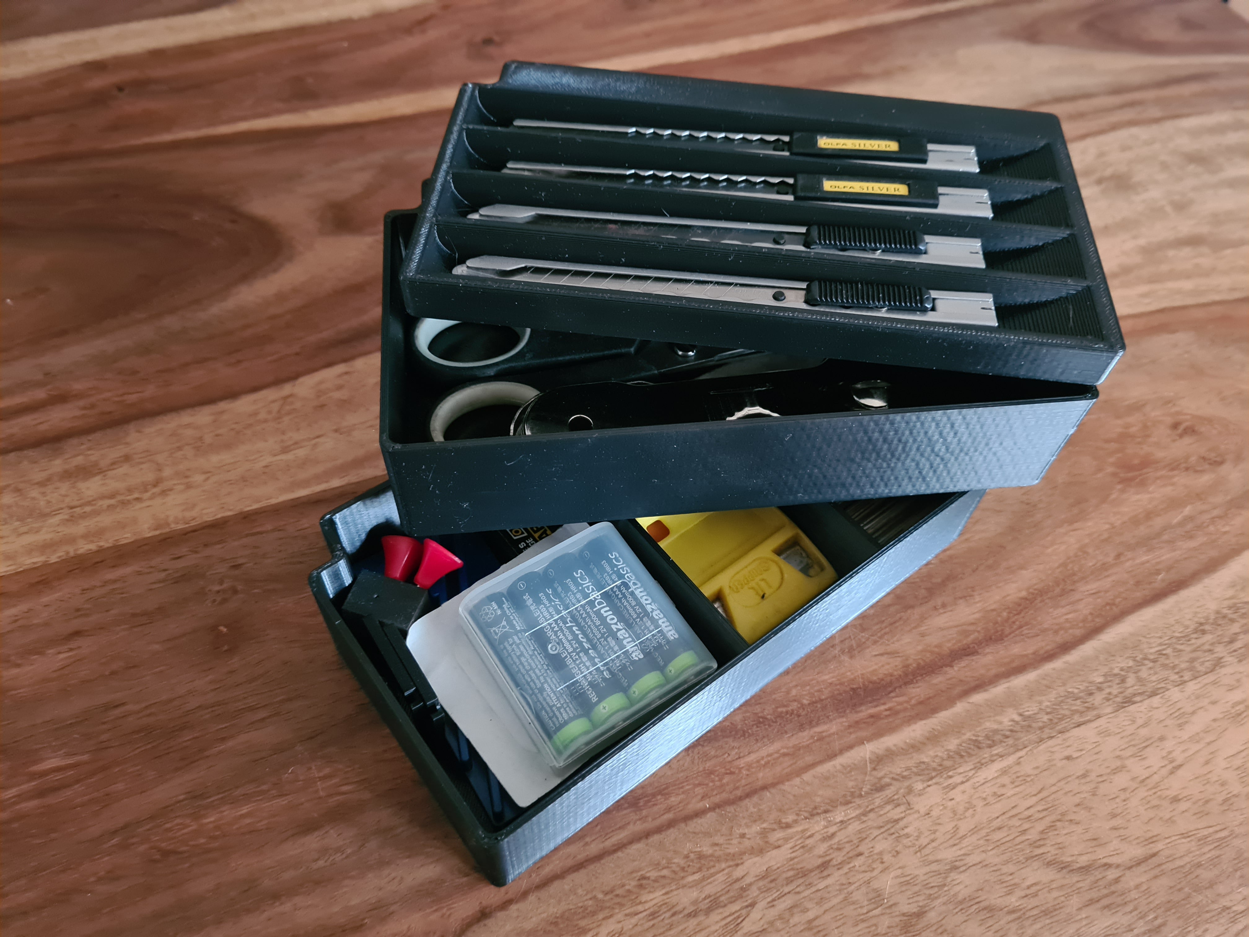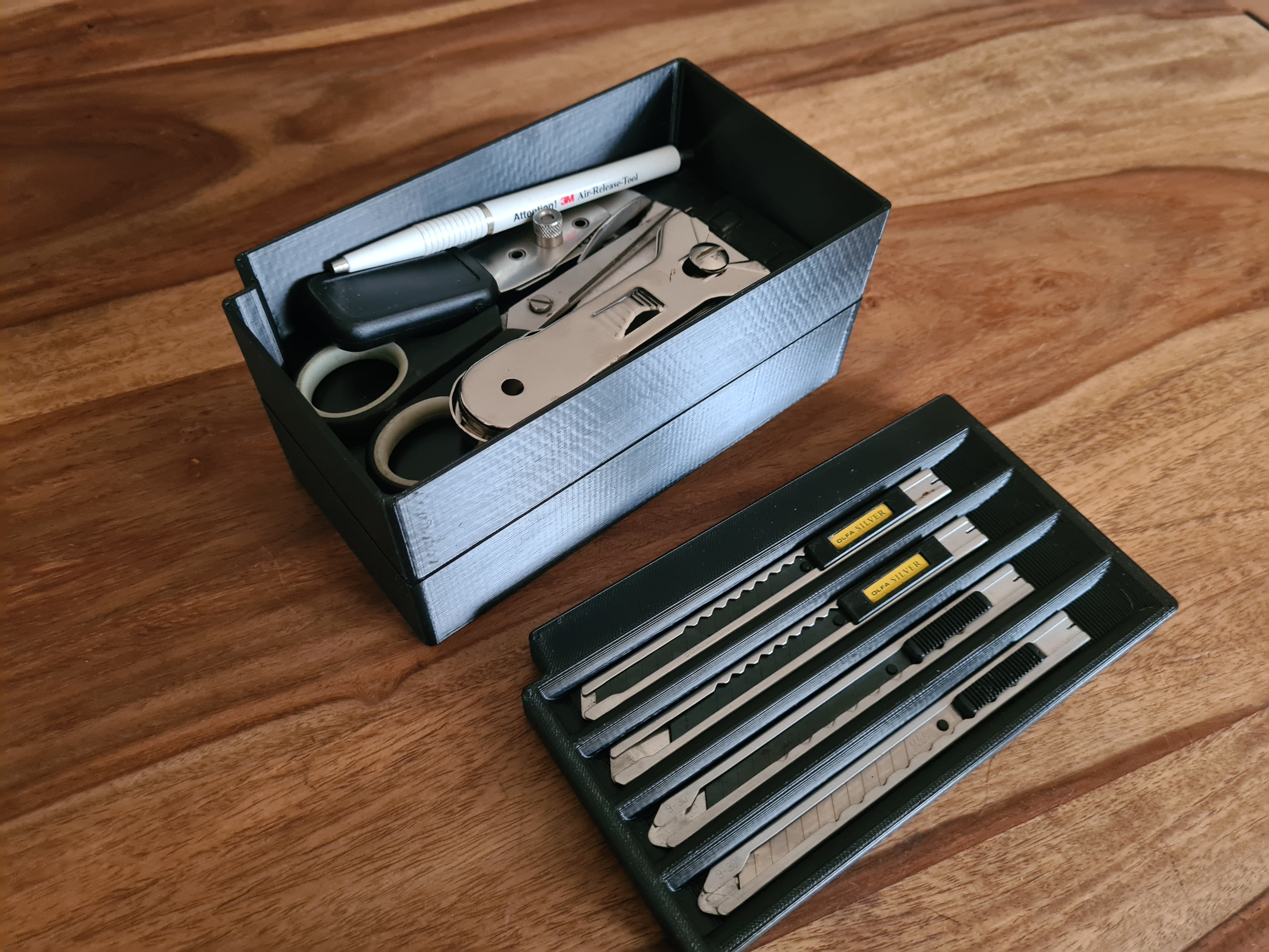 Laatikko on jaettu käytännöllisiin lokeroihin, joista yksi on varattu katkoteräveitsellesi nopeaa ja turvallista pääsyä varten. Lisäksi se sisältää kaksi lisäsäilytystilaa, jotka ovat ihanteellisia varausterien, partaterien, pienten paristojen tai muiden vastaavien kulutustarvikkeiden järjestämiseen. Alempiin modulaarisiin laatikoihin mahtuu muita erikoistyökaluja, mikä edistää siistiä ja tehokasta työtilaa.
