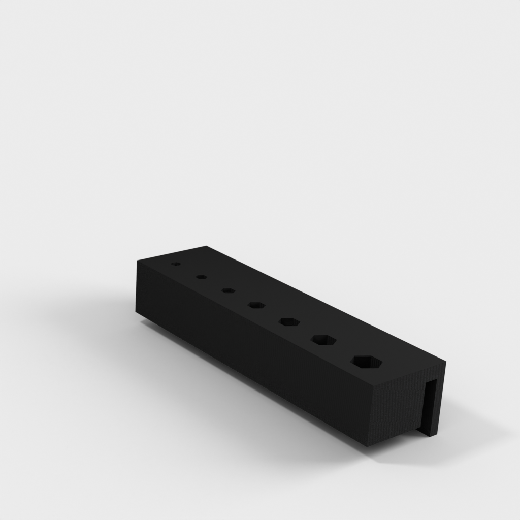 Tämä pidike on suunniteltu säilyttämään tehokkaasti T-kahvalliset kuusiokoloavaimet ja se on helppo asentaa työkalupakin sivulle. Tarkoituksena on pitää työkalut järjestyksessä ja helposti saatavilla, mikä helpottaa oikean kuusiokoloavaimen löytämistä nopeasti työskentelyn aikana. Pidike varmistaa, että kuusiokoloavaimet ovat suojassa kulumiselta ja minimoi niiden katoamisriskin, kun niitä ei käytetä. Se tarjoaa käytännöllisen ja tilaa säästävän ratkaisun sekä ammattilaisille että harrastajille, jotka haluavat pitää työkalupakkansa järjestyksessä.